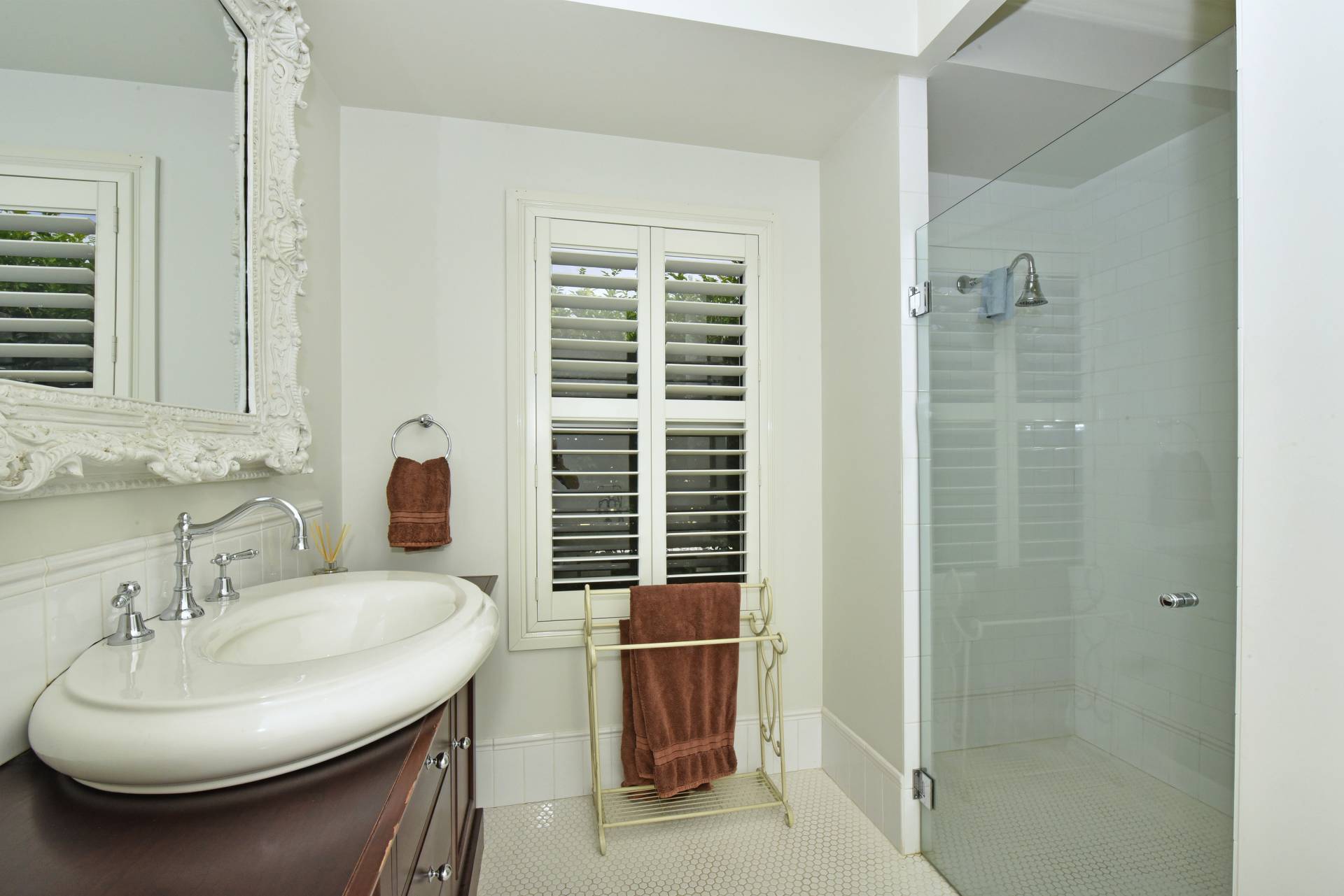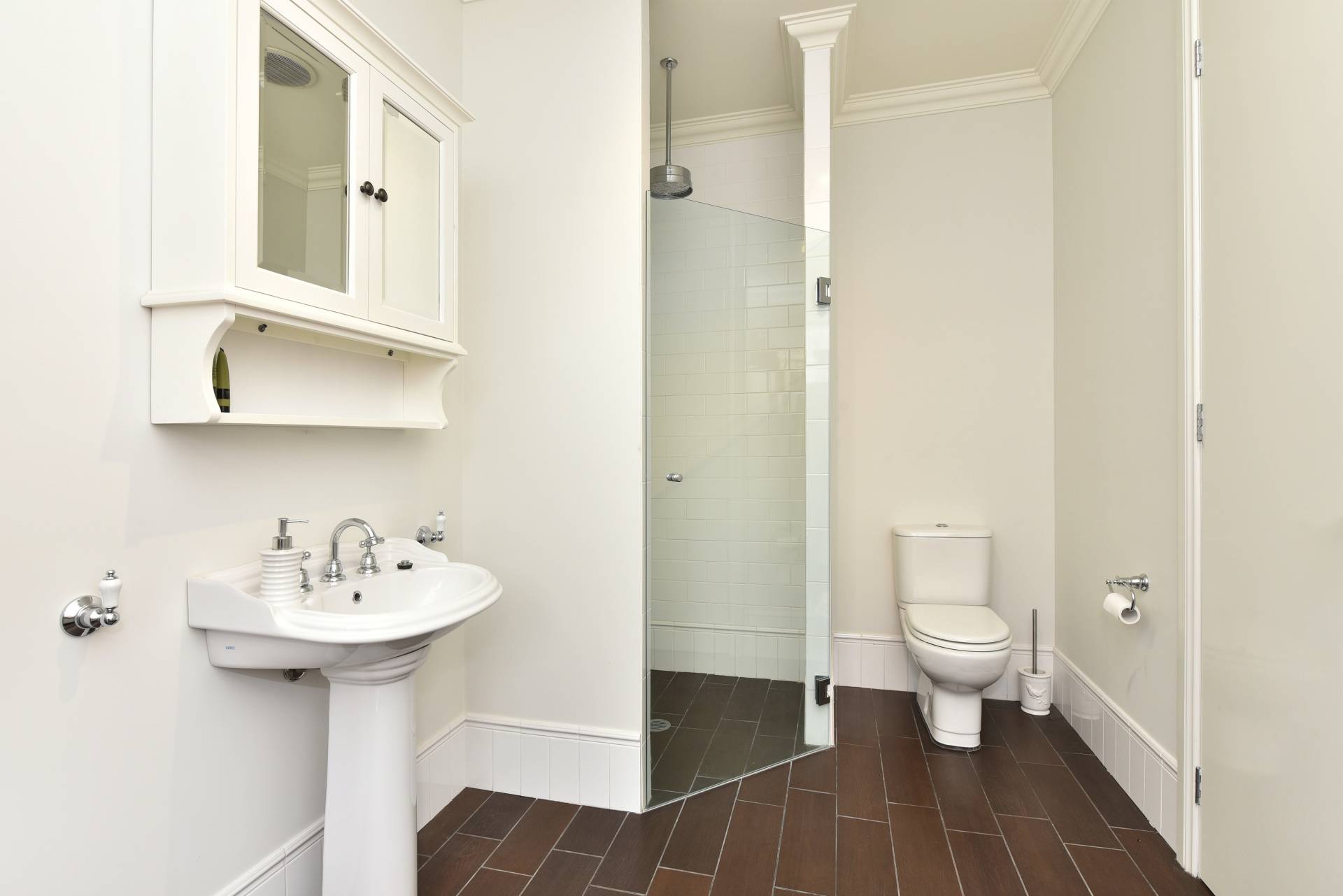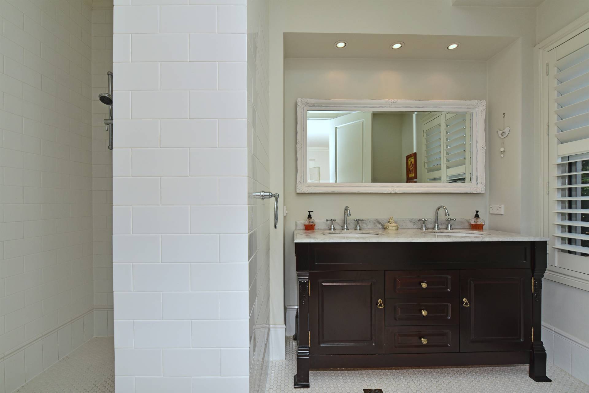 • Main bathroom with double shower, large bath tub, toilet & timber vanity