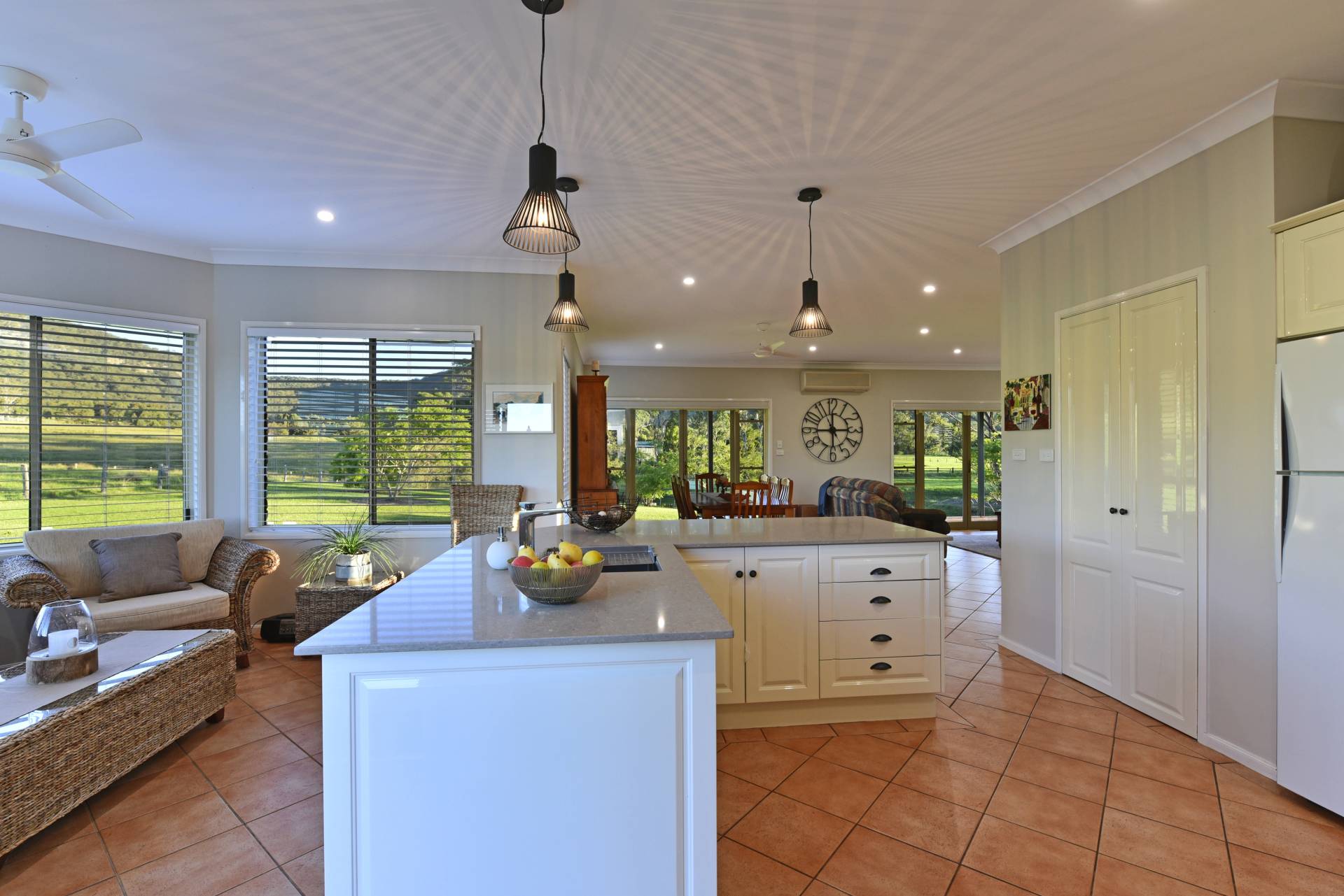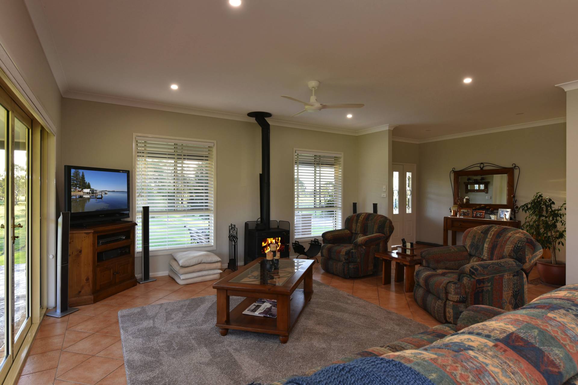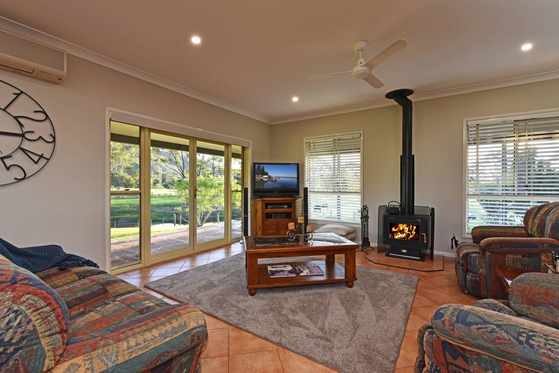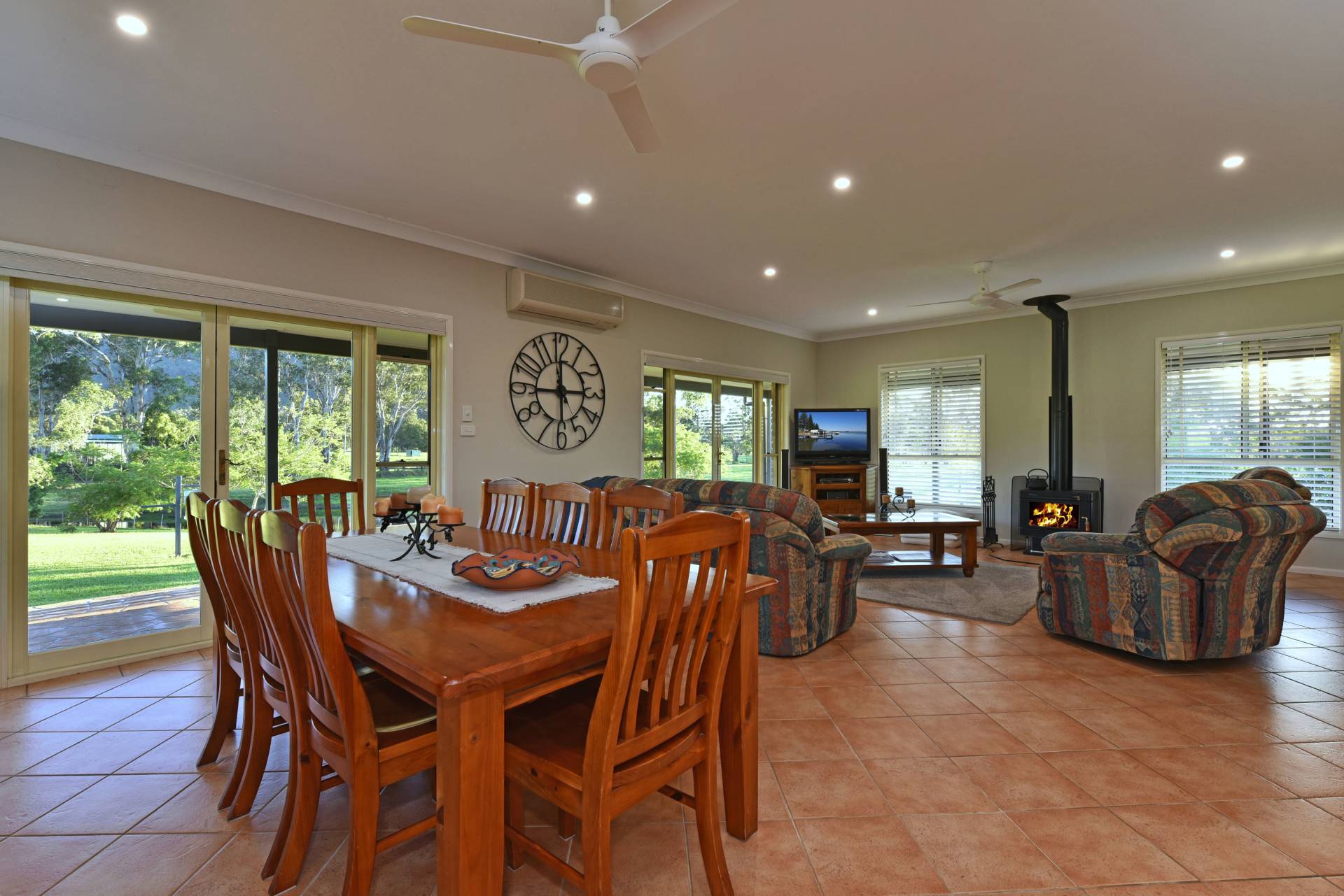 High ceilings, practical tiled floors, reverse cycle air conditioning and a warming slow combustion fire place all give you the comforts of home.