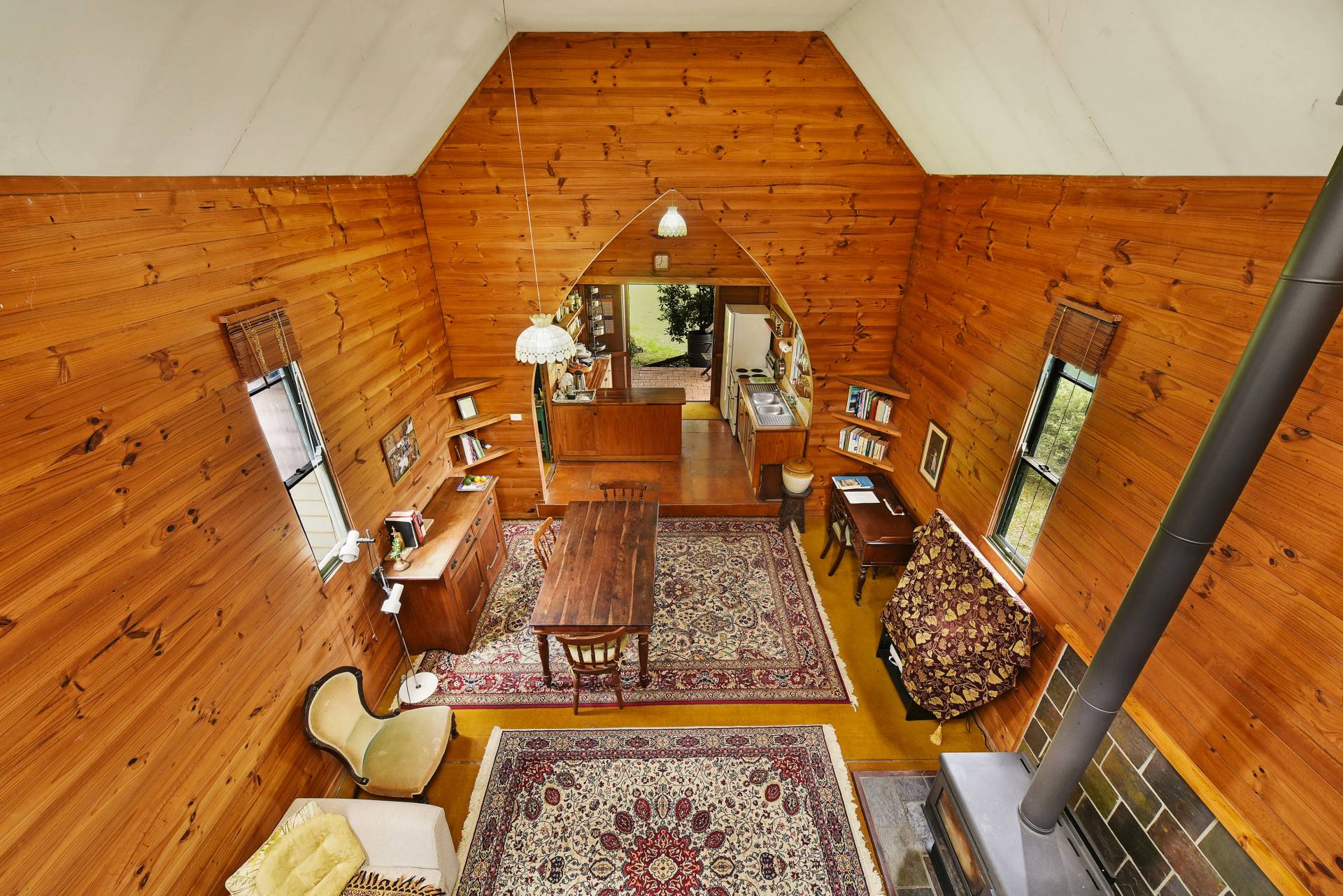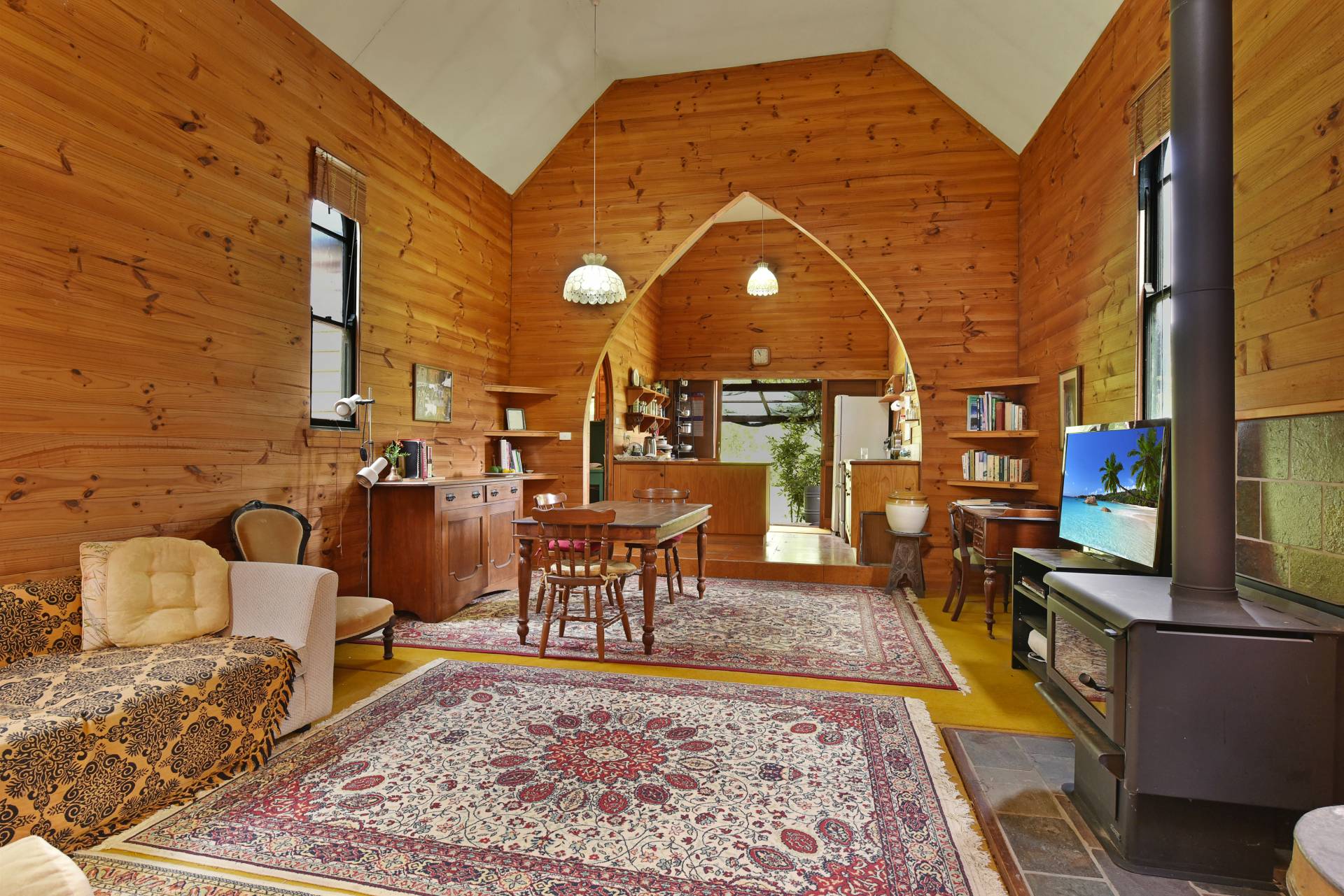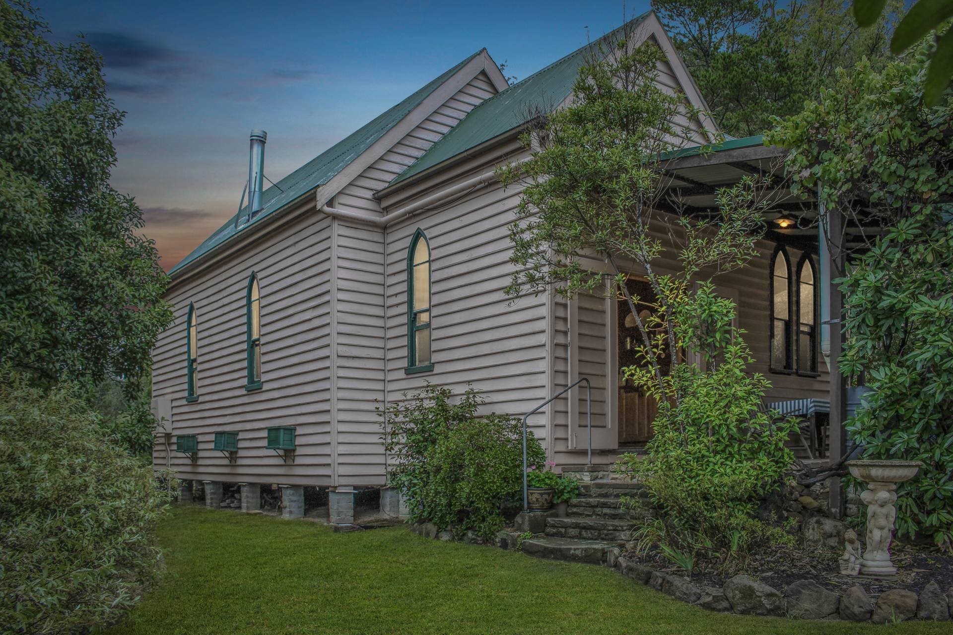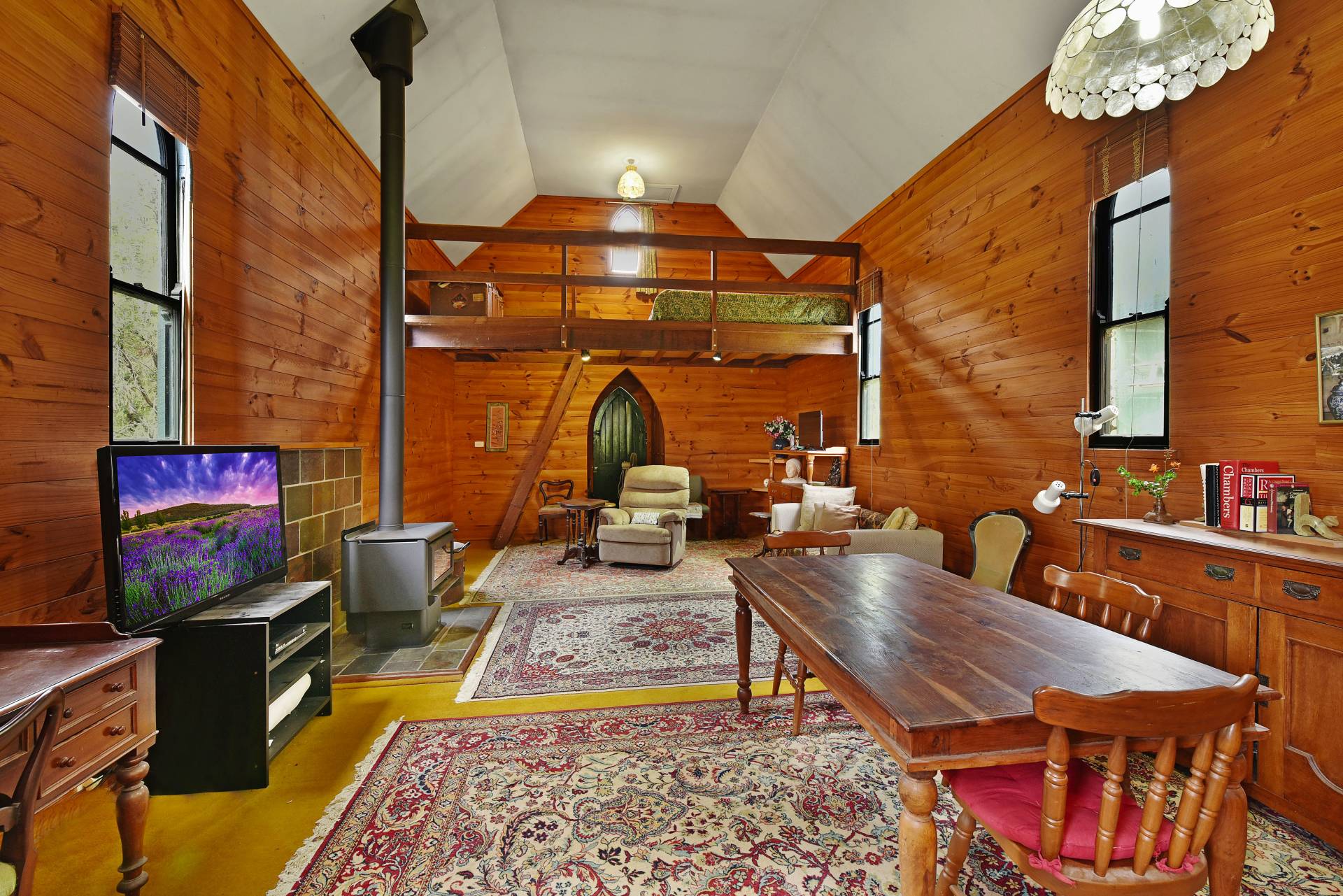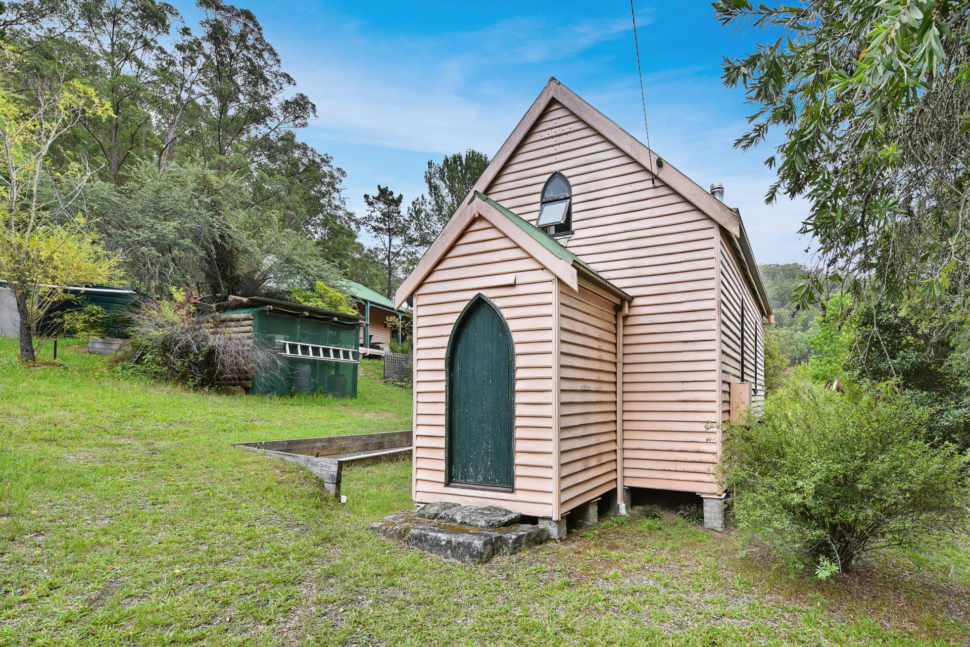 This intriguing 3.1ha (7.6 acre) property features an 1883 church building that has been faithfully restored into a charming residence. The current owner has respected all the original materials and cleverly used them through-out the building. Cute and cosy, with a slow combustion fire place, the home has a country style kitchen leading to a large open plan living/dining, spacious mezzanine level/bedroom, restored bathroom/laundry with modern touches and another bedroom with church style windows which was once the vestry.