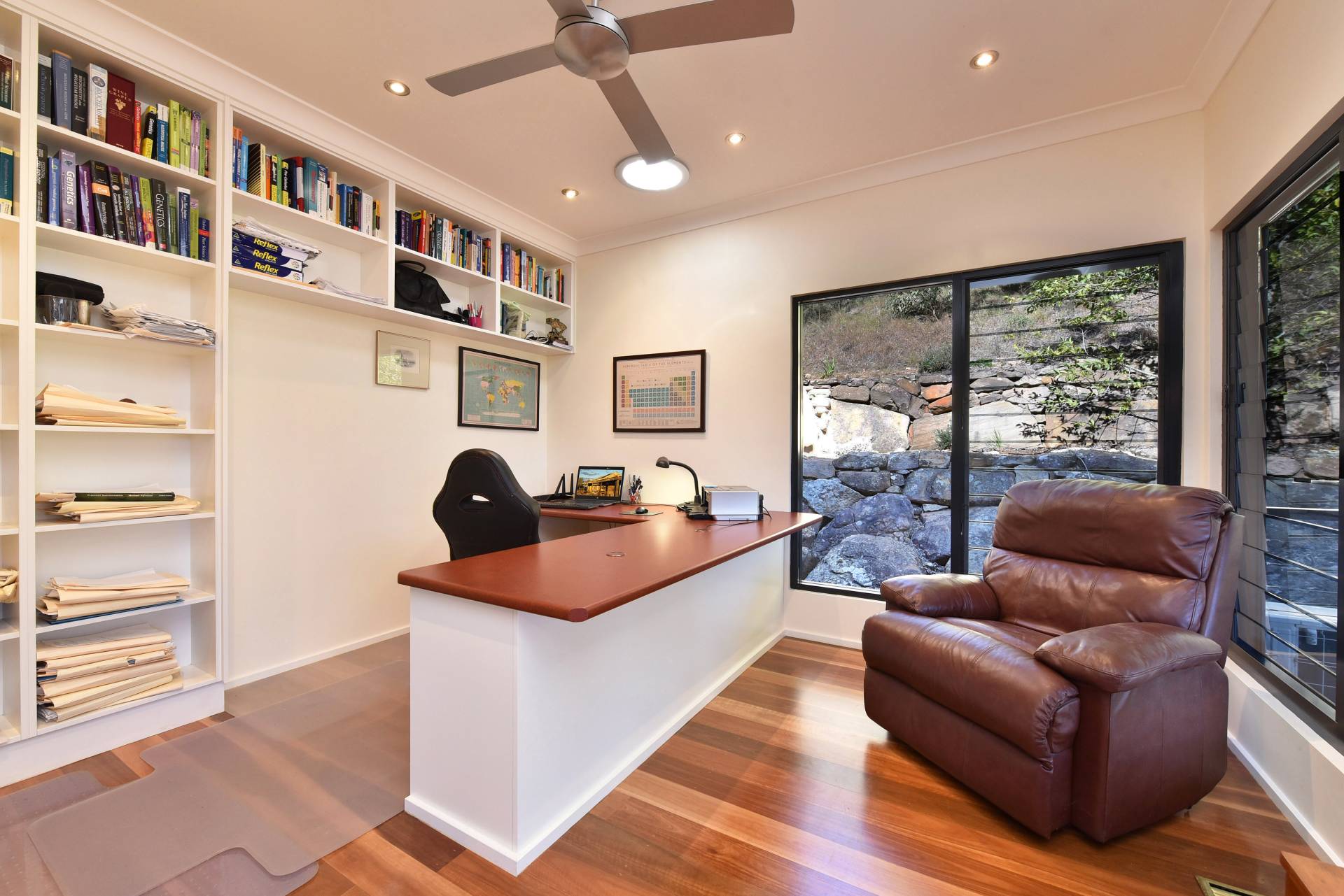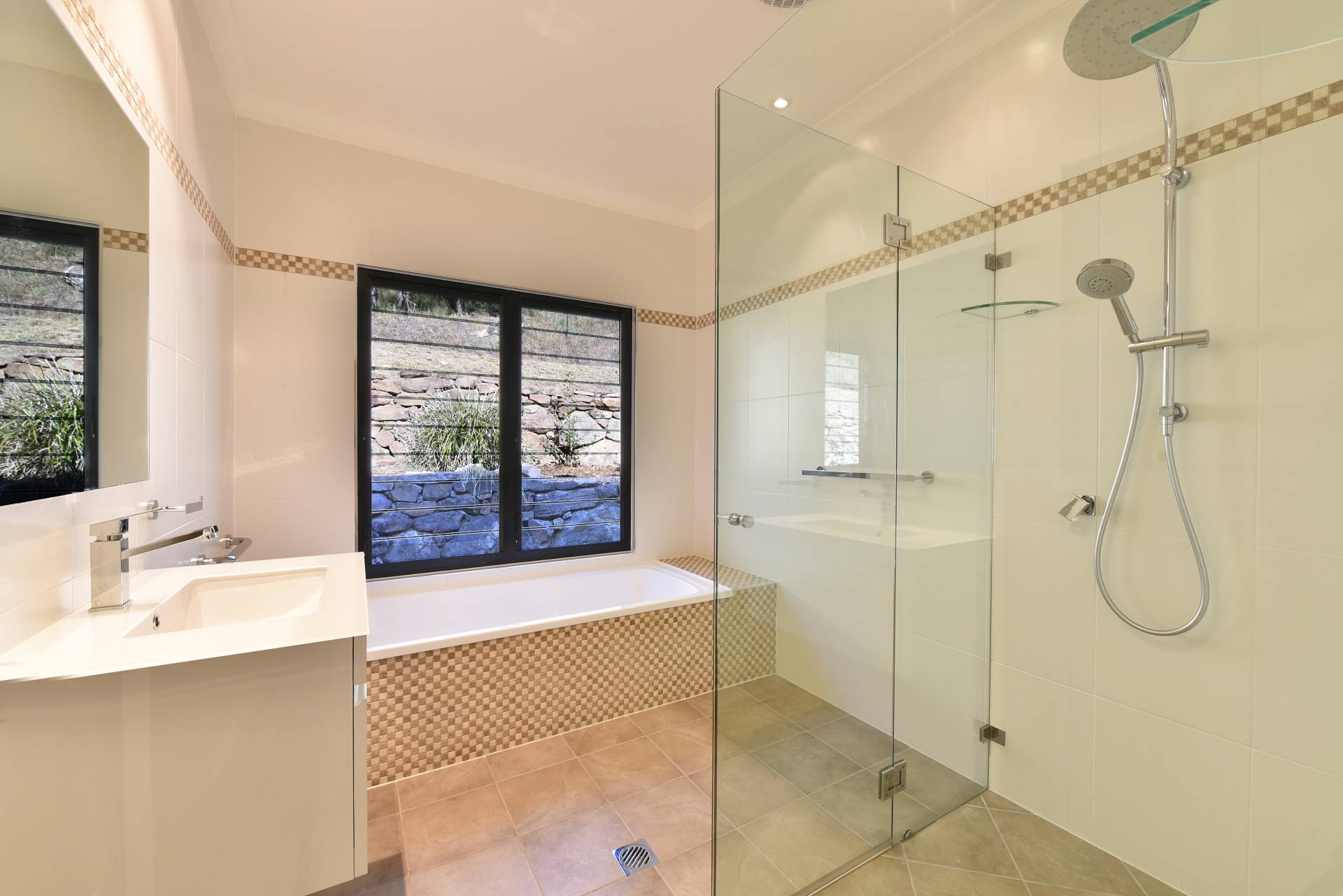 24 roof solar panels generating 26-30 Kw of power per day (supplemented by grid power when required), 5 water tanks holding a total of 90,000 litres of rainwater, maximum insulation in all walls and ceilings, extensive covered decks and louvered tinted windows, a septic system which recycles treated grey water onto the gardens.