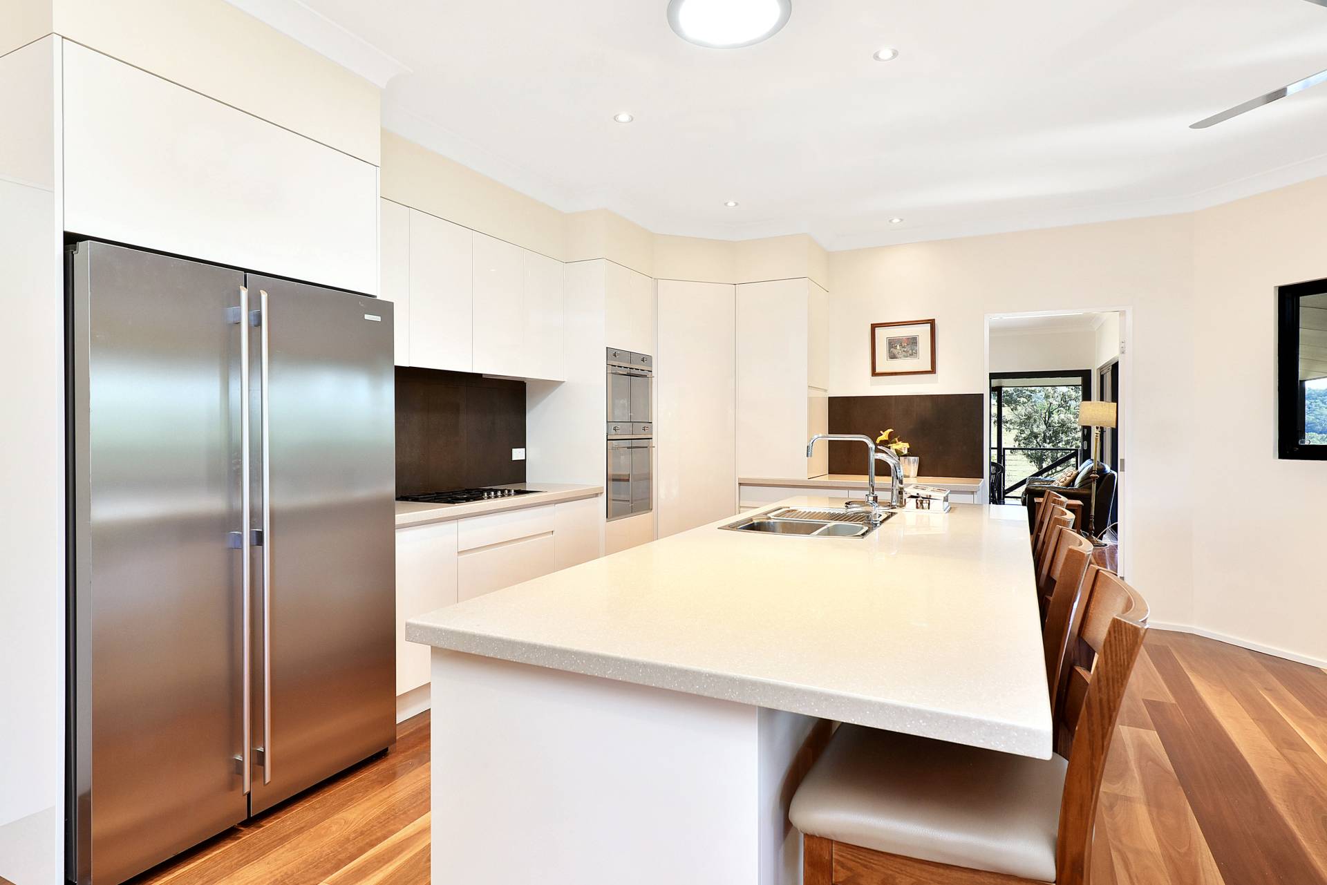 Externally, the timber walls and decking are constructed with stained merbau timber. Upon entering the house, a large sandstone feature wall, which matches the sandstone wall in the pool enclosure, welcomes you into the main living area with its cathedral ceiling, downlights and spotted gum timber floors. The home features open plan living incorporating multiple living areas, a dining area and a top of the line kitchen. The kitchen is fully equipped with Corian benchtops, quality Smeg and Miele appliances, including a Billi hot and cold filtered water system. A slow combustion wood heater is strategically placed to warm the open spaces. Reverse cycle air conditioning units and ceiling fans can be found in every room. There is a large well-equipped internal laundry off the kitchen.