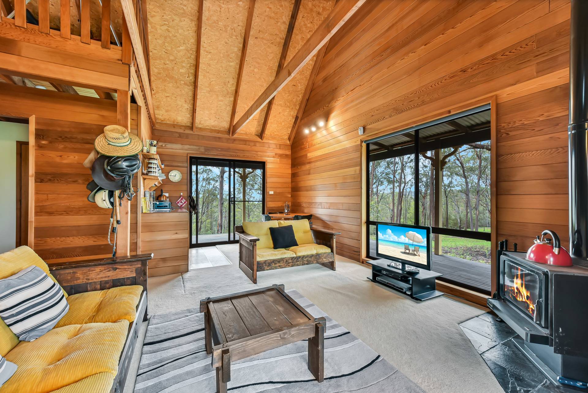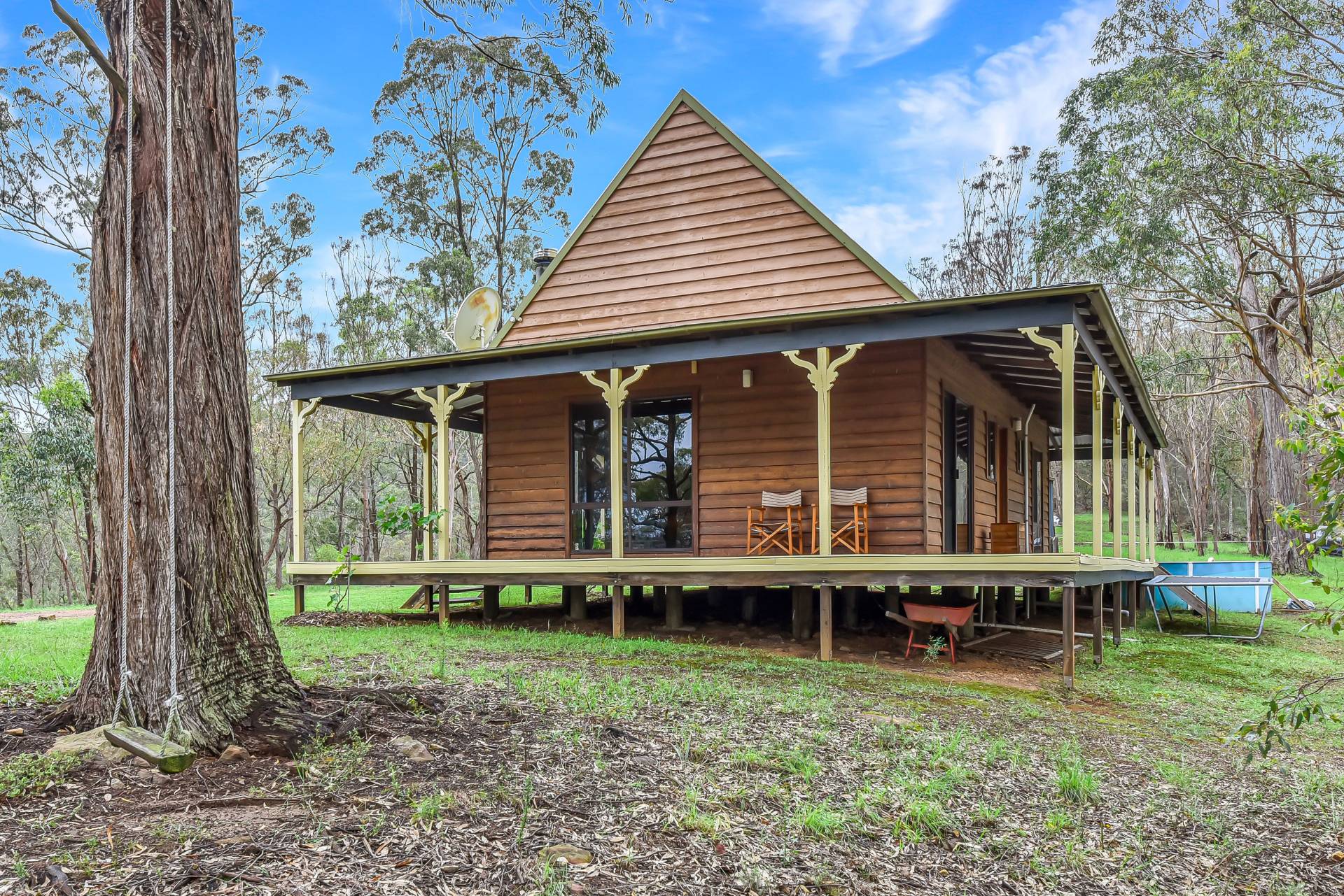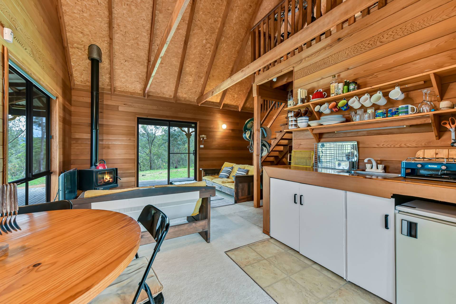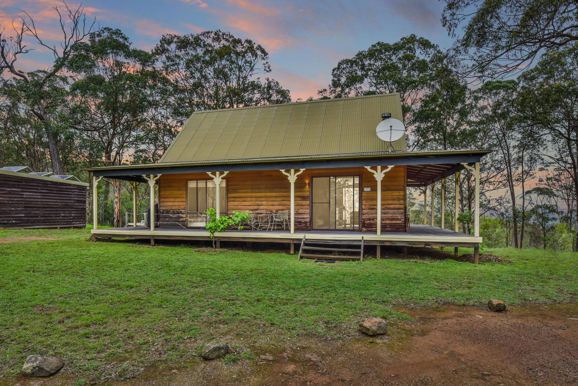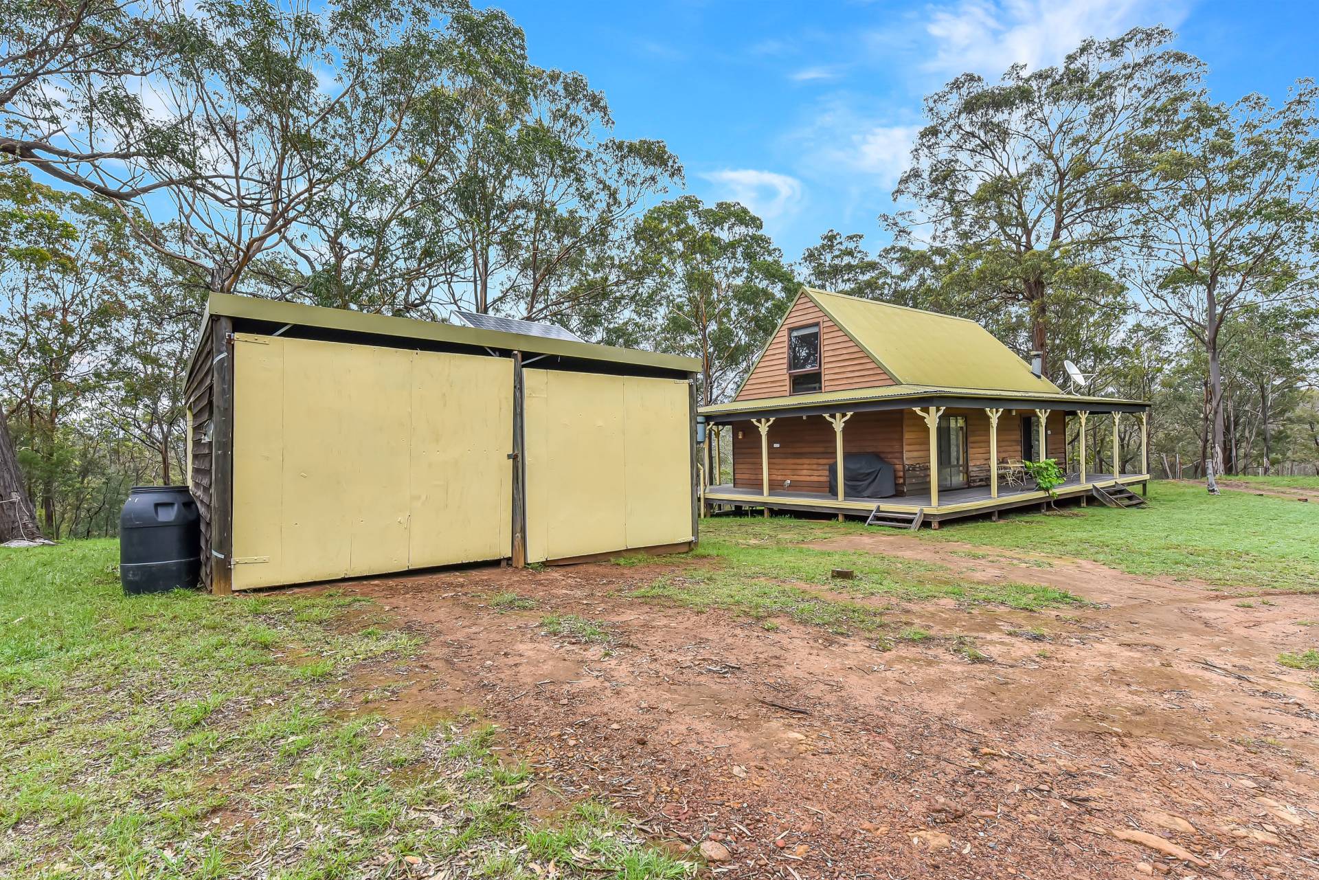The timber cottage is totally off the grid running on solar power, LPG gas and tank water. The cottage comprises open plan living, a quaint country style kitchen, bathroom, two bedrooms as well as an upstairs loft bedroom. Full of character throughout, the features of the home are endless. A slow combustion fireplace is a central focal point of the open plan living area. Lovely cathedral style high ceiling, character windows and large wrap around verandahs take full advantage of the country ambience.