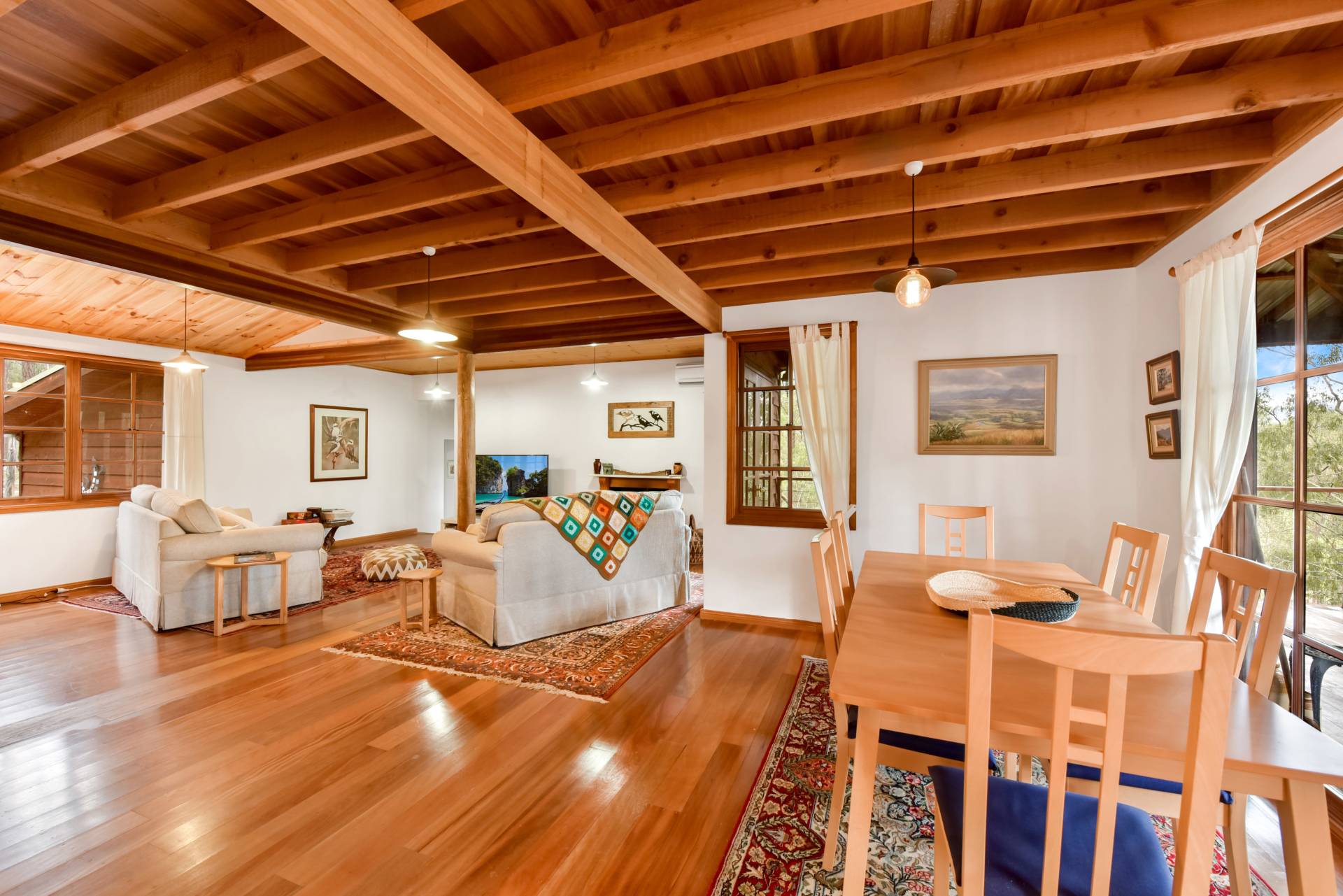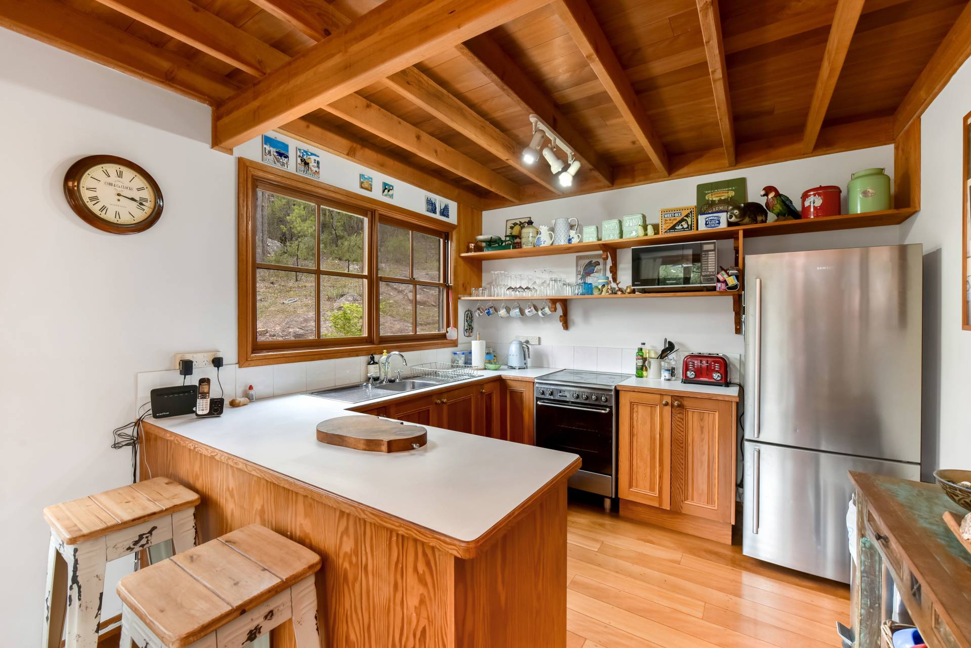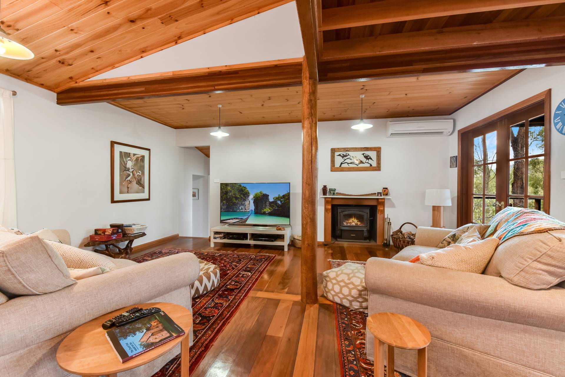 Set upon a scenic knoll of a hill, this cosy cottage looks over green valley pastures. With tree studded grounds and striking rock features the acreage is beautifully landscaped.