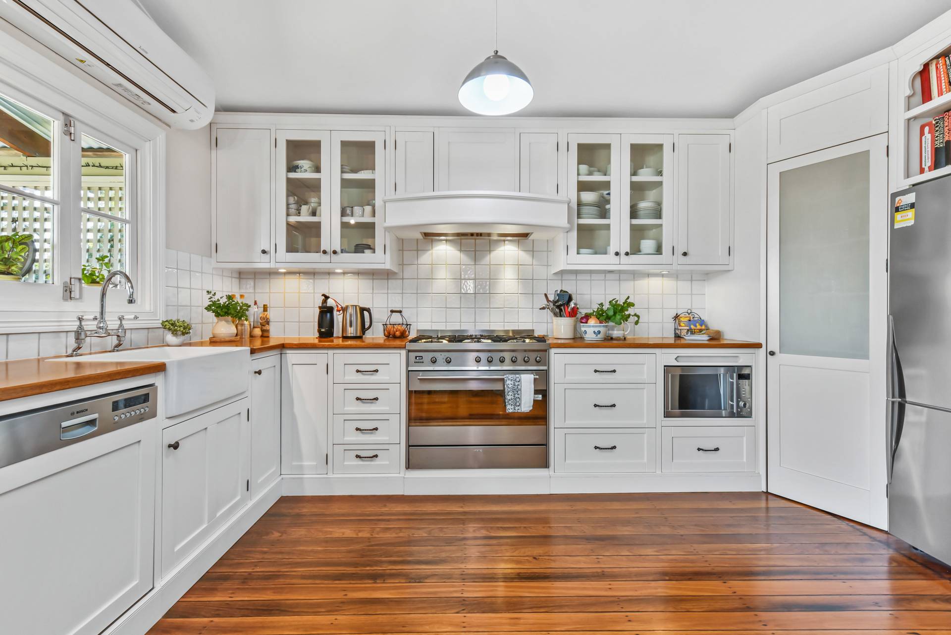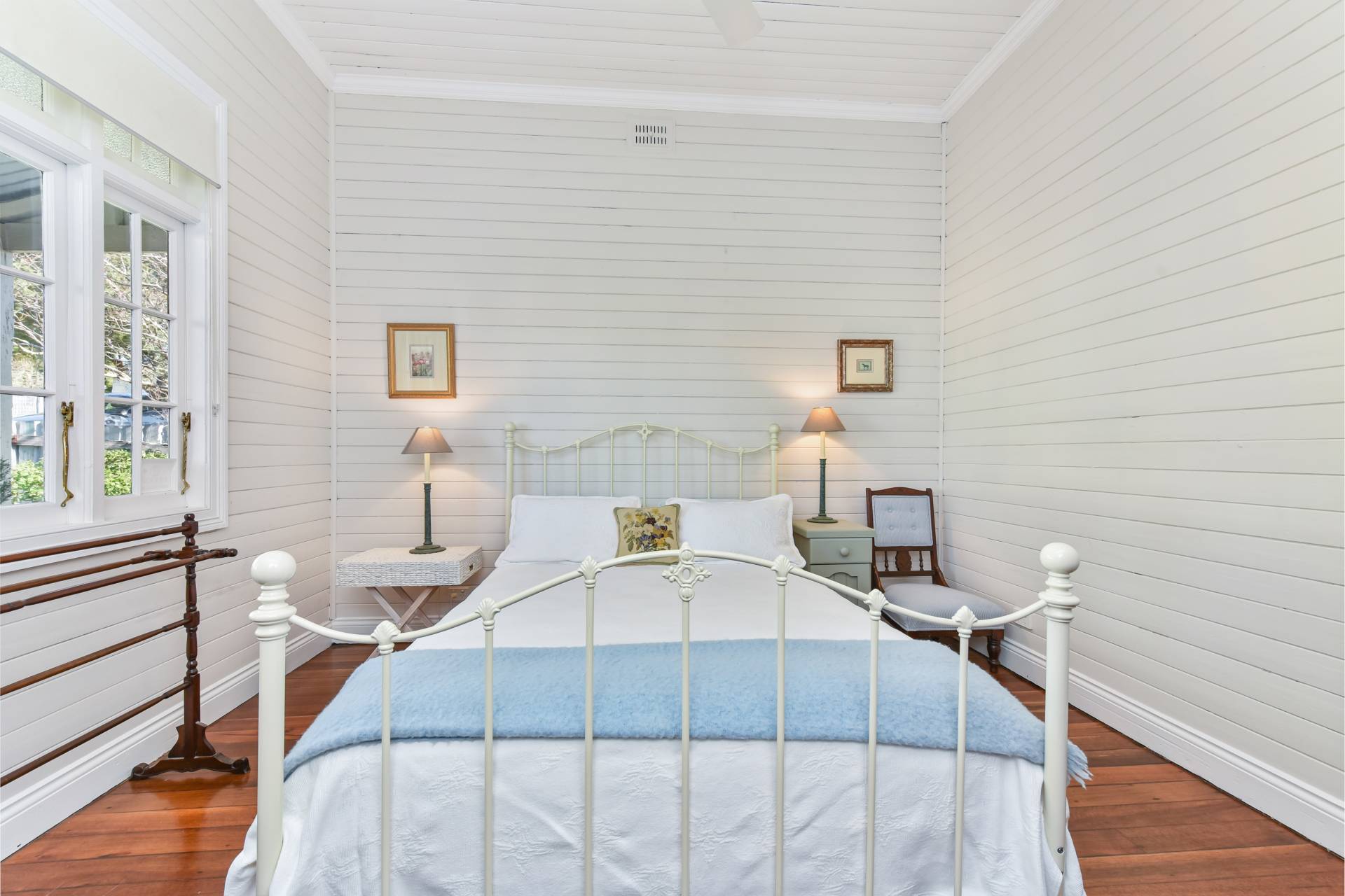 A traditional bathroom with hardwood timber floors features a cast iron claw foot bath, separate shower, beautiful pedestal basin, and toilet. The laundry is well equipped with ample storage including built in cupboards, and a second toilet facility.