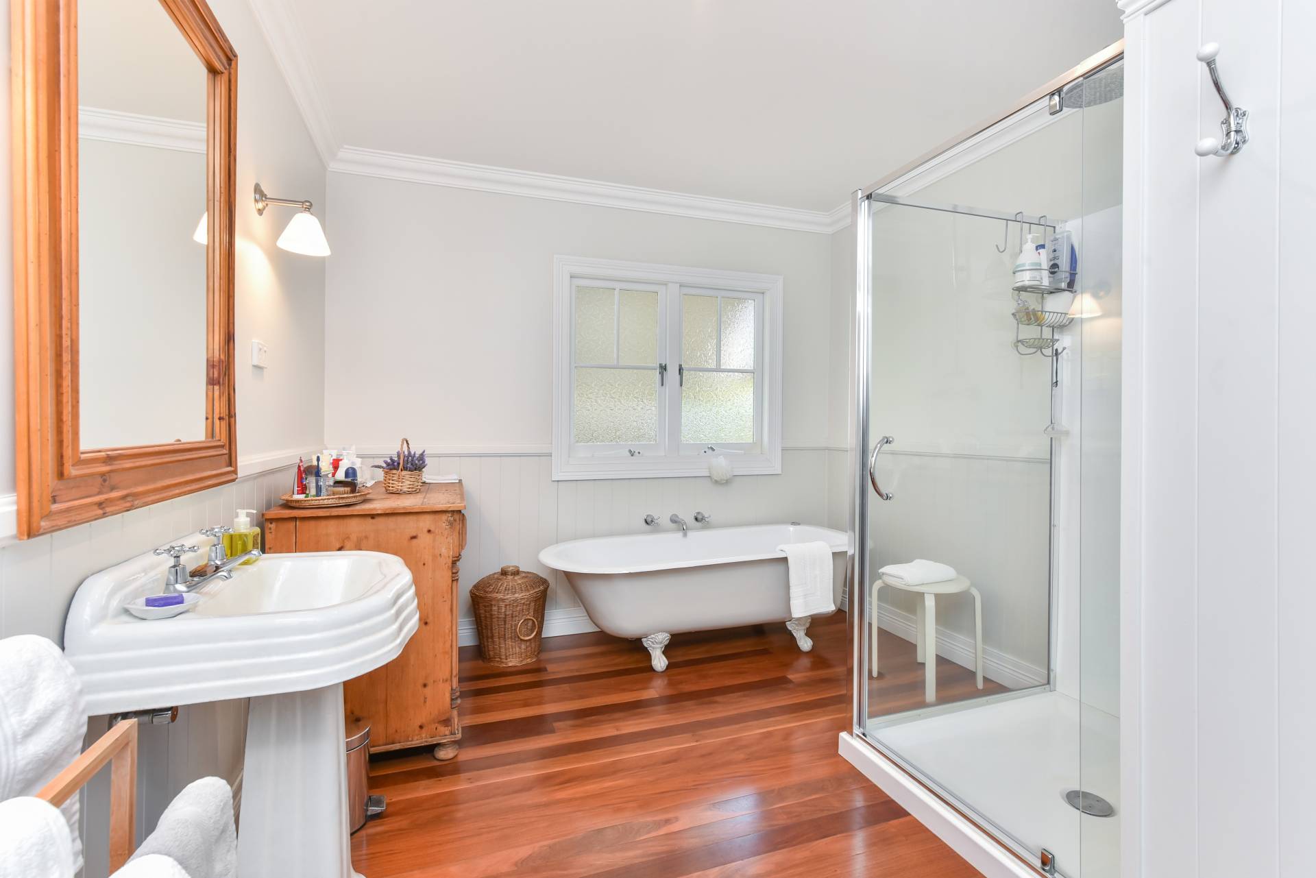 • Traditional bathroom with hardwood timber floors,cast iron claw foot bath, separate shower (6' 6" height with great pressure), pedestal basin, and toilet