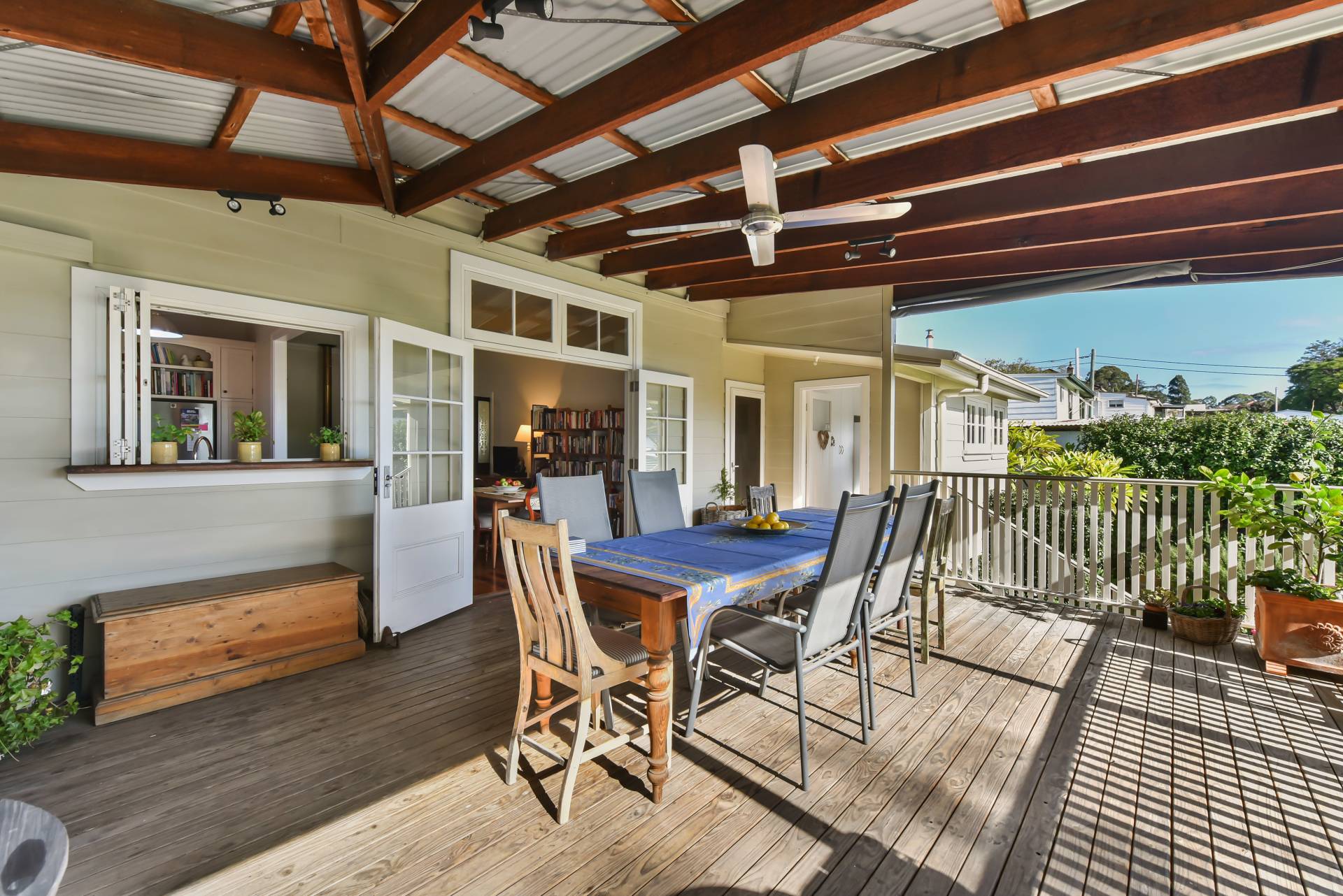• Large north facing rear under cover entertainment deck with ceiling fan & kitchen servery