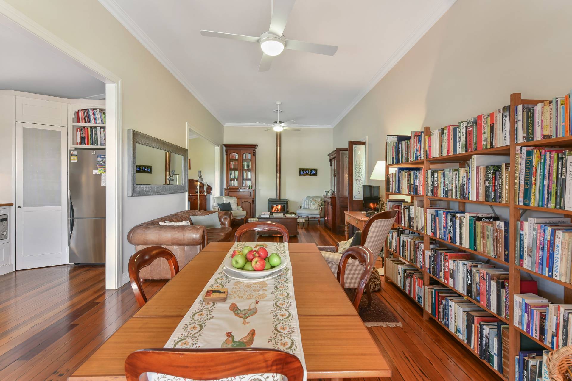 A gorgeous open plan living room incorporates a separate dining room, casual meals area and gourmet kitchen with American White Oak timber bench tops, European appliances including a 'Smeg' gas 6 burner stove with an extra-large electric oven, fitted 'Smeg' microwave, Bosch dishwasher, top of the line English butler's sink with superior tap fittings. An Esperance free standing wood heater services the open plan areas and also features a ducted air transfer system to bedrooms one and two, providing all the warming comforts needed for the winter months.
