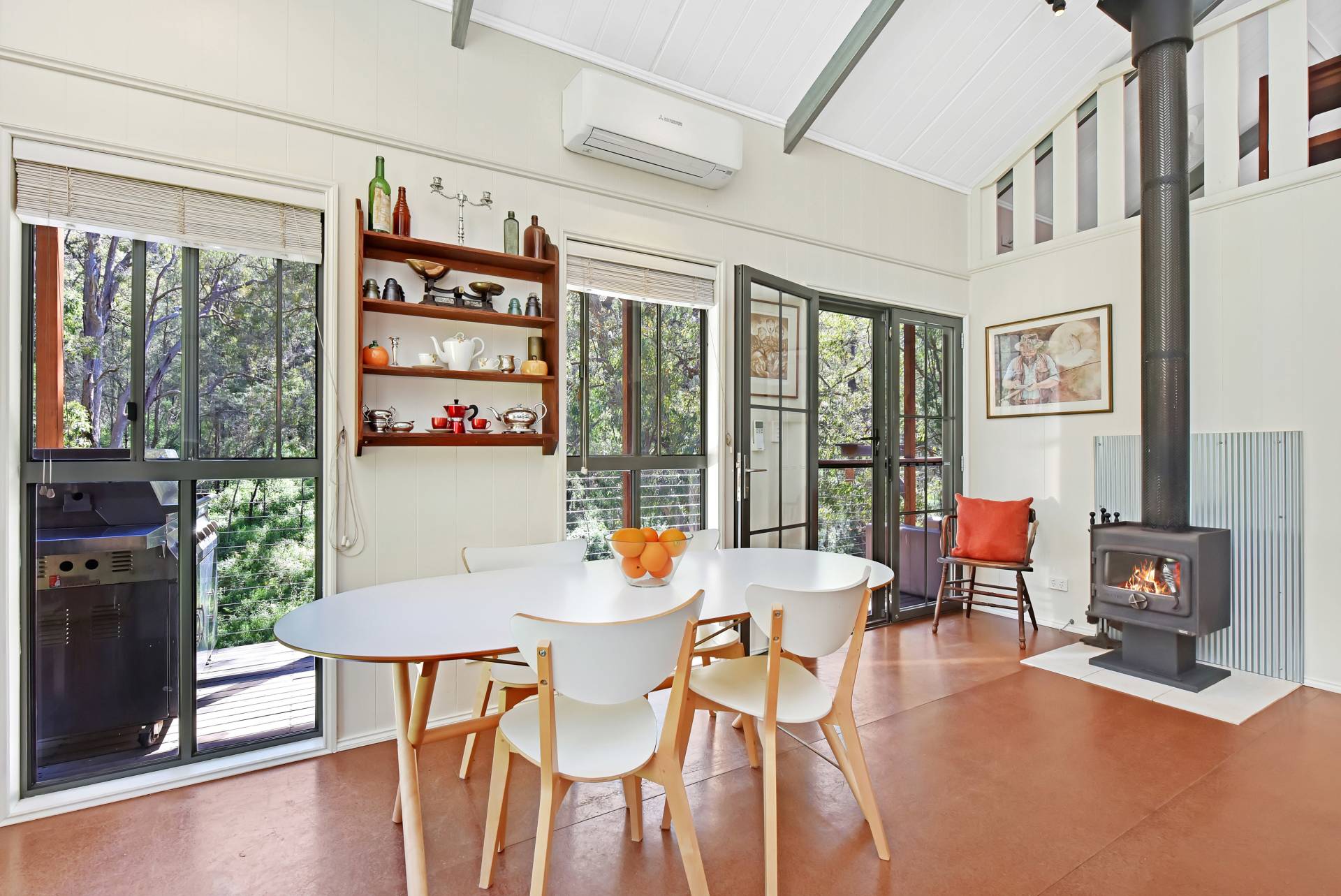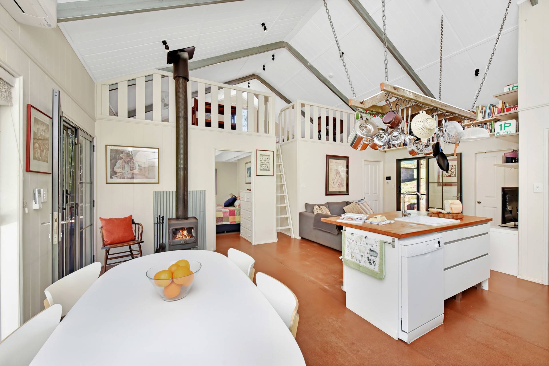 The Cedar Span cottage consists of 2 bedrooms plus a mezzanine floor, a modern bathroom, laundry, open plan living/dining, modern country kitchen, large walk-in pantry and verandas front and back. It is established perfectly for off-grid living with LED lighting, a Rayburn wood burning range which includes a wet-back water heating system and 2 radiators in both the bathroom and laundry. It also has the added comforts of air conditioning and a dishwasher. Hot water is also heated by solar panels located on the roof. In addition, there is a Nectre combustion fireplace for those cool winter nights.