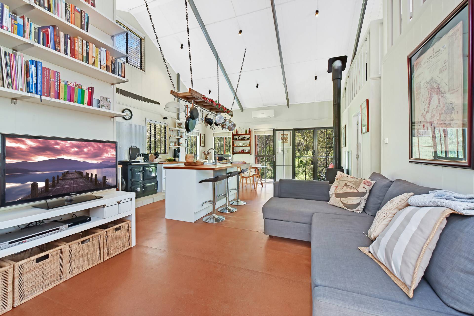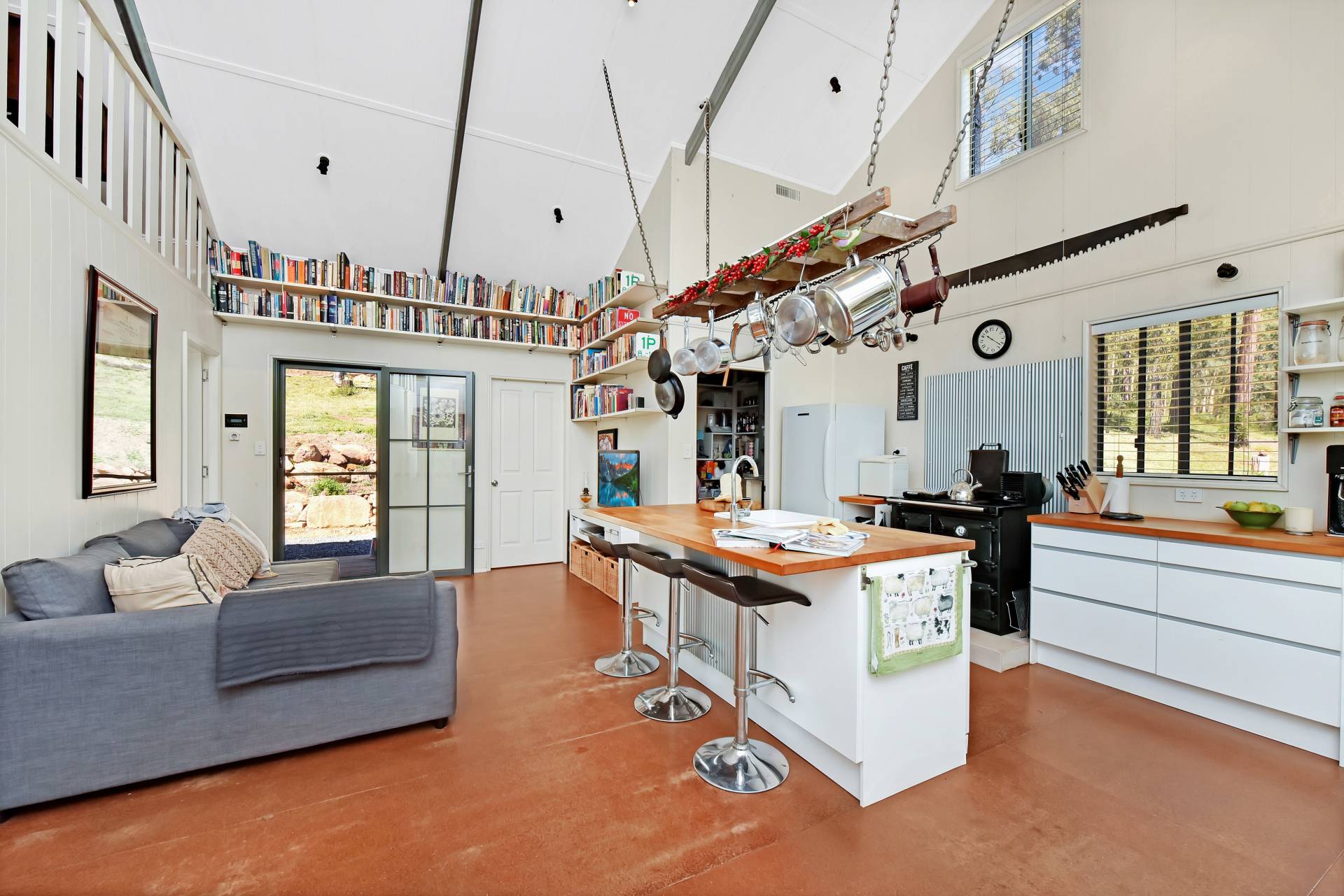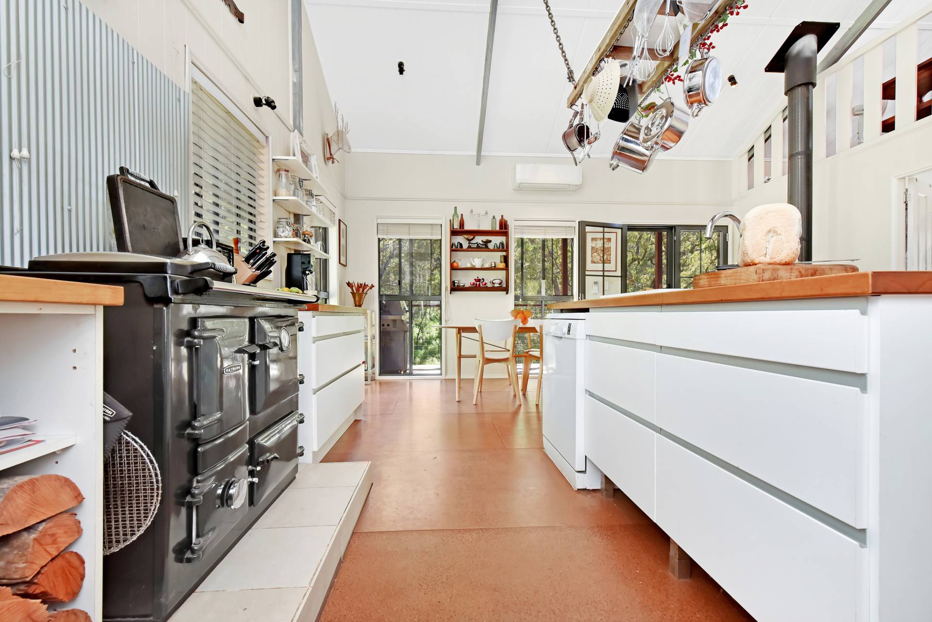 • Island bench with rustic hanging rack above