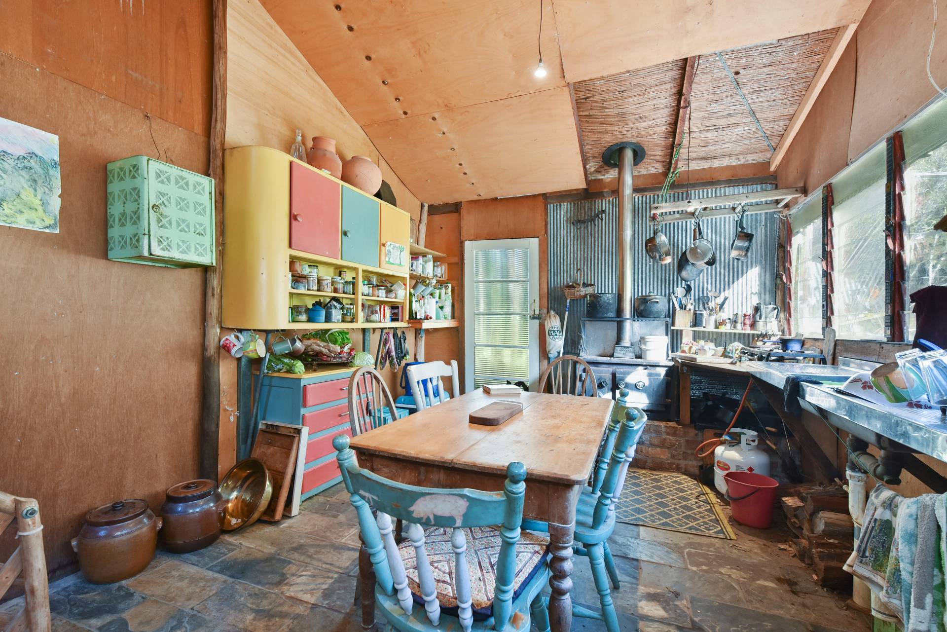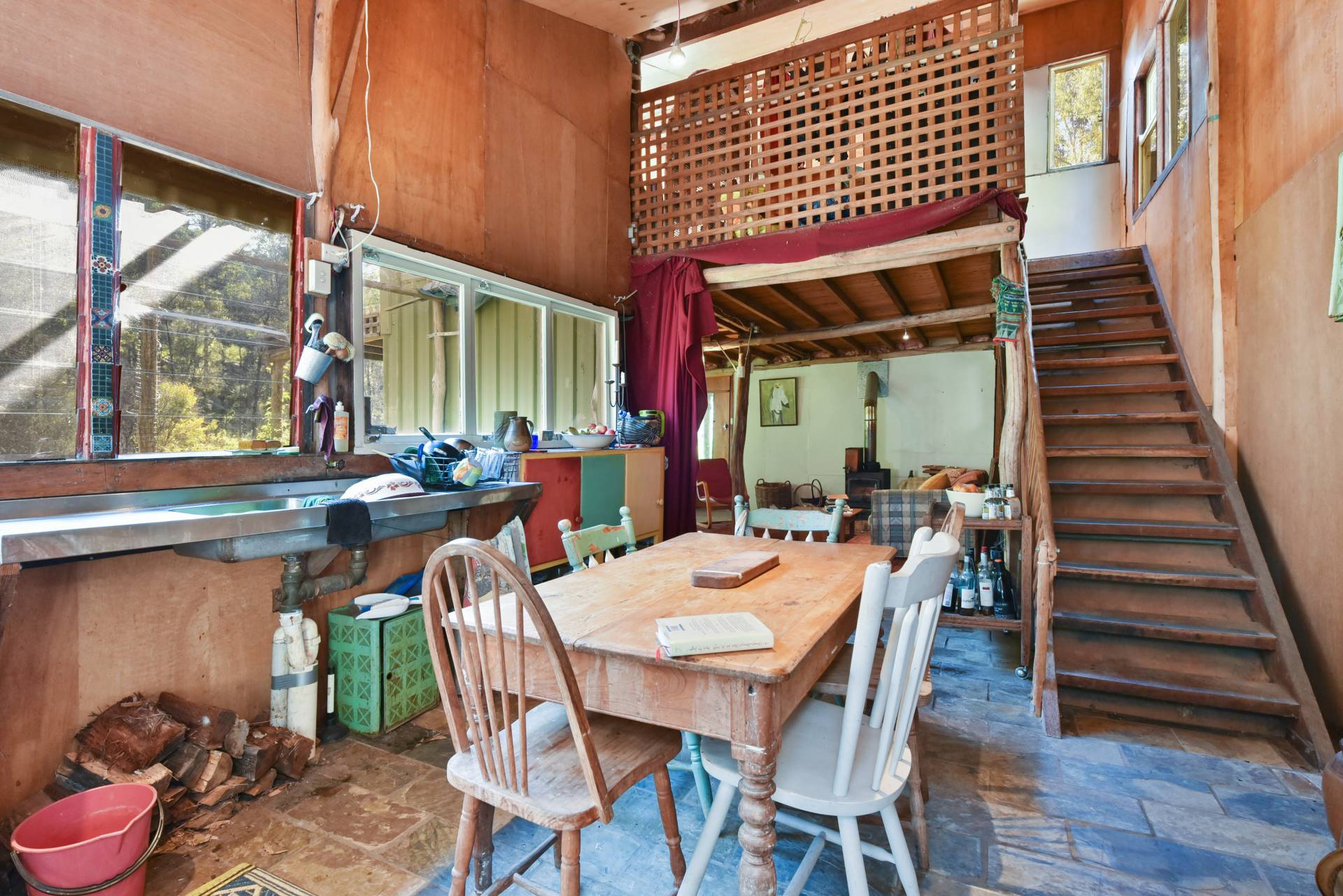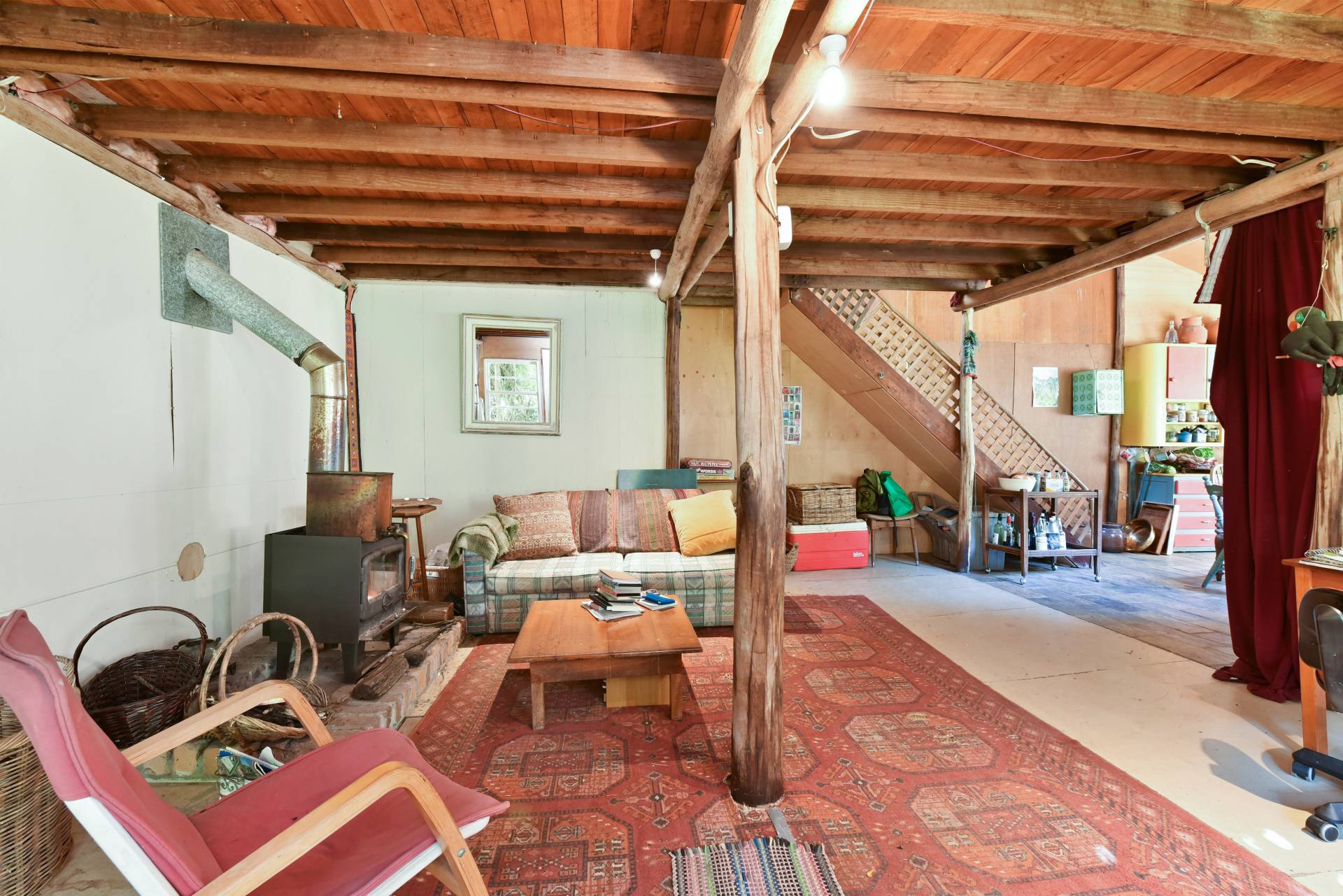 • Shed includes a wood stove for cooking, slow combustion fire for heating, upstairs loft with pine timber floors & a balcony