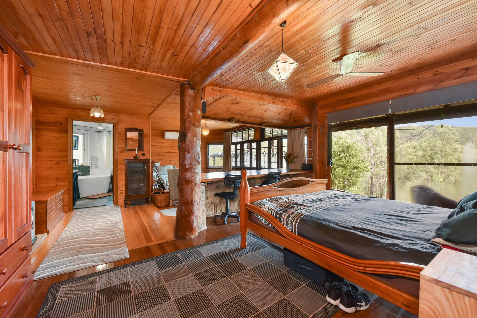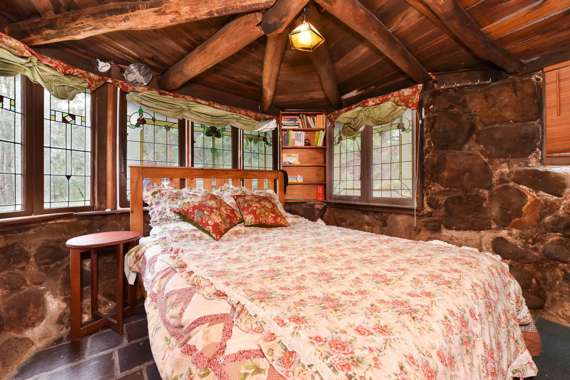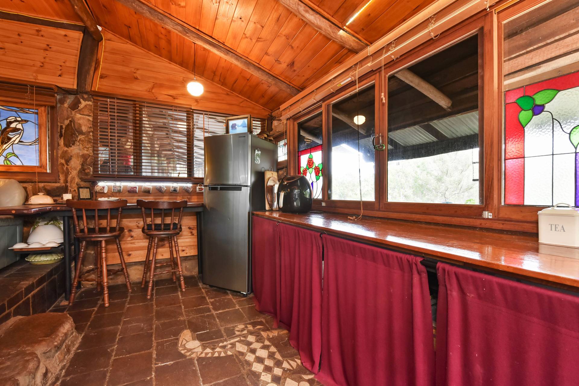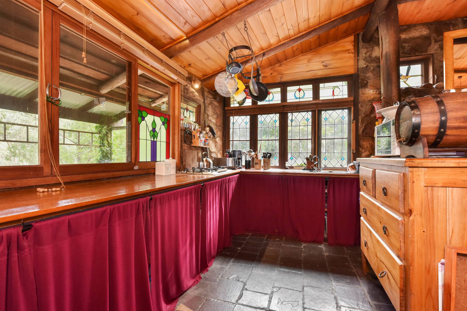 The character filled retreat comprises open plan living spaces, a quaint country-style kitchen, and 3 bedrooms each with a unique style and scenic view. Full of character throughout, the features of the retreat are endless. A stunning, sandstone fireplace is centrally located within the open plan living area, ideal for the winter months, creating a place of warmth to gather with family and friends. Lovely stained-glass windows are another prominent feature throughout. A mix of hardwood timber & slate tile flooring compliment the extraordinary hand-made construction.
