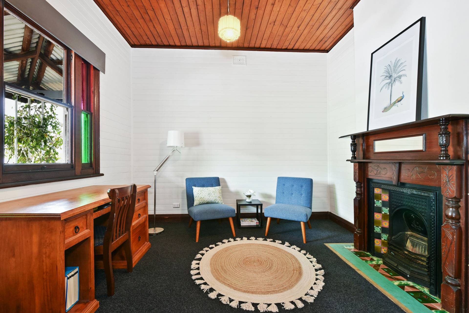 A central living room has a beautiful ornate fireplace which is double sided and serves one of the bedrooms as well, while another reverse cycle air-con will keep you comfortable all year round. At the rear of the home is a stylish new kitchen featuring stone bench tops, shaker style cabinetry with soft close doors & drawers, a breakfast bar and stainless-steel dishwasher, electric oven & cooktop. A dining space adjoins the kitchen and enjoys a sunny northern aspect looking out through double French doors to the leafy surrounds at the rear of the home.