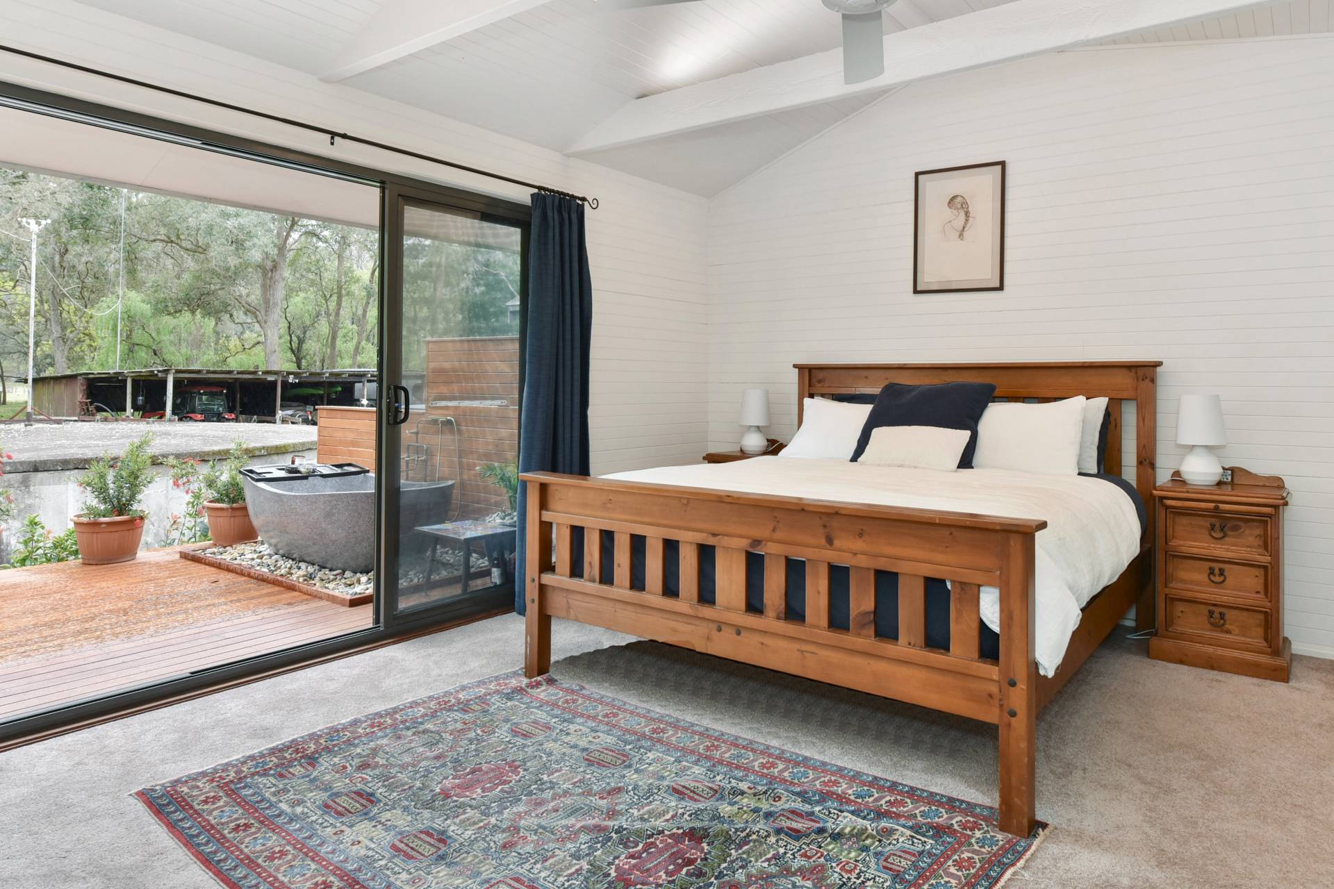 A separate studio is attached to a large machinery shed and has been fitted out with the finest touches! With 2 bedrooms and two bathrooms, the main bedroom having built in robes and stacker doors, opening onto a private deck with a 6ft free standing stone bath tub. There is a laundry with an extra toilet, a large modern kitchen with Caesar stone bench tops, spacious open plan living and dining area with a wood fire place to keep you warm in the winter months. There is an undercover outdoor deck entertainment area fitted with a large wood fire pizza oven and a bubbling 6-person spa tucked around the corner. The studio features raked ceilings and has a stylish Hampton feel to it… Ceiling fans and split system reverse cycle air conditioning services the main living area and bedrooms.