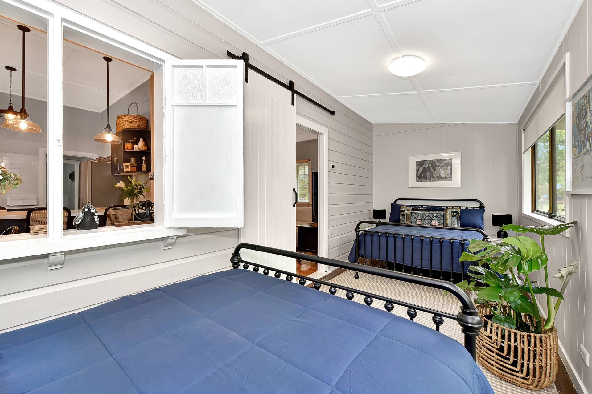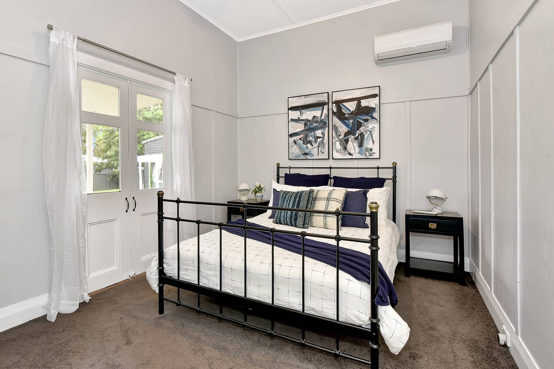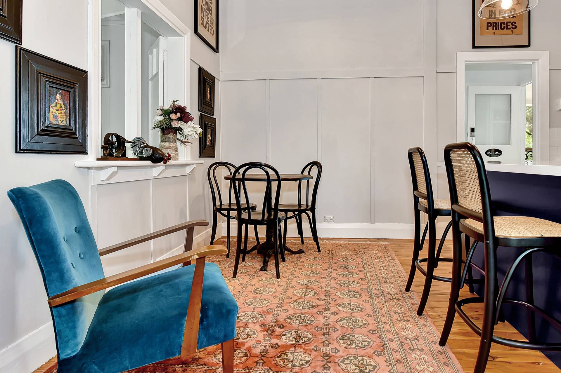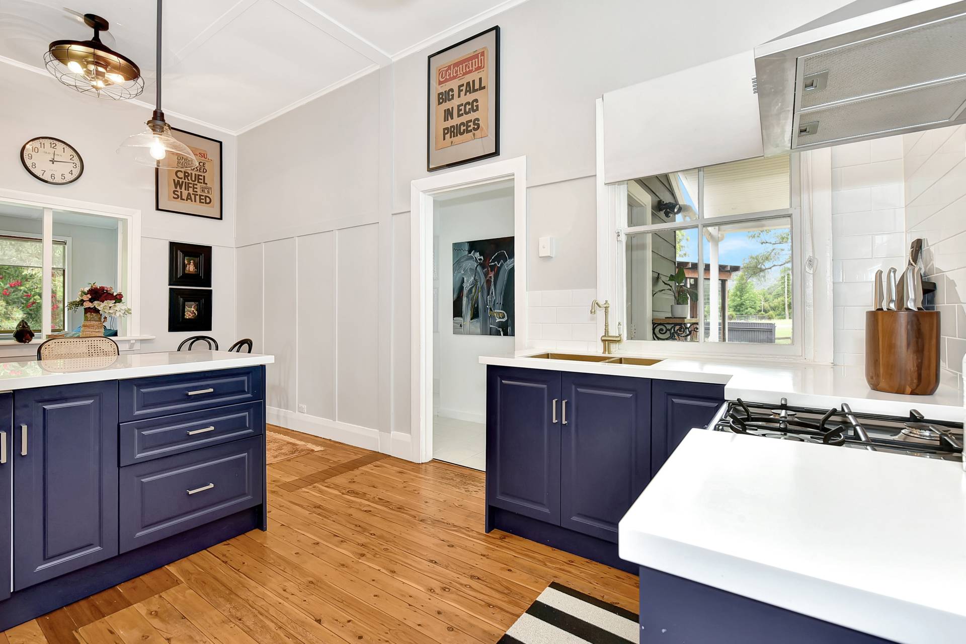 A brand-new bespoke kitchen includes a stainless-steel electric oven and gas cooktop, attractive heritage navy cabinetry with classic gold sink and fittings, breakfast bar and dining space. The kitchen wraps around to a light filled living room with a slow combustion fireplace and reverse cycle air conditioning.