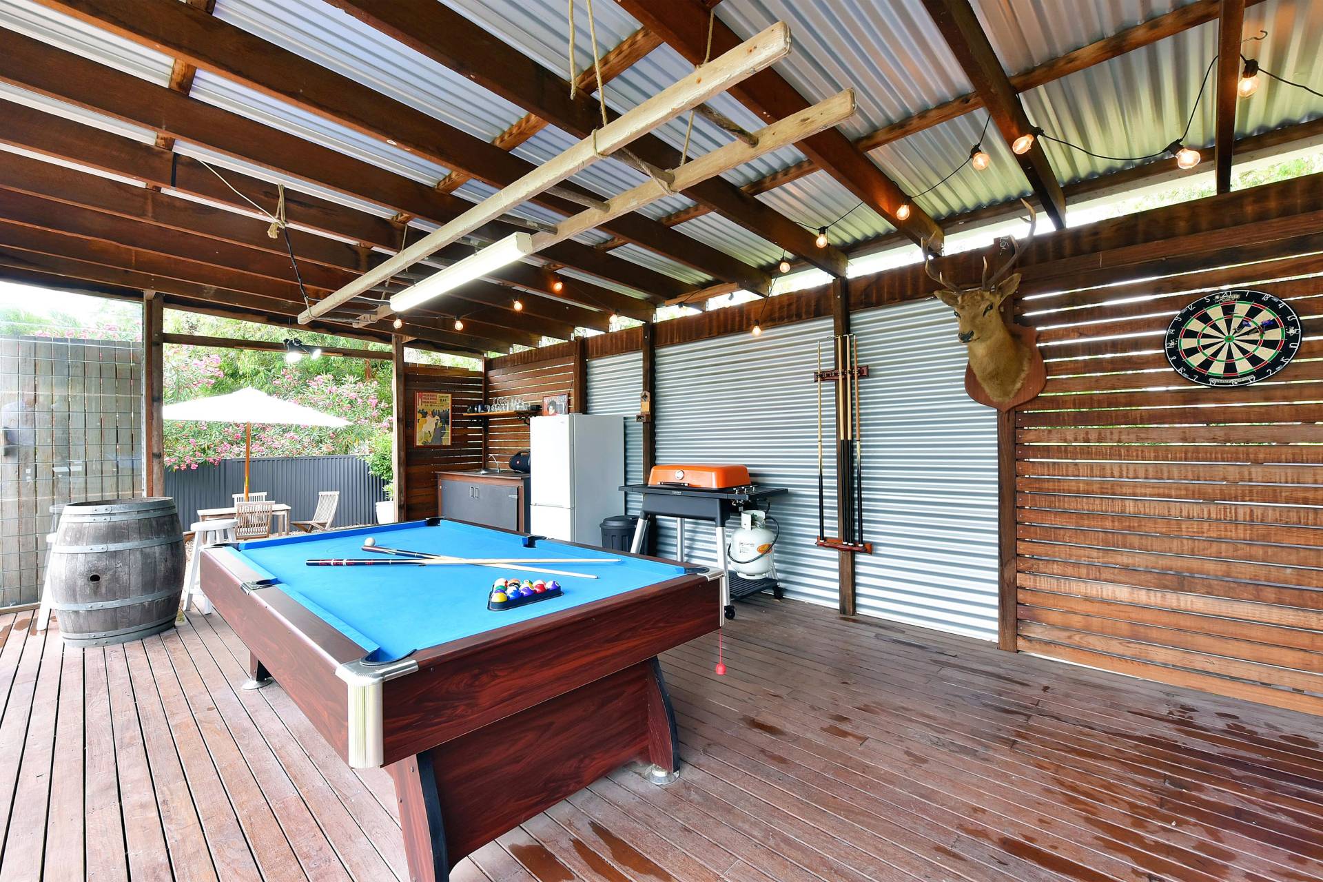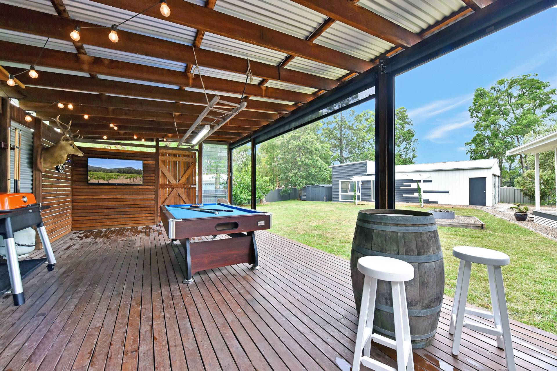 Adjacent is the undercover outdoor entertaining area that has been recently constructed with hardwood decking, retractable blinds, large flat screen TV, pool table, kitchenette, Heston Blumenthal BBQ and Cooker and outdoor shower making another great space for gatherings. Its Tuscan inspired pebbled outdoor spaces, a firepit area, chicken coop, lush green grass and established landscaped gardens are a highlight of this beautiful leafy property.
