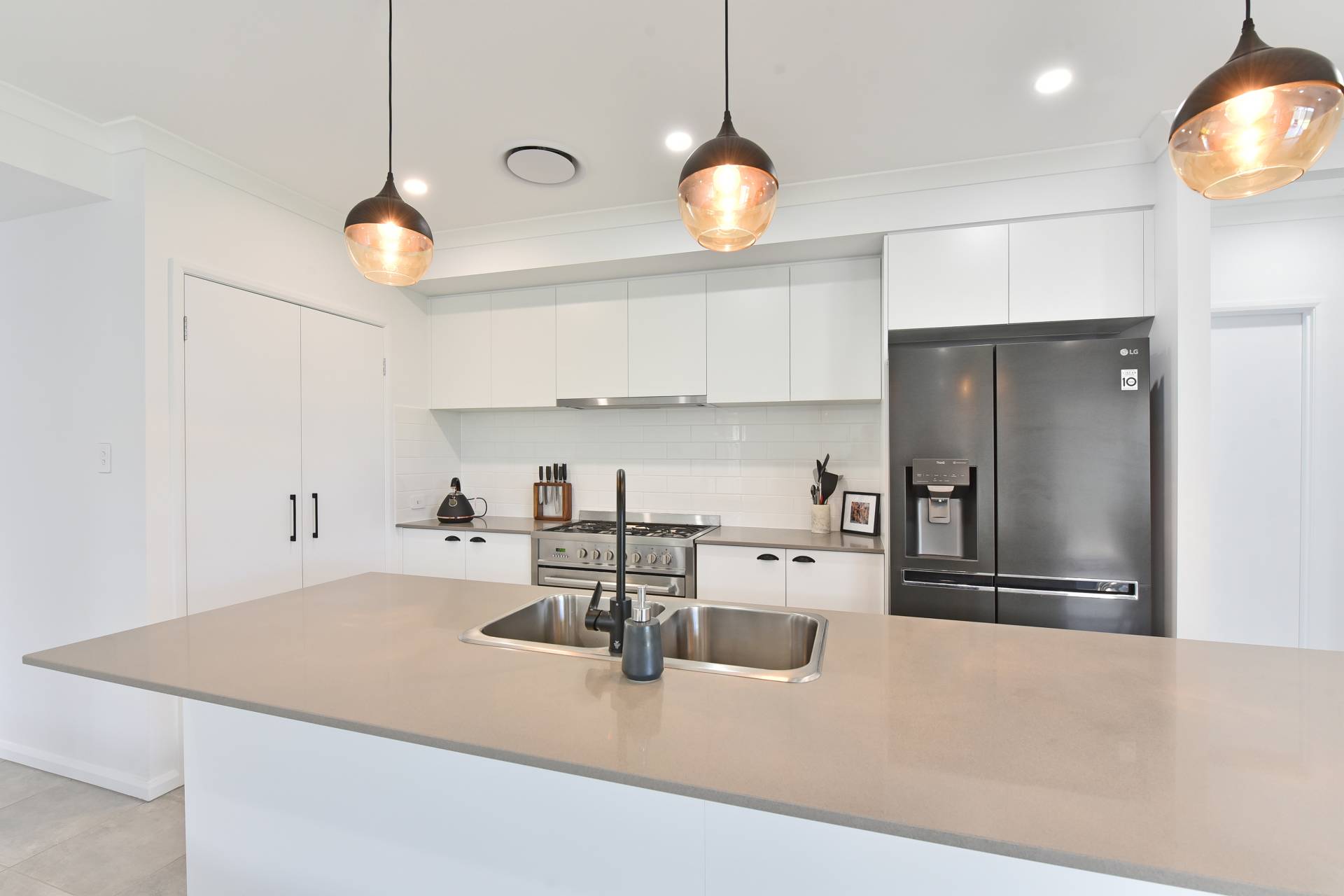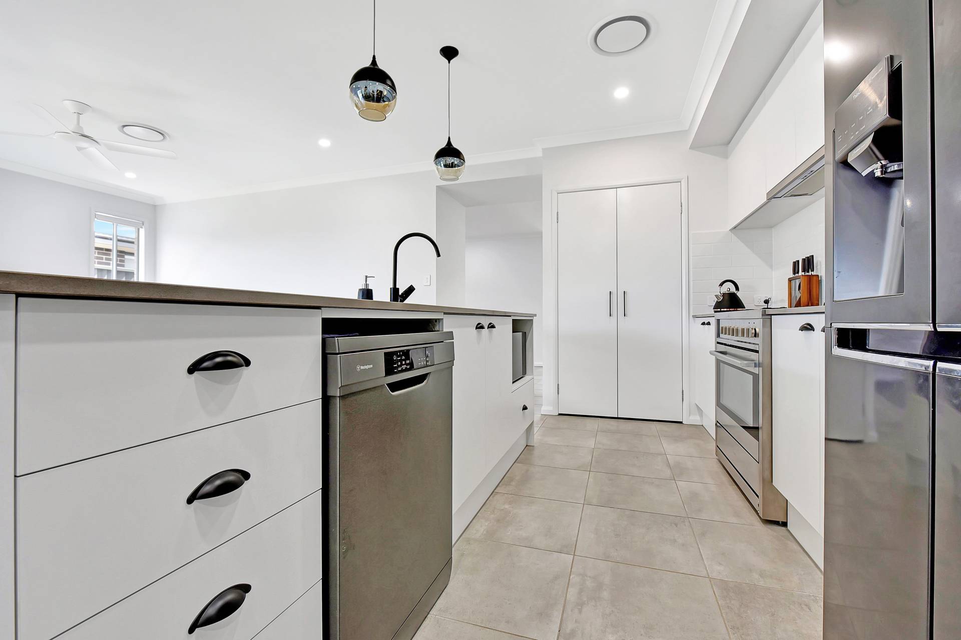A beautiful gourmet kitchen has all the modern trimmings with stone bench tops, dishwasher, walk in pantry and a stainless-steel gas stove.