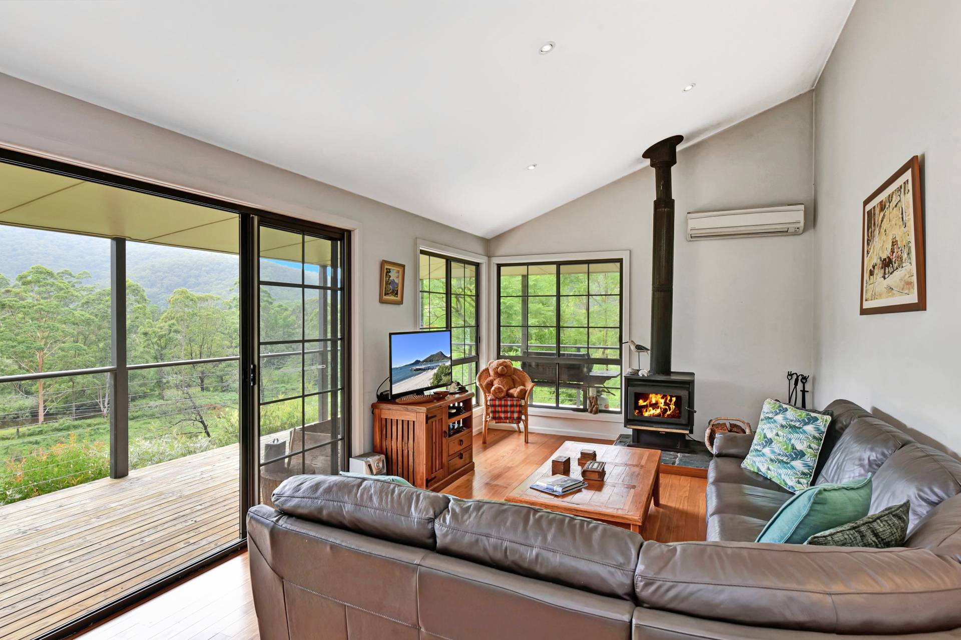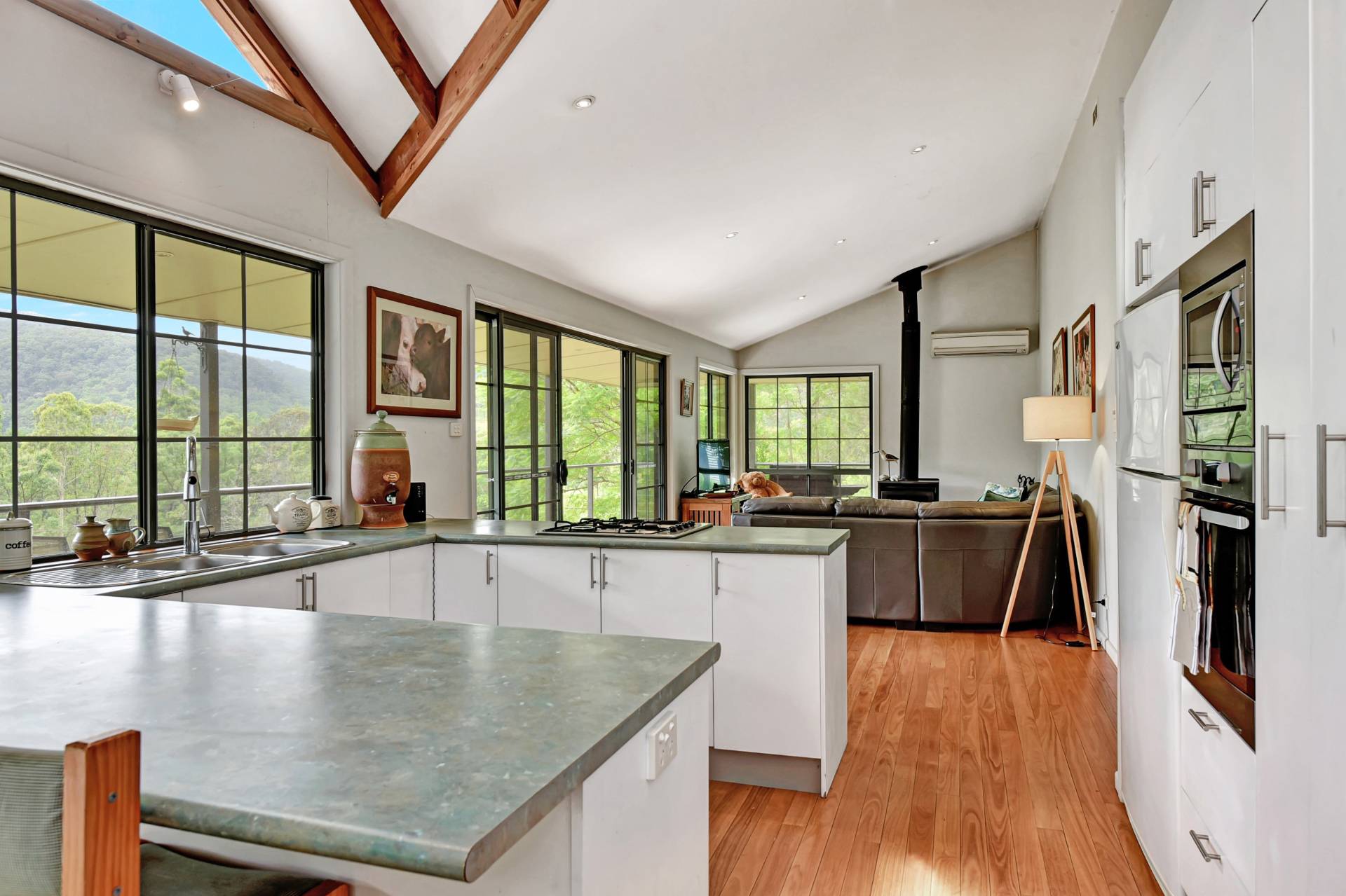 Features include a slow combustion fireplace and split system air-conditioning. Wrap around verandahs on the northern side of the home are perfect for entertaining and admiring the natural surrounds. A well-equipped central kitchen with a breakfast bar and ample storage also includes a gas cooktop, wall oven & dishwasher. Either side of the kitchen are light-filled spacious rooms ideal for dining and living space with timber floors & high raked ceilings throughout.