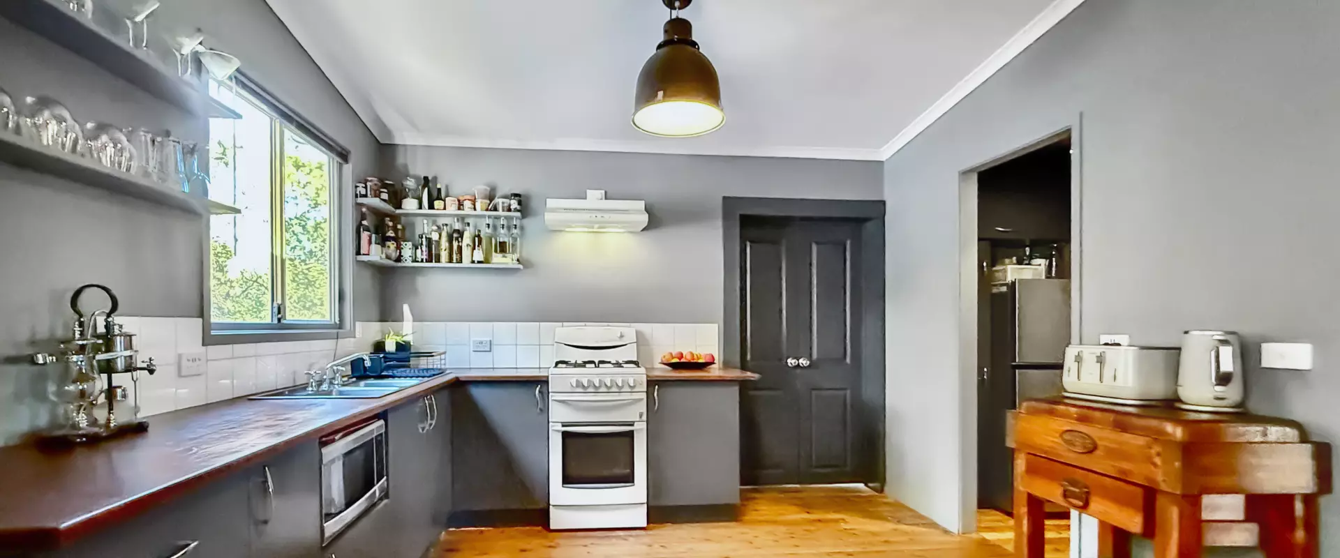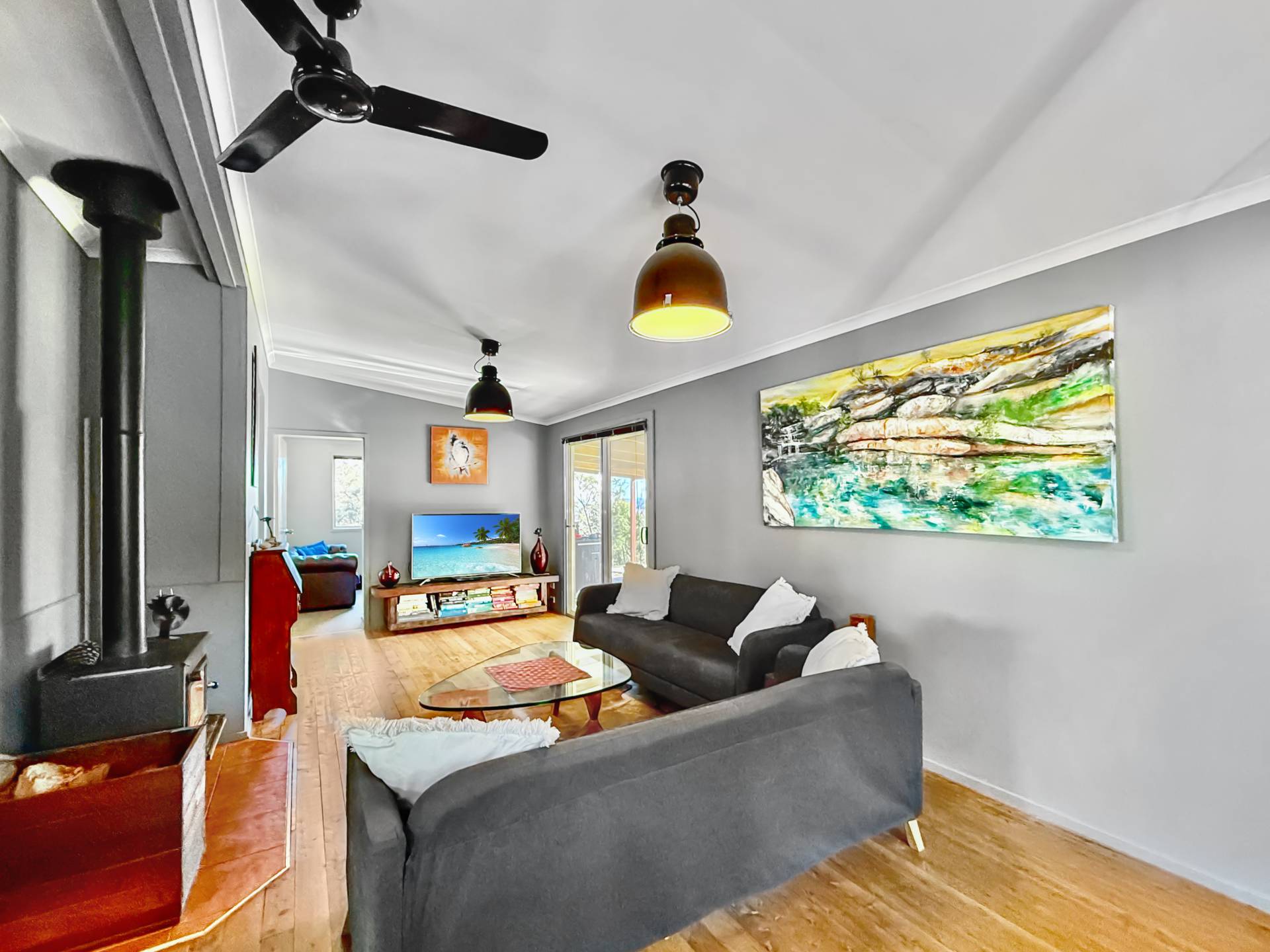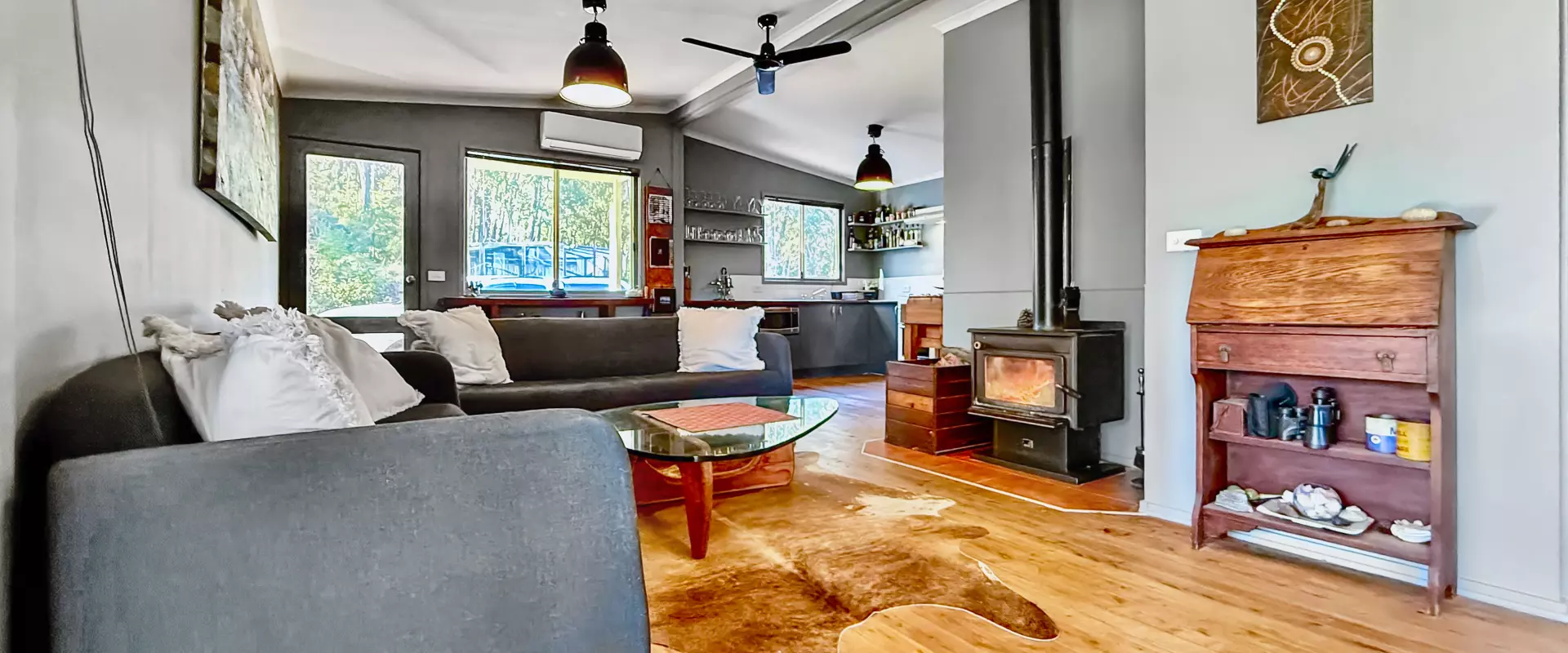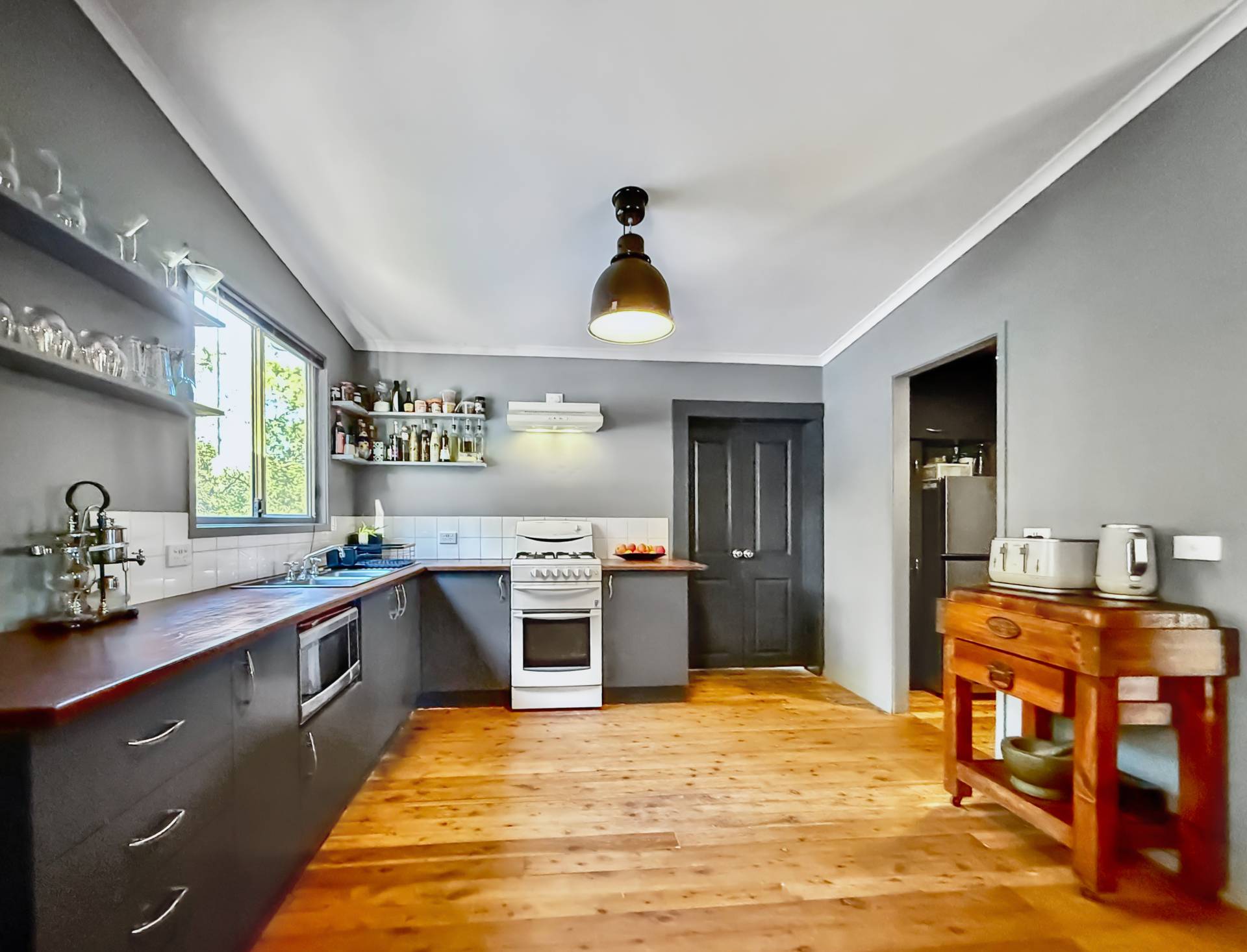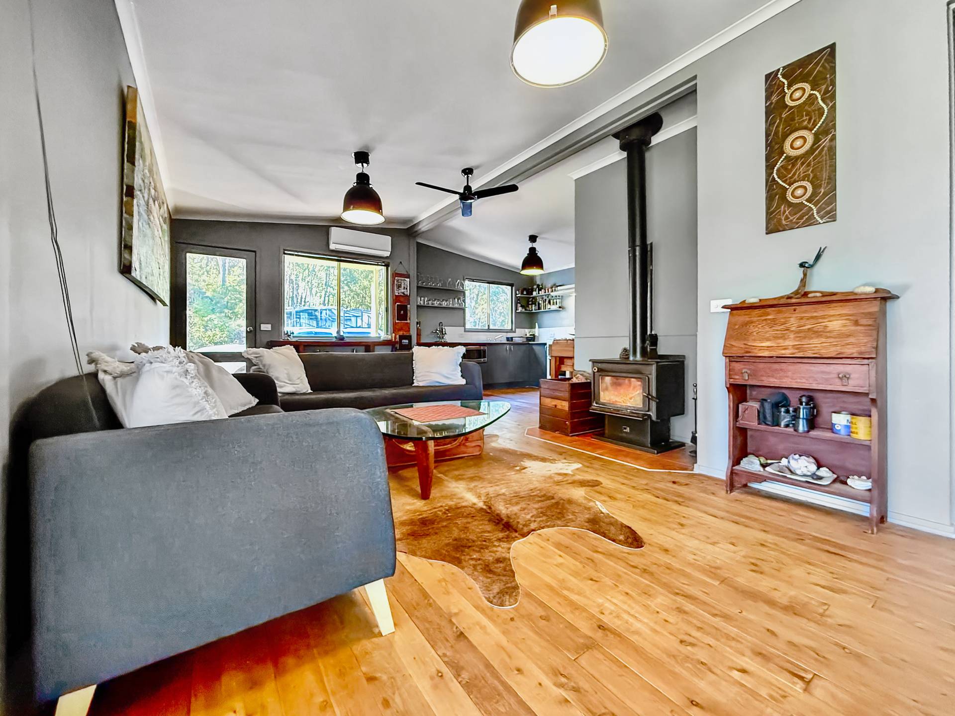 An off-grid 2-3 bedroom retreat is situated on a grassy plateau with superb views to the North and West. Featuring timber floors, reverse cycle air conditioning, two bedrooms with built-in-robes, an oversized 3rd bedroom could also be a great extra living room, one main bathroom, an internal laundry, timber kitchen and generous living room with a slow combustion fireplace leading onto a large undercover deck perfect for entertaining and watching the sun go down.