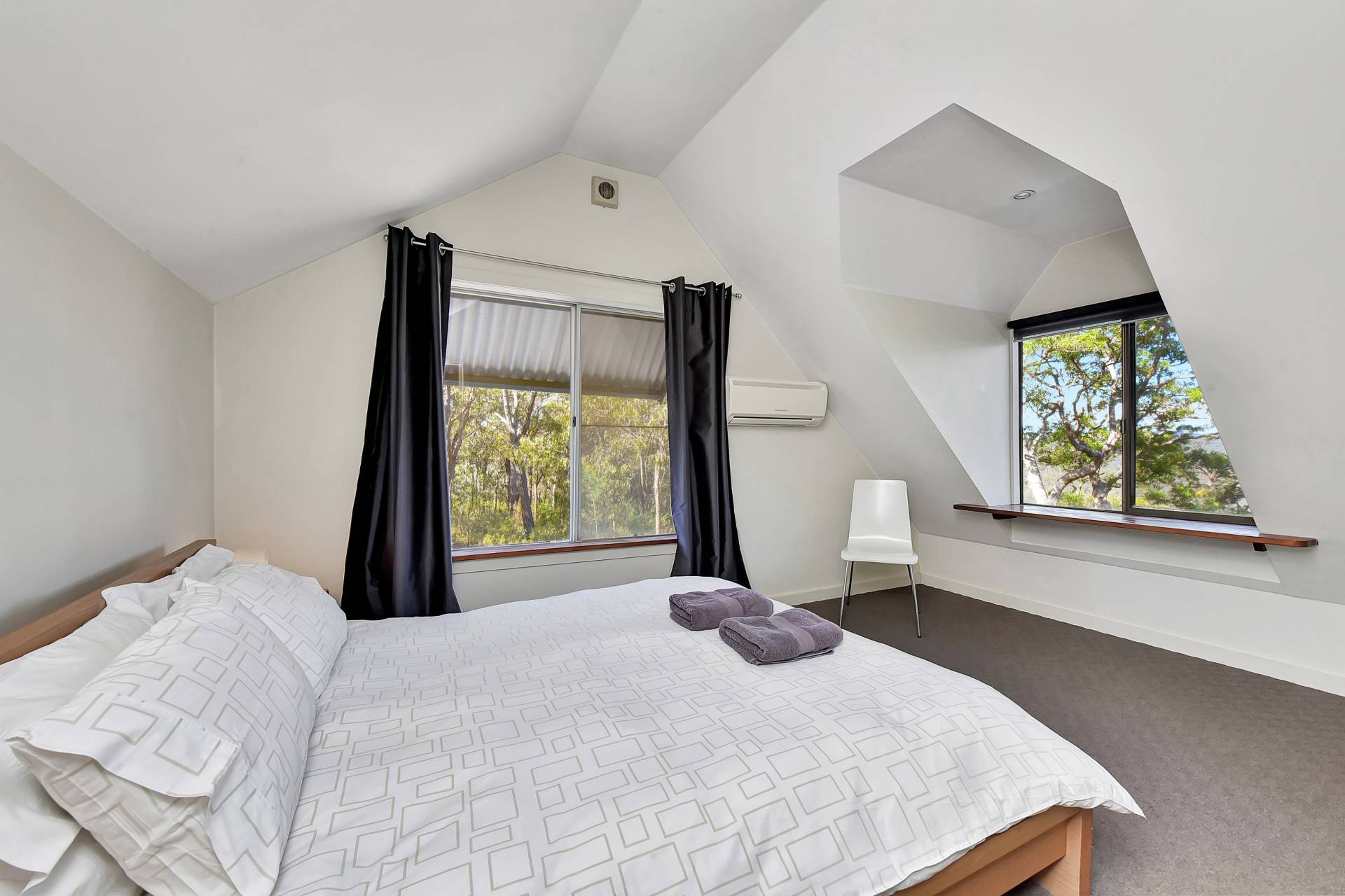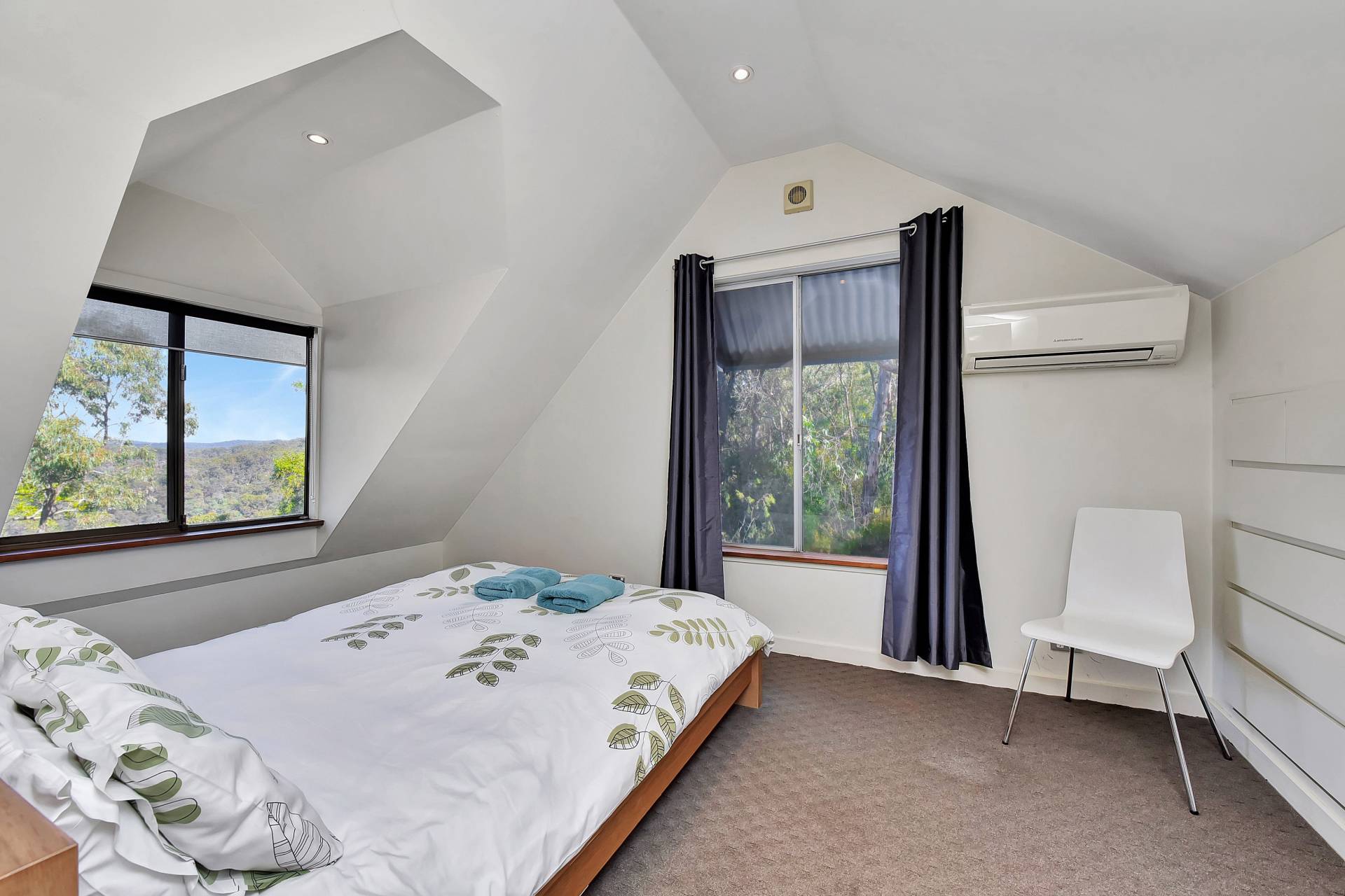 Two bedrooms with built-in storage are situated on the second storey with gorgeous high gabled ceilings and windows framing the postcard-like view. Downstairs is open and light, featuring a sizeable kitchen, dining room and living spaces along with a large, modern bathroom.