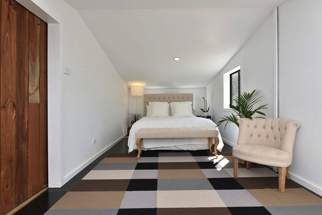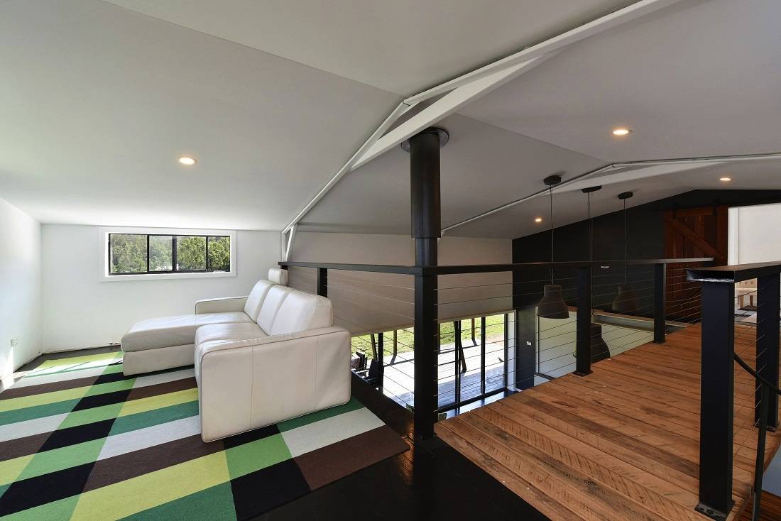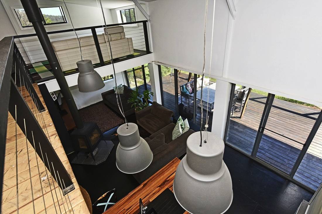 A unique industrial inspired shed conversion encapsulates black, white, timber and steel. The north facing hard wood veranda sits high over the valley breathing in the beautiful pasture below and mountain bush views. The stylish industrial and rustic notes do not compromise on the mod cons of a 5-star fit out throughout. Cast your eyes upward to the centrepiece - a hardwood timber and steel bridge connects a second open living area and master bedroom on the mezzanine level.