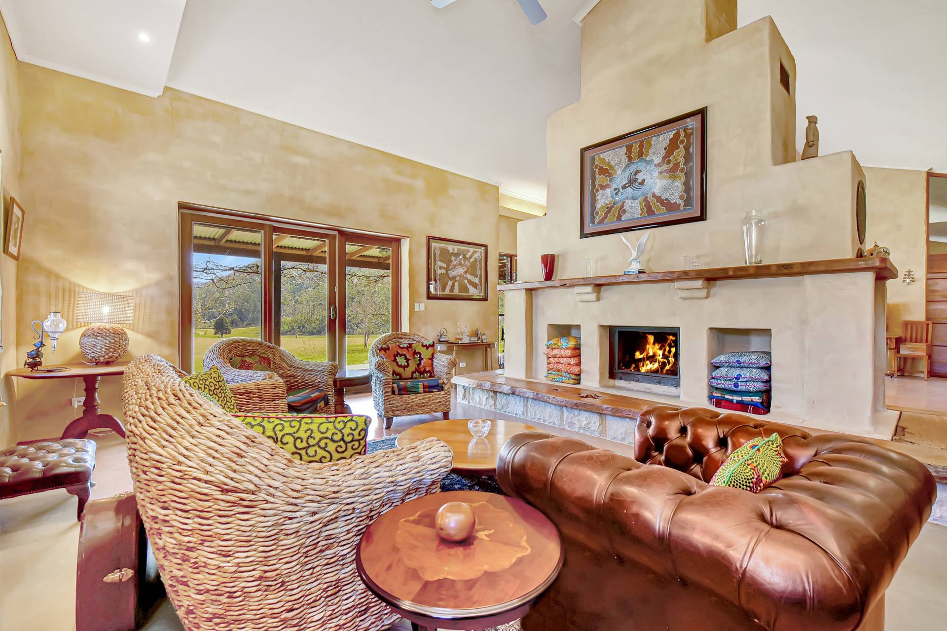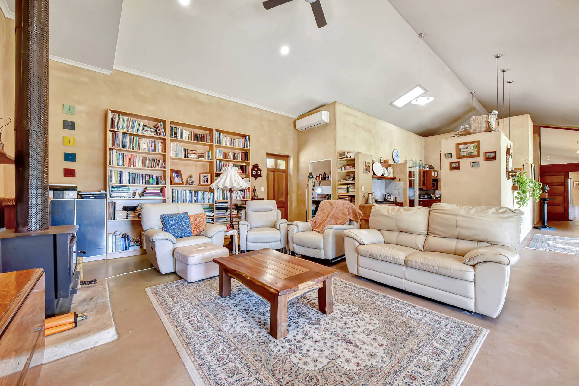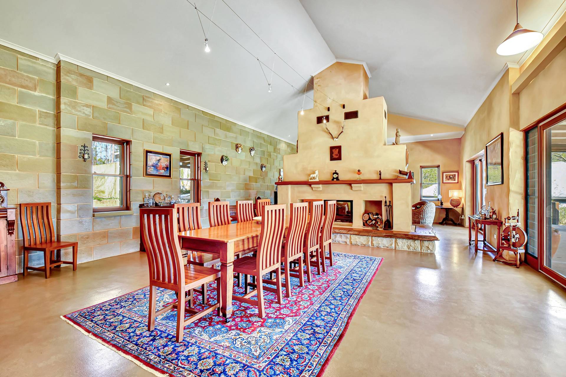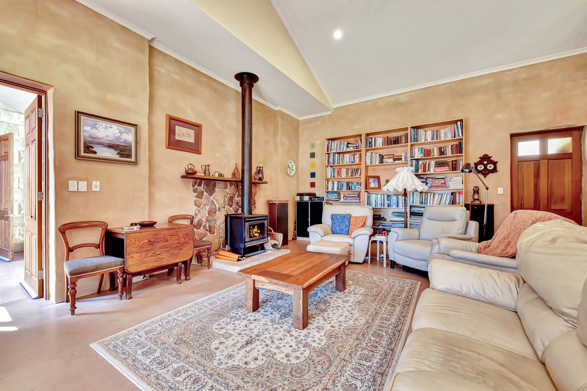 Entering the main homestead, you will instantly appreciate high 4-5m gabled ceilings creating the sense of grand open space. Custom designed, the house is light filled and one of a kind, with low maintenance concrete epoxy flooring, adobe rendered walls and timber features throughout. A highlight inside is a huge dining and living space with a gorgeous double-sided fireplace which can function as an open fire or slow combustion with built in firewood storage and a hand-crafted thick timber surround allowing everyone to sit around the fire and enjoy the ambience this beautiful home provides.