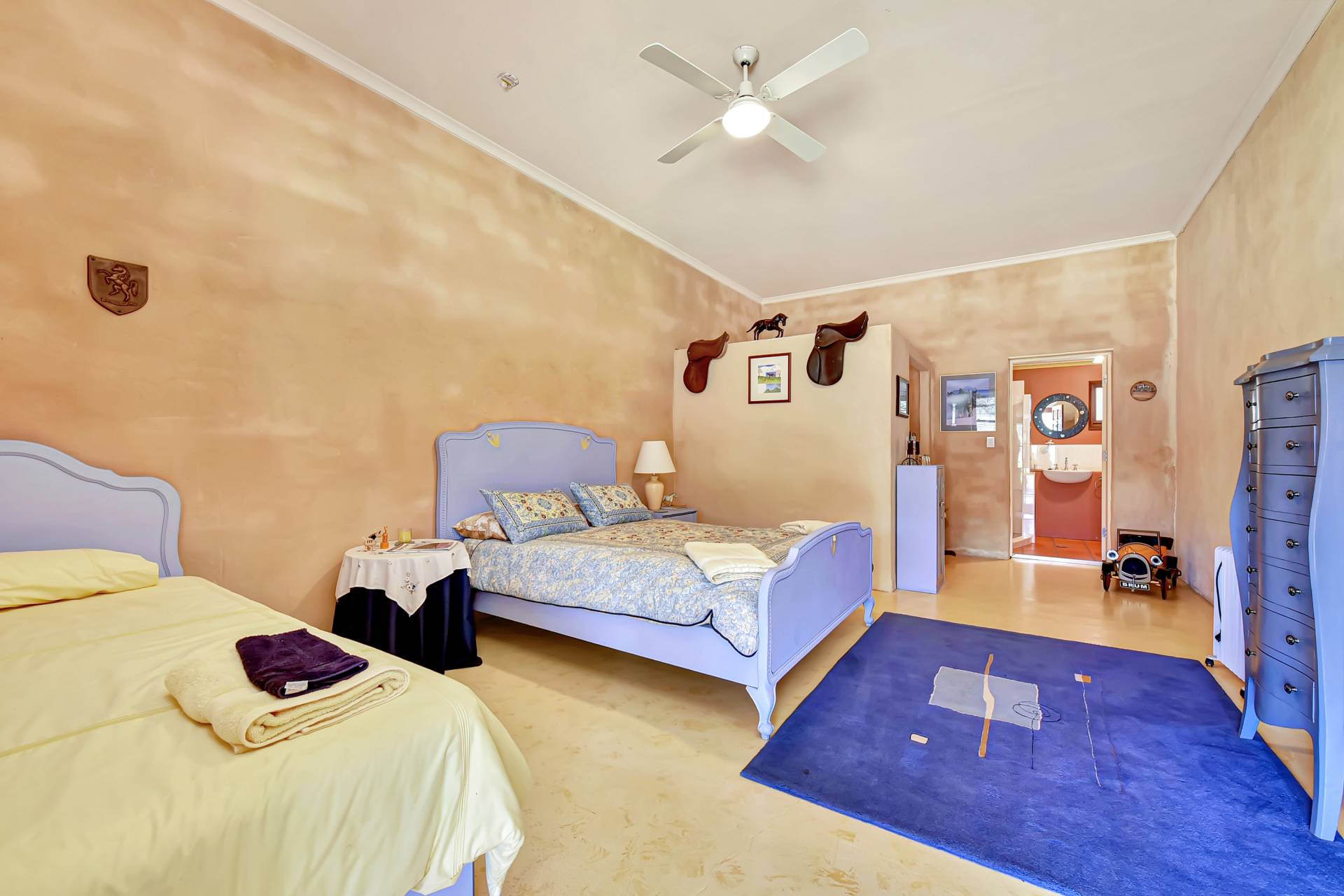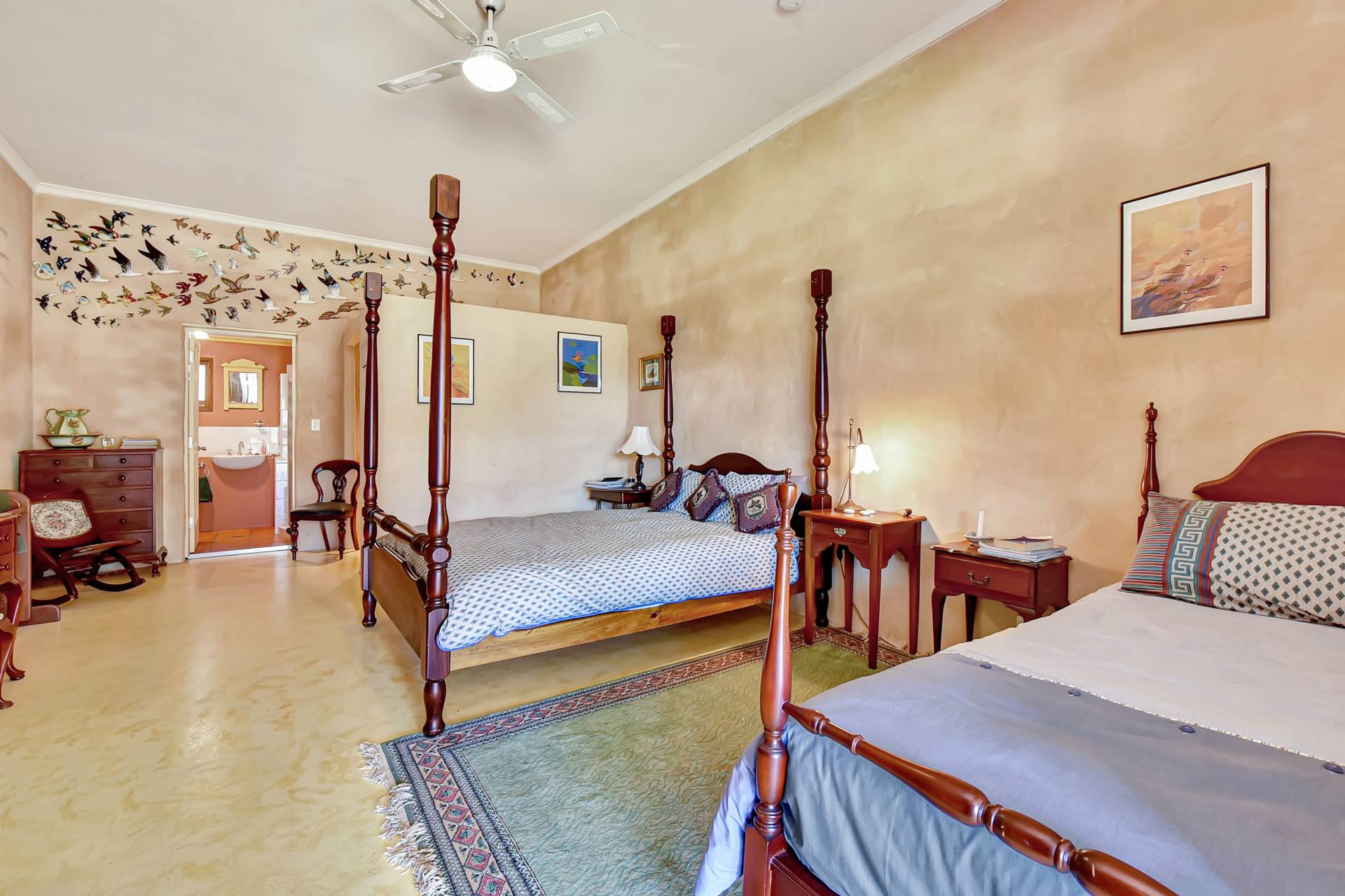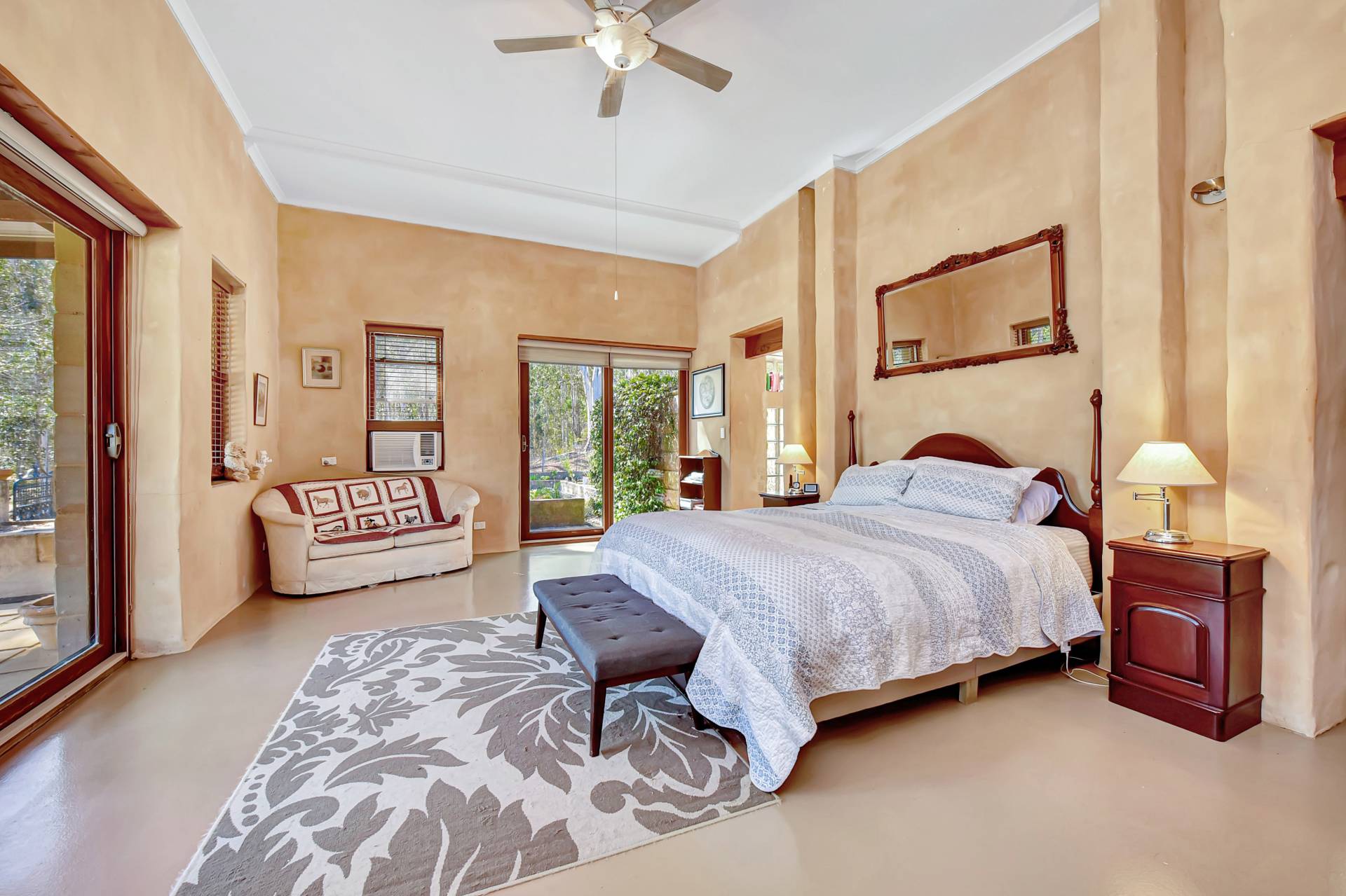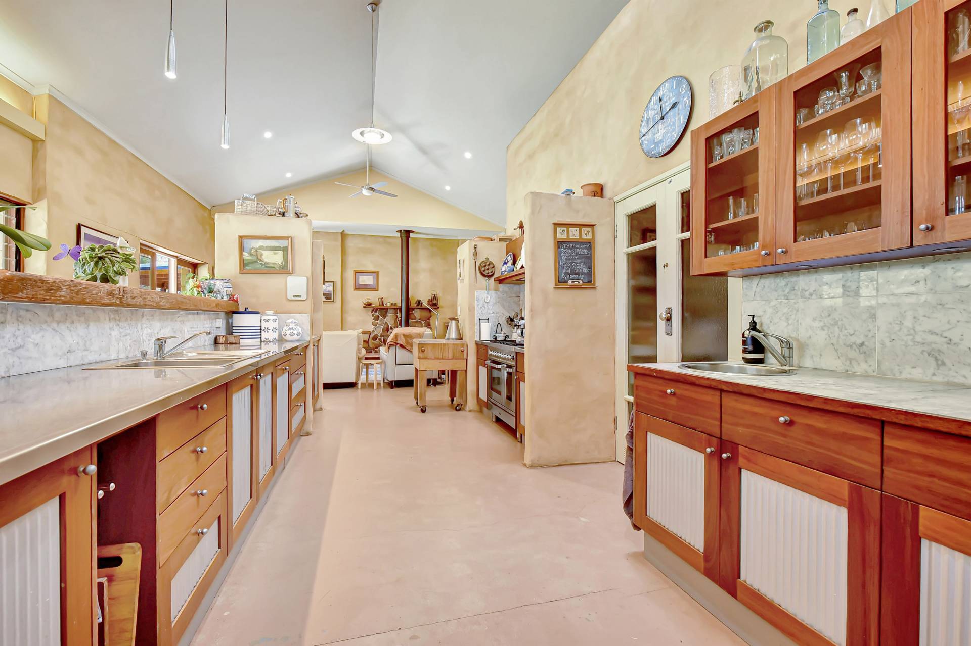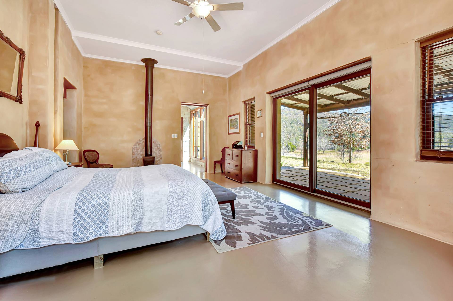 Entering the main homestead, you will instantly appreciate high 4-5m gabled ceilings creating the sense of grand open space. Custom designed, the house is light filled and one of a kind, with low maintenance concrete epoxy flooring, adobe rendered walls and timber features throughout. A highlight inside is a huge dining and living space with a gorgeous double-sided fireplace which can function as an open fire or slow combustion with built in firewood storage and a hand-crafted thick timber surround allowing everyone to sit around the fire and enjoy the ambience this beautiful home provides.