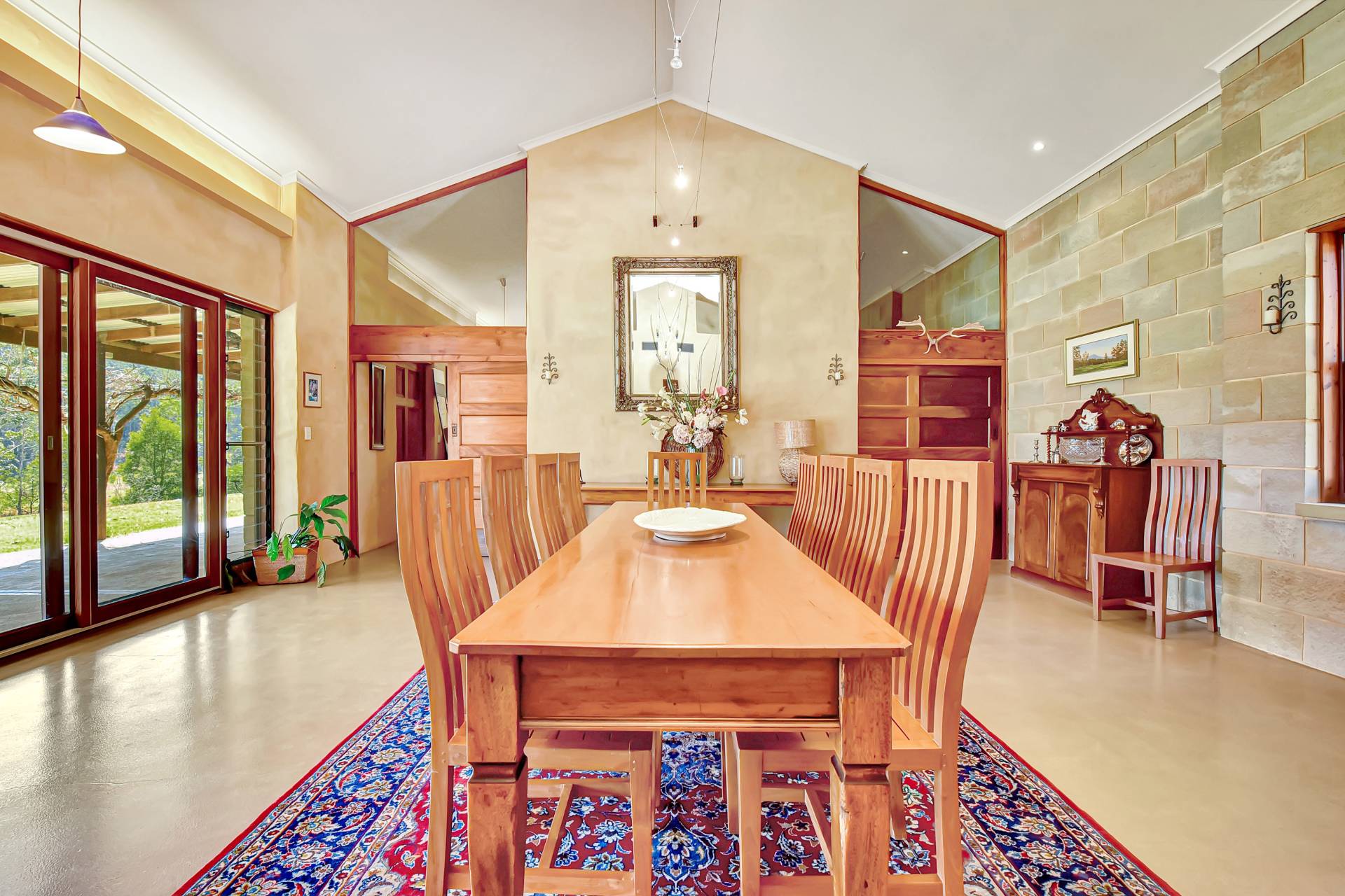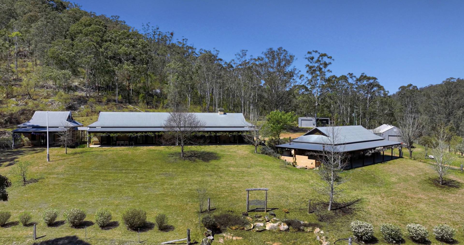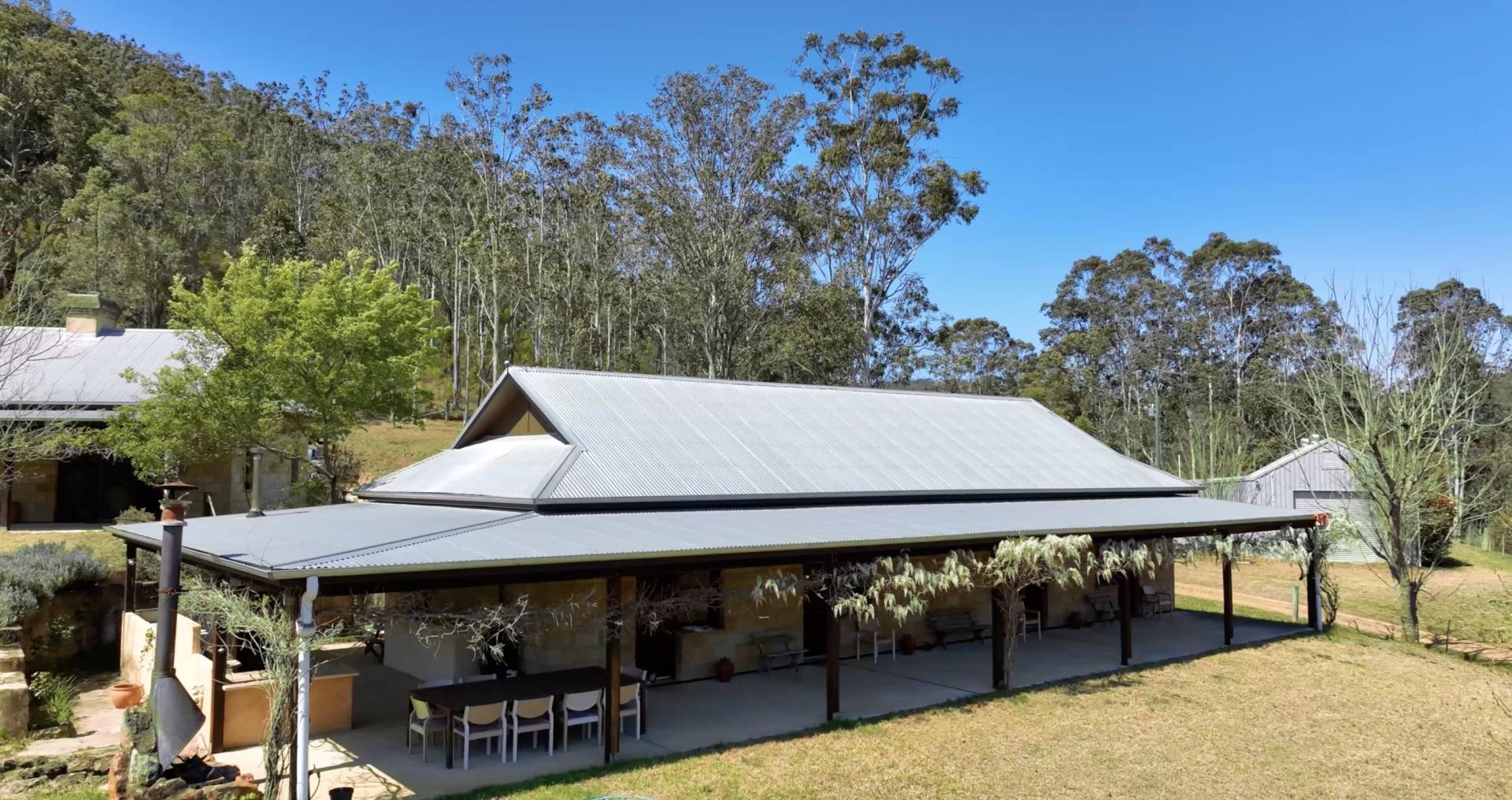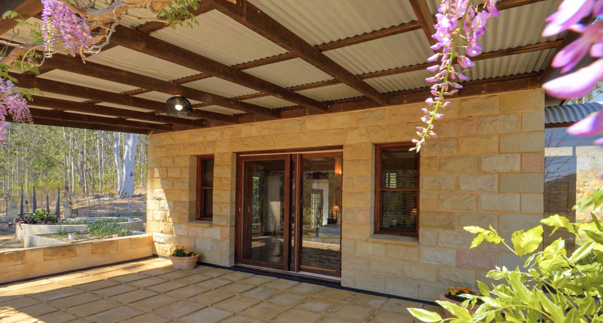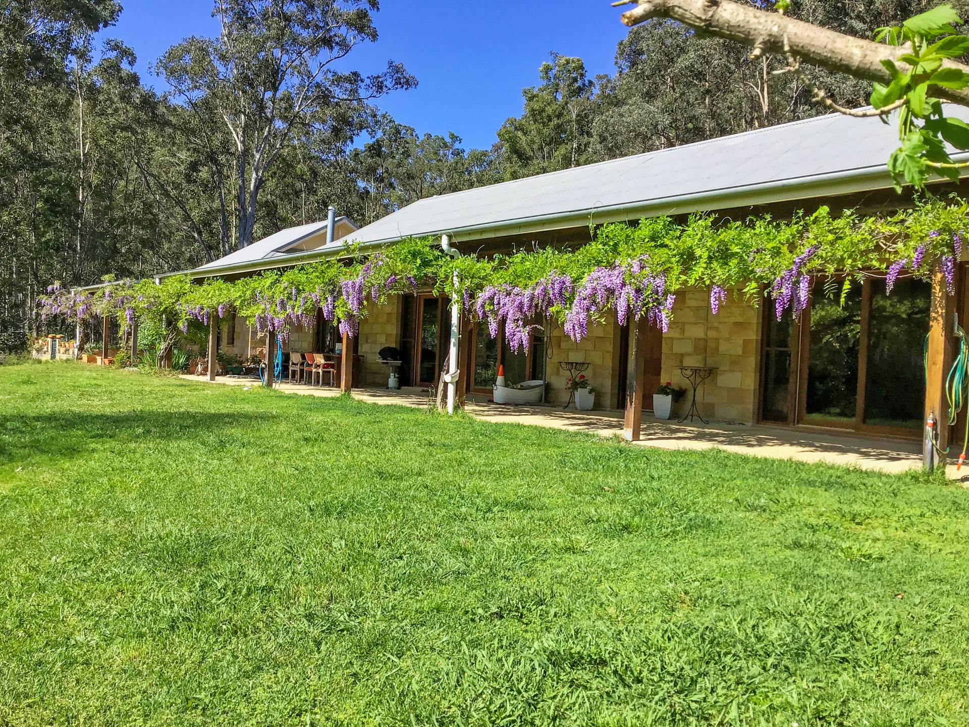 Uniquely designed, the property consists of a main homestead and separate guest pavilion nearby. Extra wide undercover verandahs are a highlight of both buildings providing ample space to entertain all year round and enjoy the stunning view with aromatic wisteria vines lining the eaves to provide shade in Summer and plenty of sun in Winter.