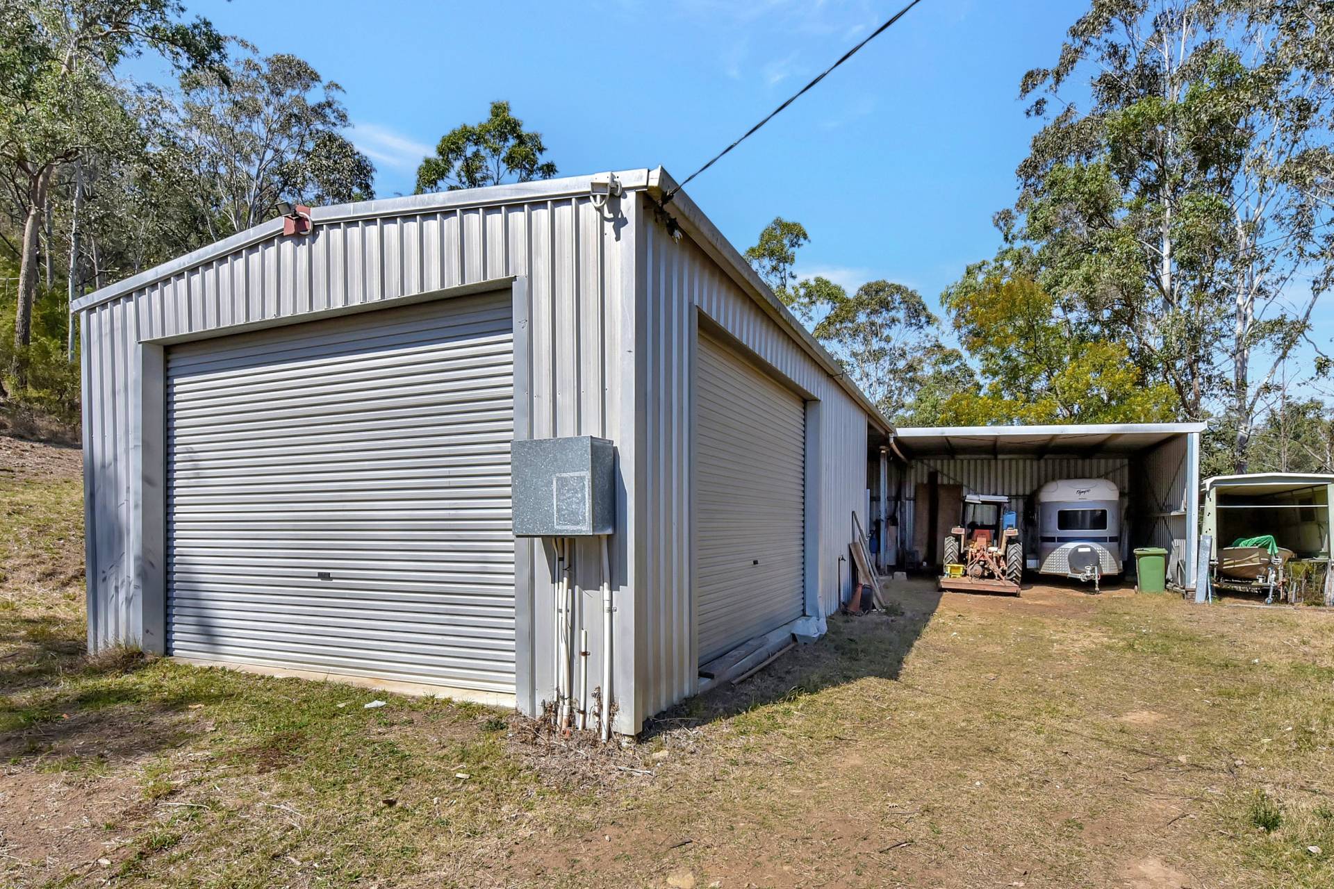 Two large farm sheds are situated near the house area, one of which includes a large mezzanine, fireplace, two bathrooms and undercover outdoor area while also incorporating four horse stables. The other farm shed has lots of space for equipment and tools with a lock up workshop, two roller doors and a large open bay section ideal for tractors, mowers and other farm toys. Both sheds are on a concrete slab with mains power connected.
