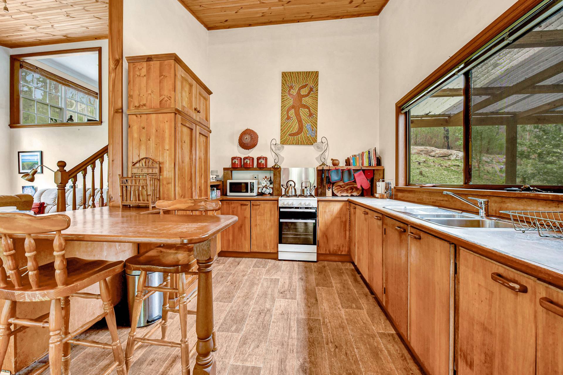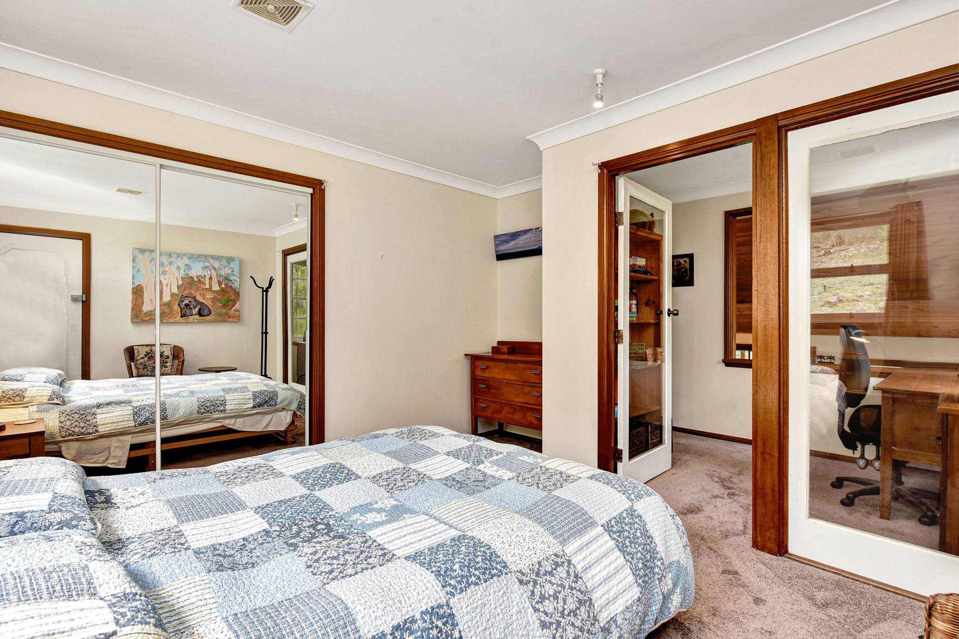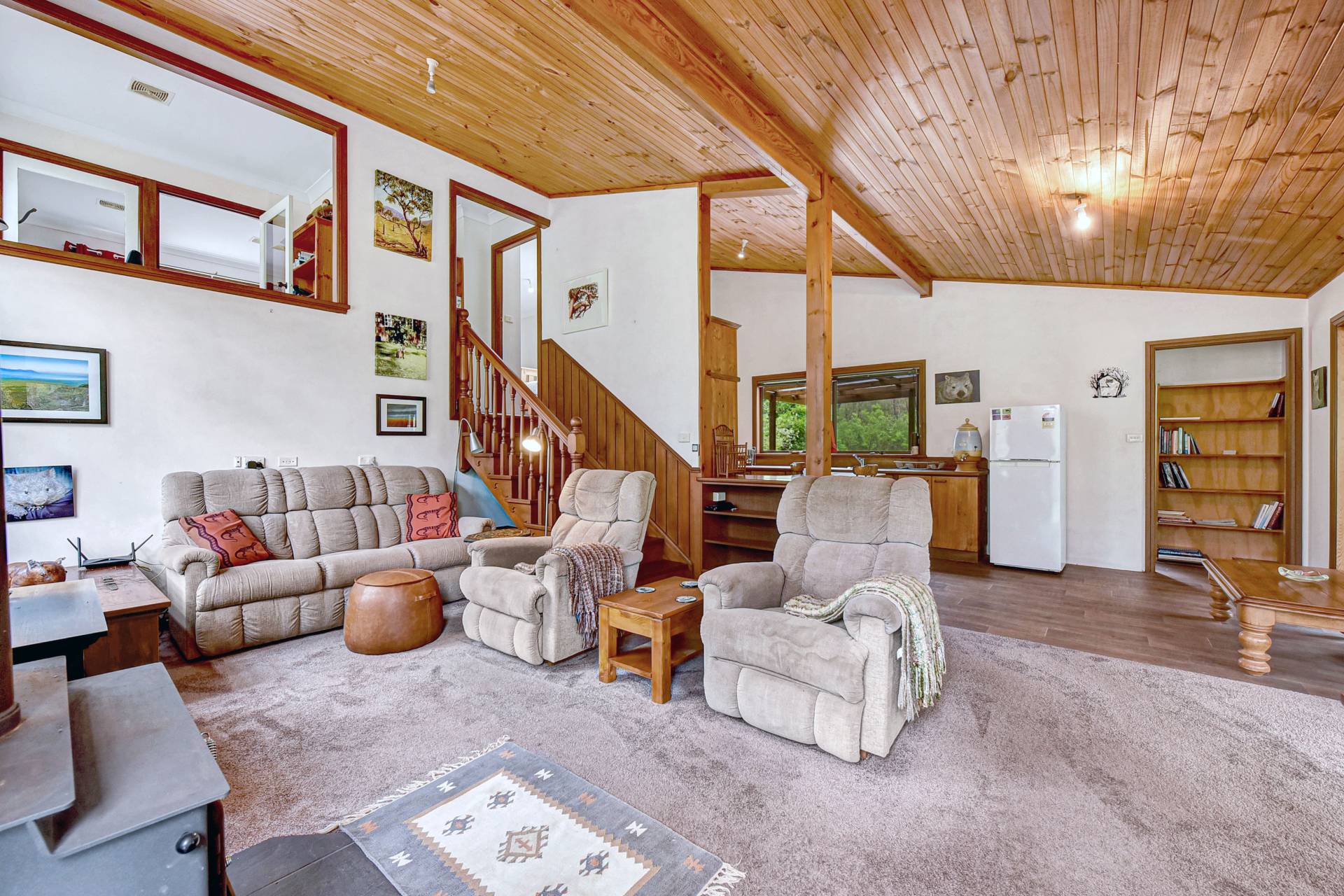 The spacious homestead has high raked ceilings and timber features throughout. A north facing undercover decking area is the perfect place to sit back, relax and watch the wildlife frolic around in your own back yard! A fully equipped sizeable timber kitchen has a gas stove and plenty of cupboard storage and adjoins an open plan living area which has a slow combustion fireplace for the winter months and split system reverse cycle air conditioning. The floor plan is split level with the bedrooms and open study nook located upstairs. A large, combined bathroom/laundry has a separate bath and shower. Another undercover deck area provides the perfect private location to read a book or a place to just chill out on your own. An outdoor timber studio has been designed for garden dining and is the perfect place for a Sunday afternoon BBQ with family and friends.