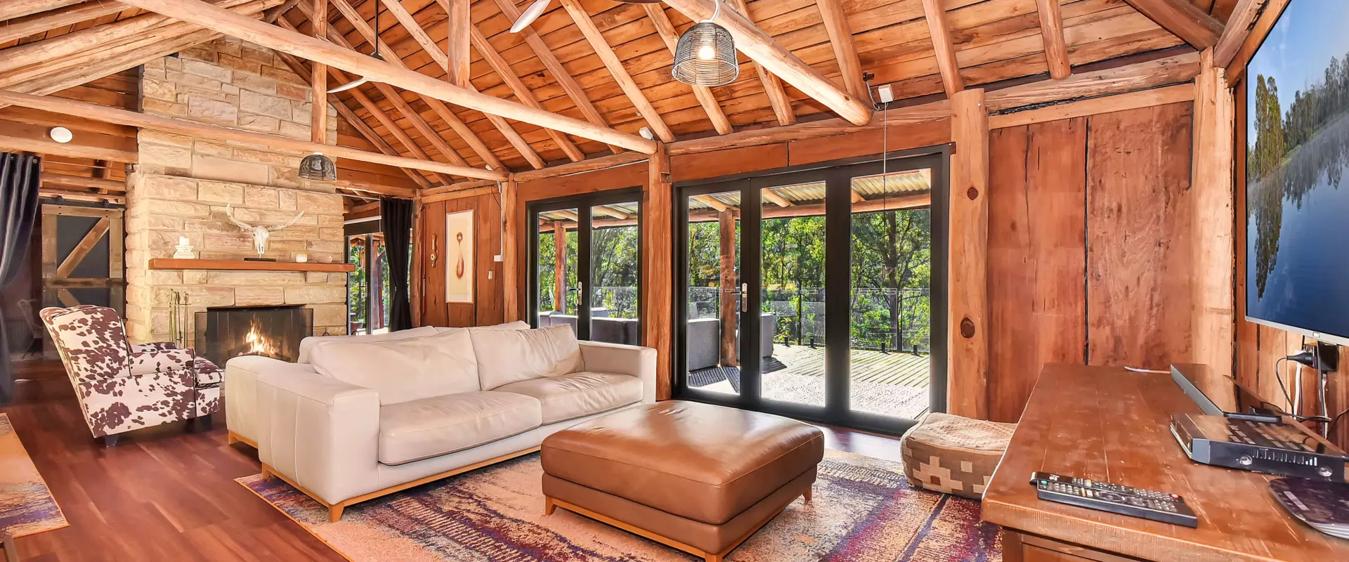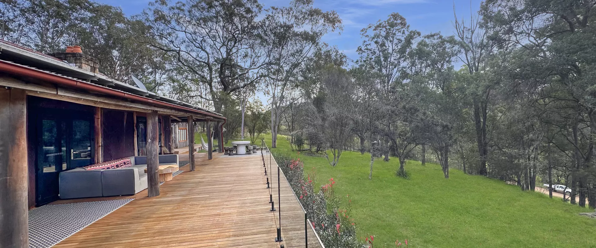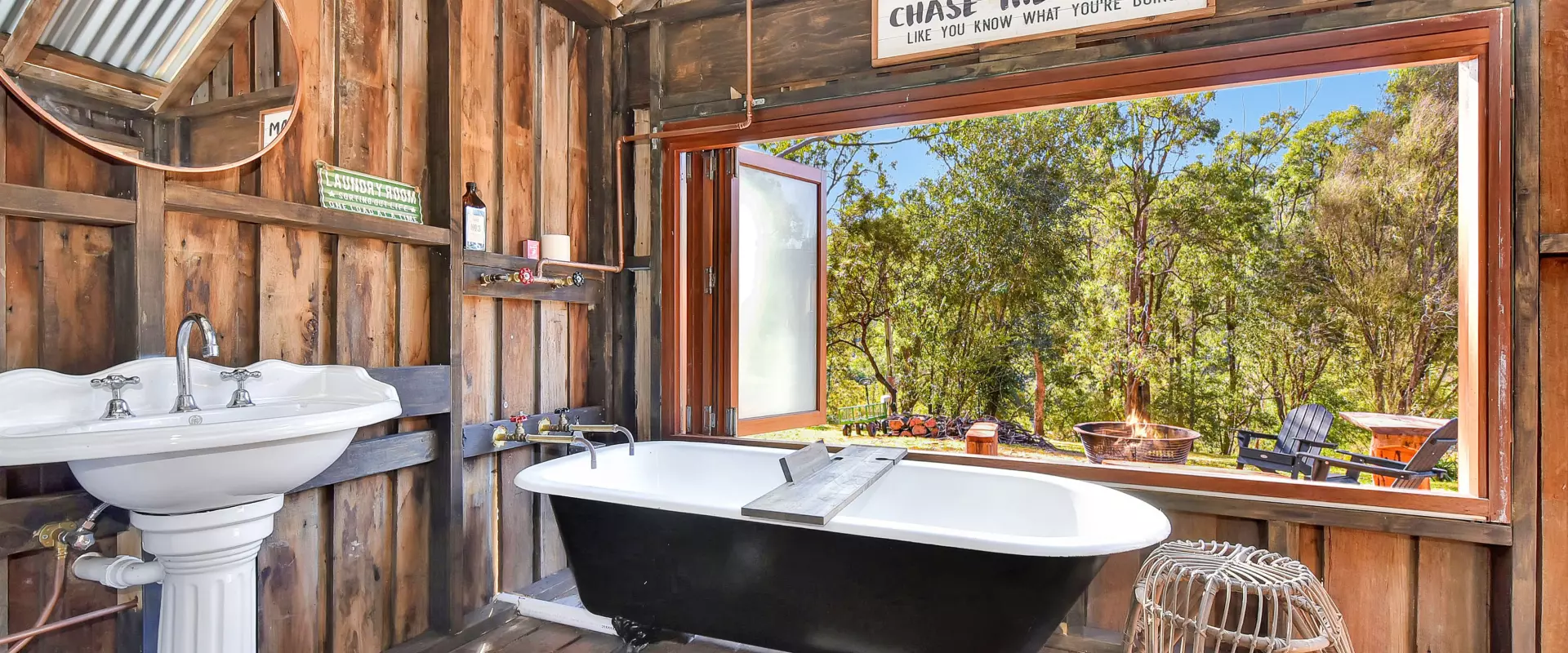The three bedrooms all have access out onto a huge entertainment deck which looks over the grassy plateau surrounds, fringed with natural bushland and stunning rock formations. There is a main bathroom with separate bath, shower and toilet plus an additional outside bath house with another shower, toilet and a large, gorgeous window which opens out, letting in the views of nature as you soak away in a big free-standing bathtub!