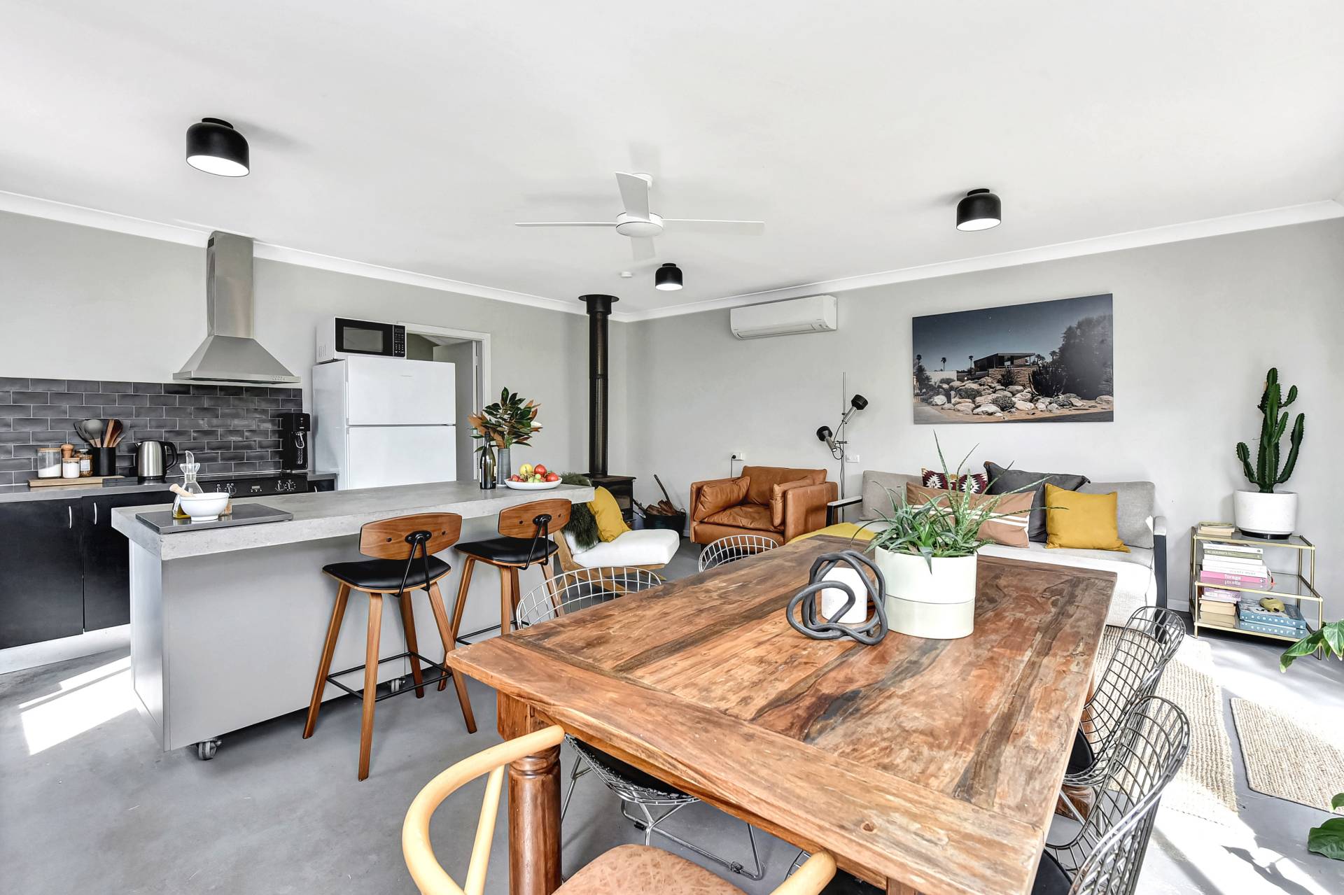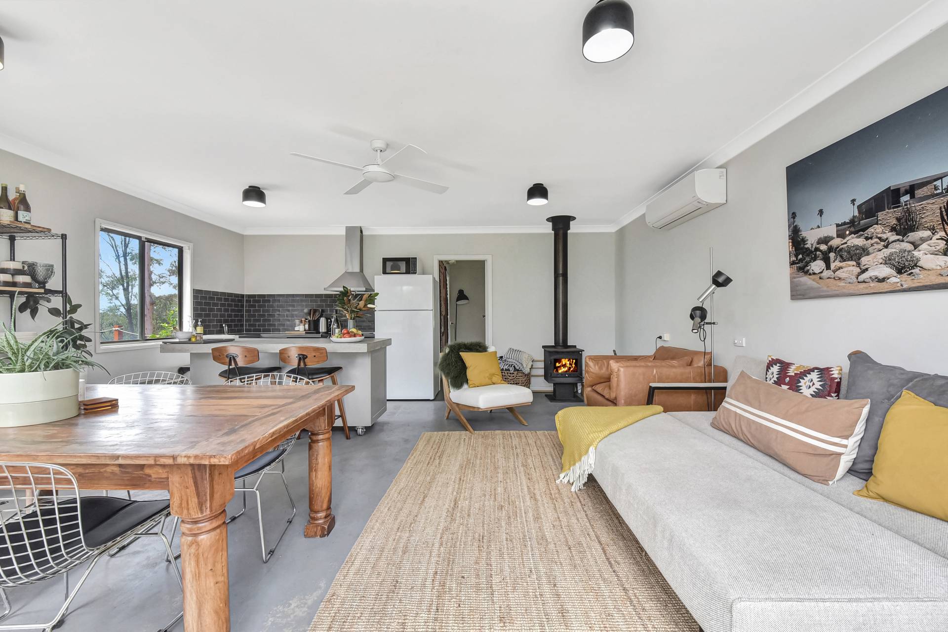 The cosy retreat/shed conversion comprises a main spacious open area fully equipped with a modern kitchen, living and dining space featuring a slow combustion wood fire. A tastefully renovated ensuite & laundry are accessed off the bedroom while a separate powder room with 2nd toilet has direct access from outside. All on a single level concrete slab, the retreat is very low maintenance and ideal as a weekender or BnB.