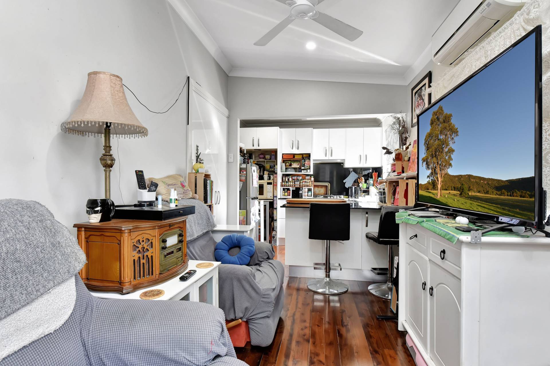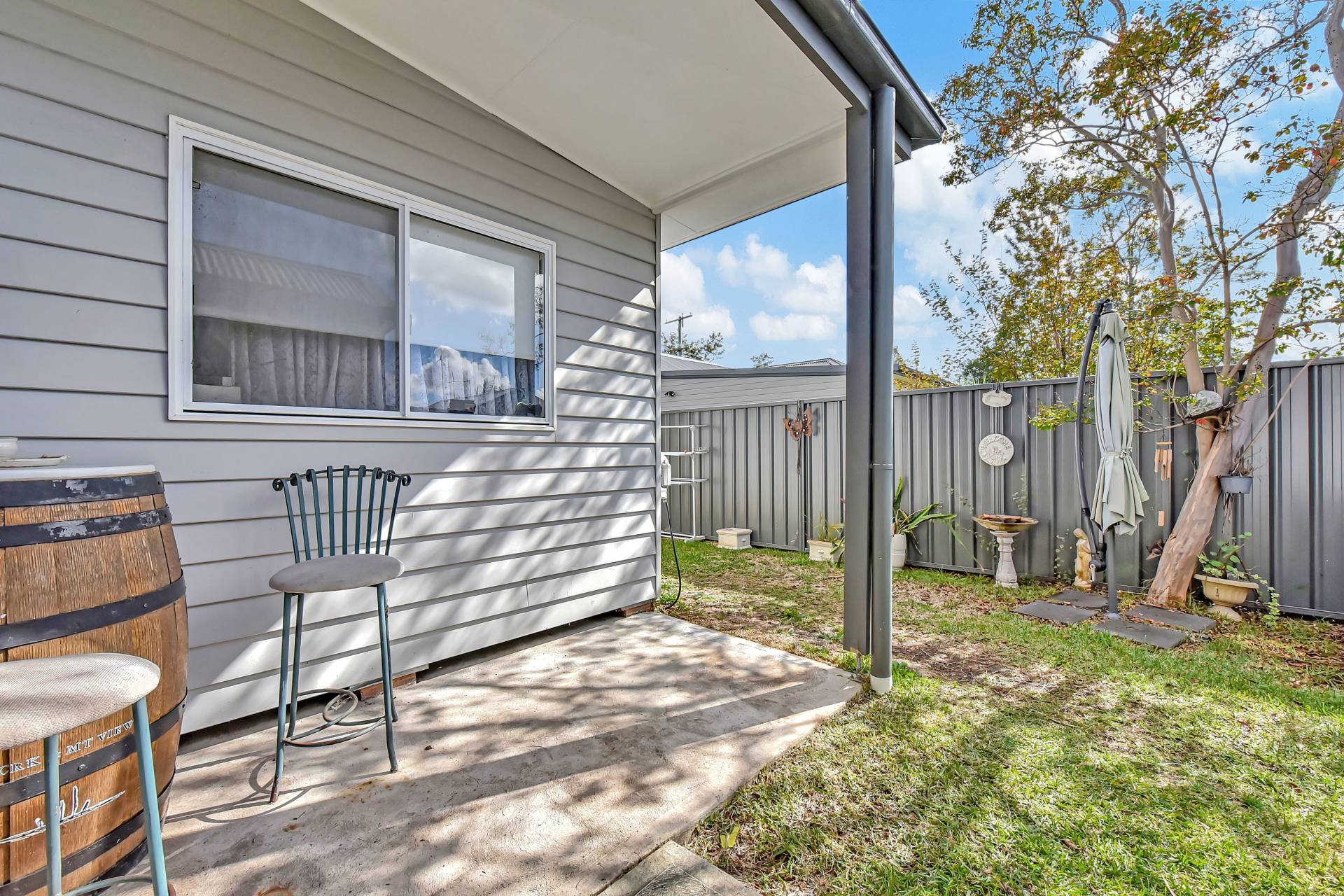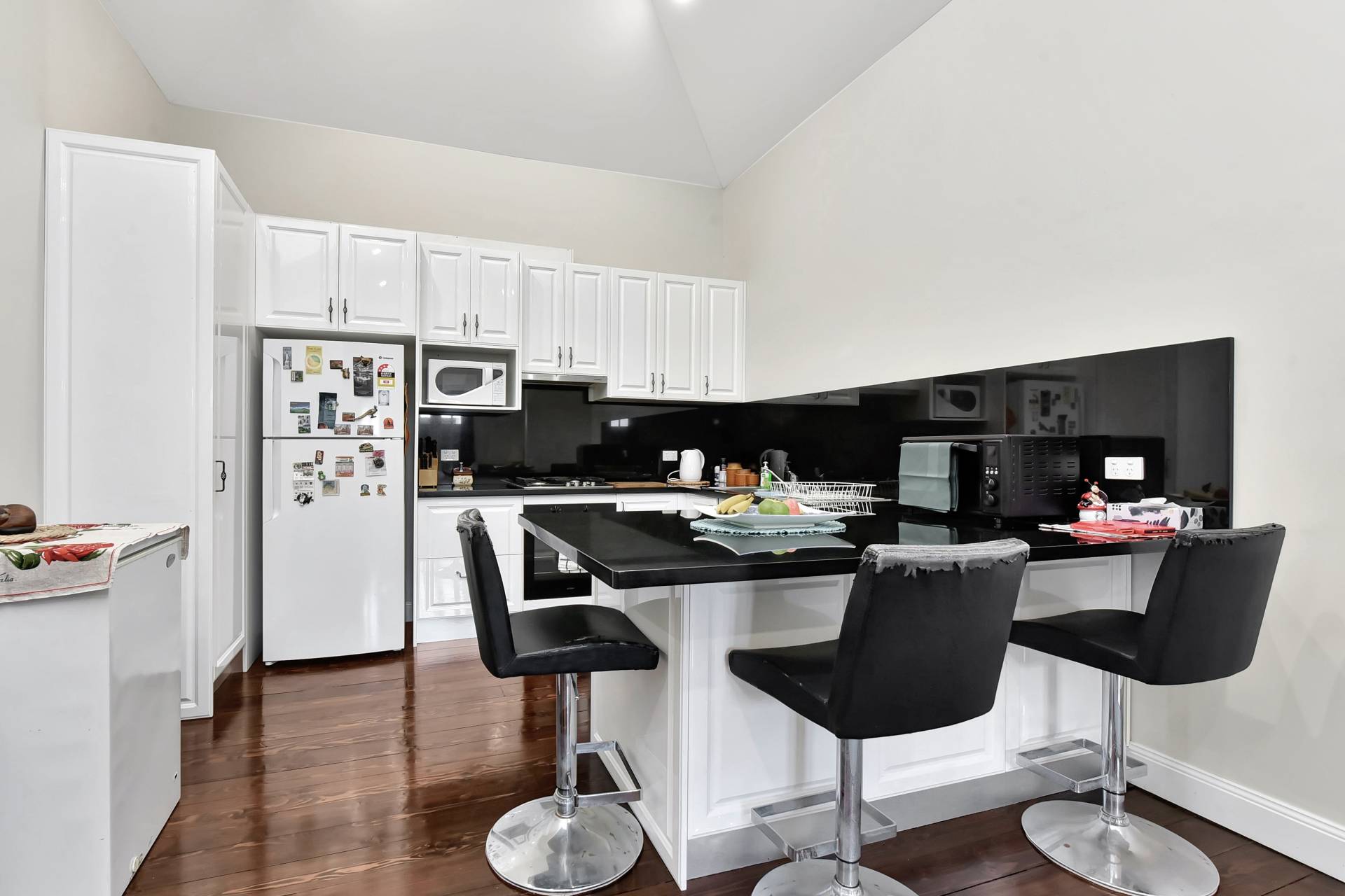 The main house features original polished timber floors, while the rest of the house has been tastefully renovated with a stunning cathedral ceiling in the main living and kitchen area with downlights and a light and modern colour palette flowing through the home. The contemporary kitchen has a large breakfast bar with granite benchtops and lots of storage. A well-designed bathroom is combined with the laundry at the rear of the house with easy access to the backyard. All three bedrooms are a good size, and each has built in wardrobes and a ceiling fan while a reverse cycle air conditioner is in the main living room.
