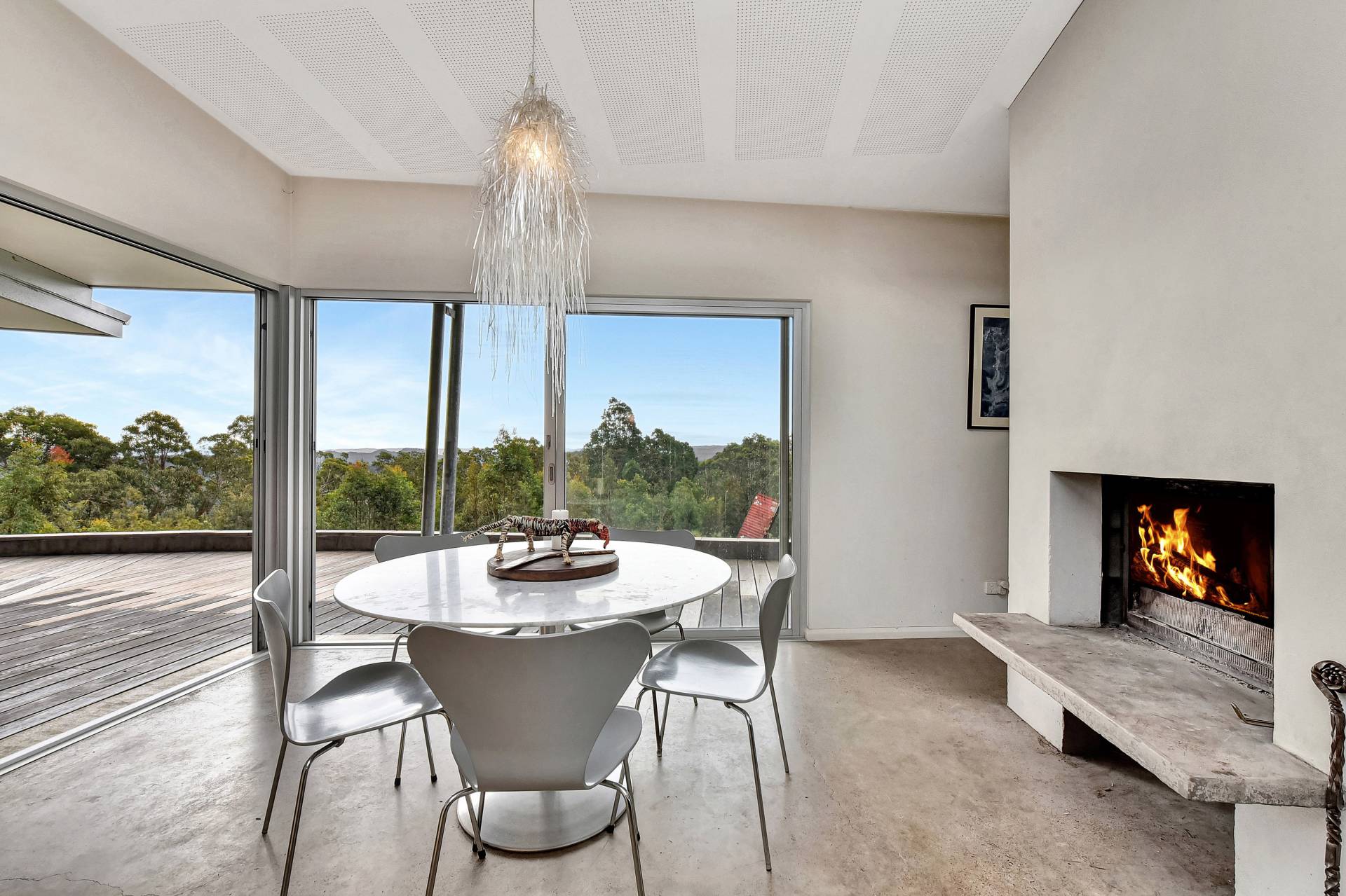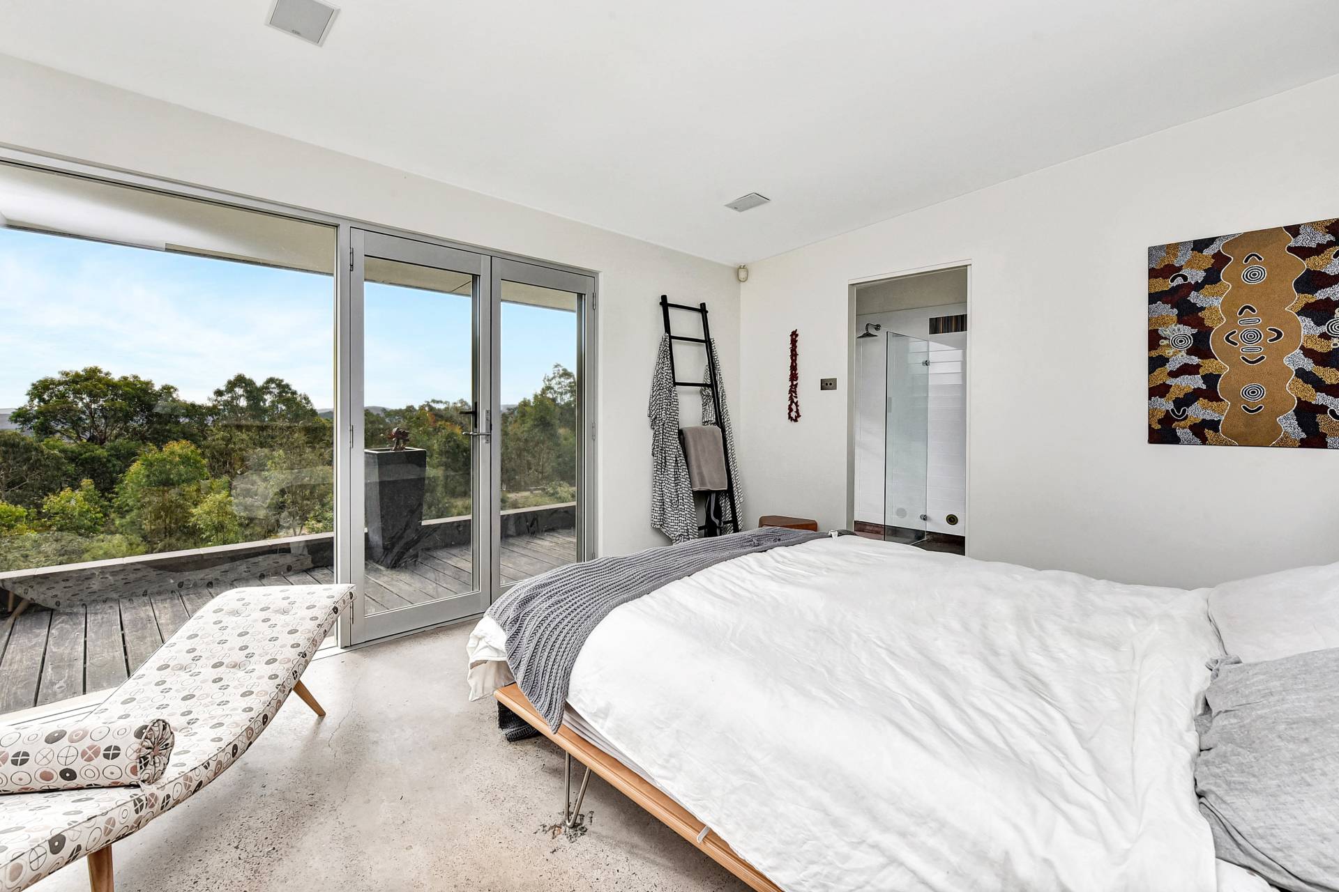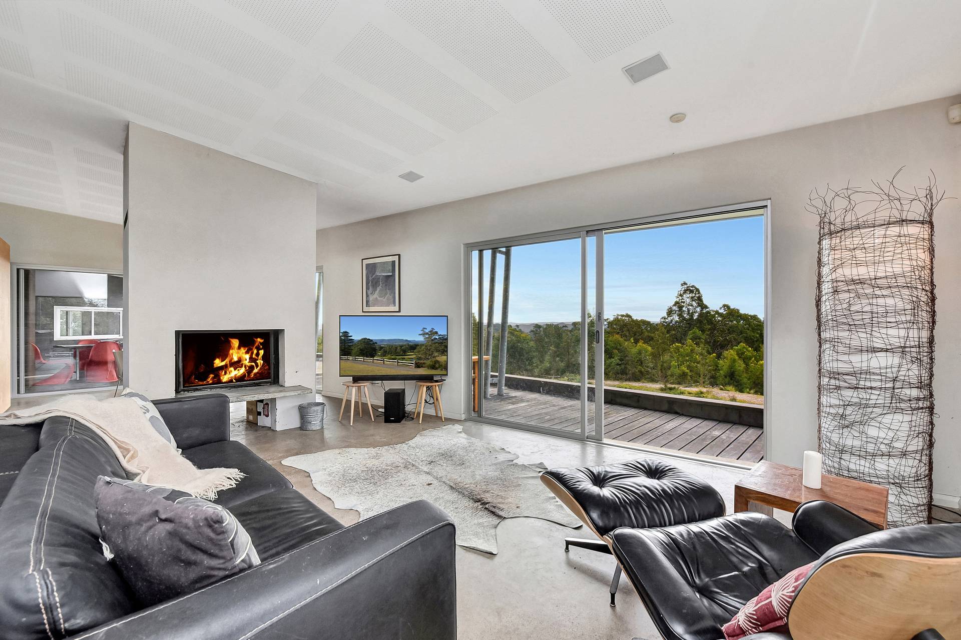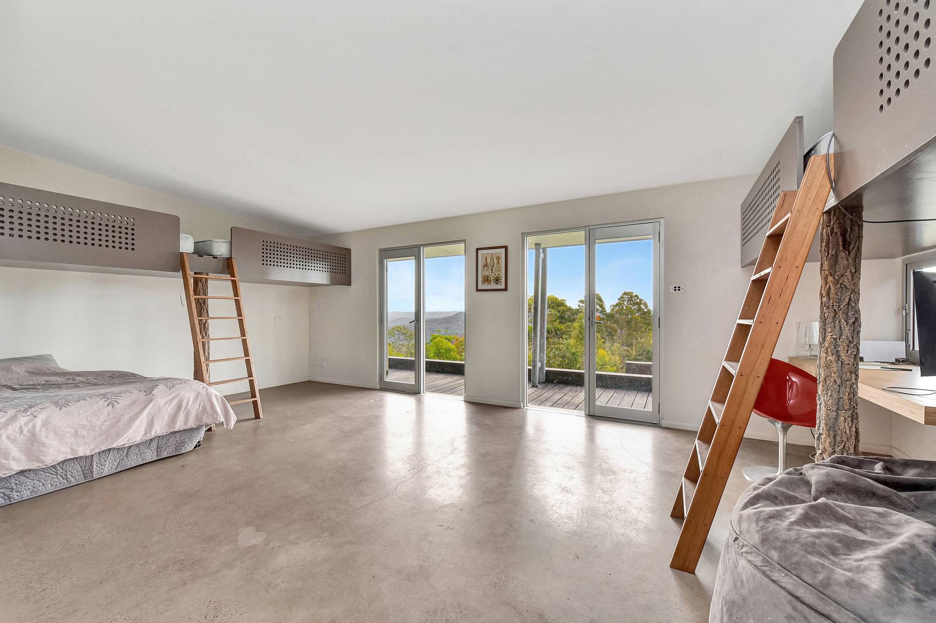 With a north facing aspect the custom-built homestead, built on an incredible, irreplaceable hill top ridge takes advantage of a solar passive lifestyle with an off grid set up, complete with massive water storage, bush fire sprinkler protection and PV power providing all the amenities of the life you want retreat from, away from the crowds and traffic.  Sun drenched extensive hardwood timber verandahs encompass the length of the house and are the perfect viewing platforms to take in the scenic elevated views. The living areas are open plan with large sunlit windows, allowing the wilderness surrounds to come inside. A double-sided fireplace services the living and dining areas and adjoin a simplistic but sophisticated kitchen with hardwood timber bench tops, free standing gas stove and dishwasher. Polished concrete floors and high ceilings are featured throughout the house. Make your way through a breezeway courtyard to another pavilion where the sleeping quarters are located. Here you will find a double sized bedroom that is designed to be two bedrooms if desired. All the bedrooms have access onto the north facing verandah. Stroll down the hallway a little further and there is another bedroom and a modern bathroom with shower and bathtub plus laundry room. A slow combustion fireplace has been strategically positioned recessed midway on the hallway, providing heating to all the bedrooms. The master bedroom with ensuite is located privately with expansive window views to the outside, creating a parent’s haven with access onto the verndahs.