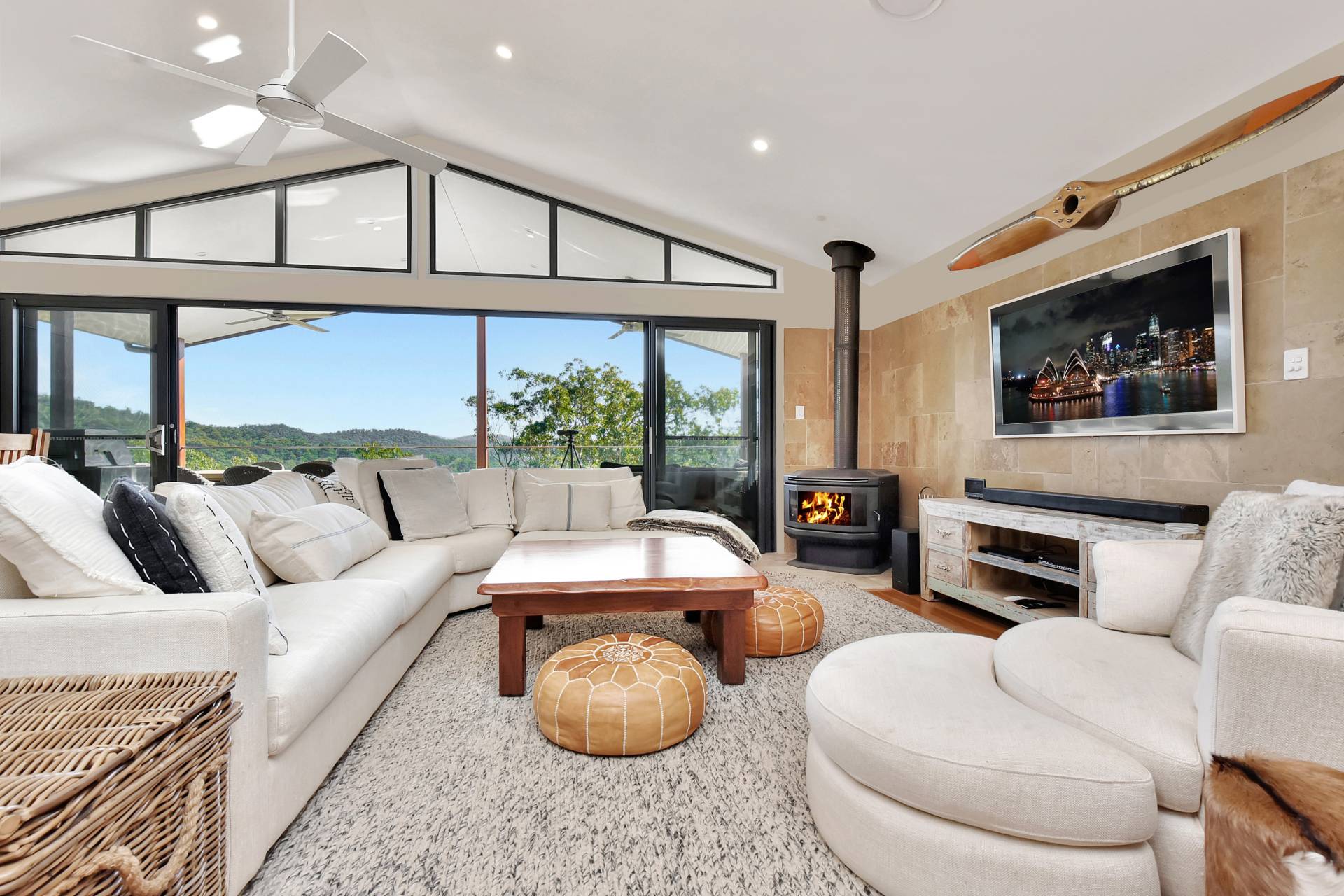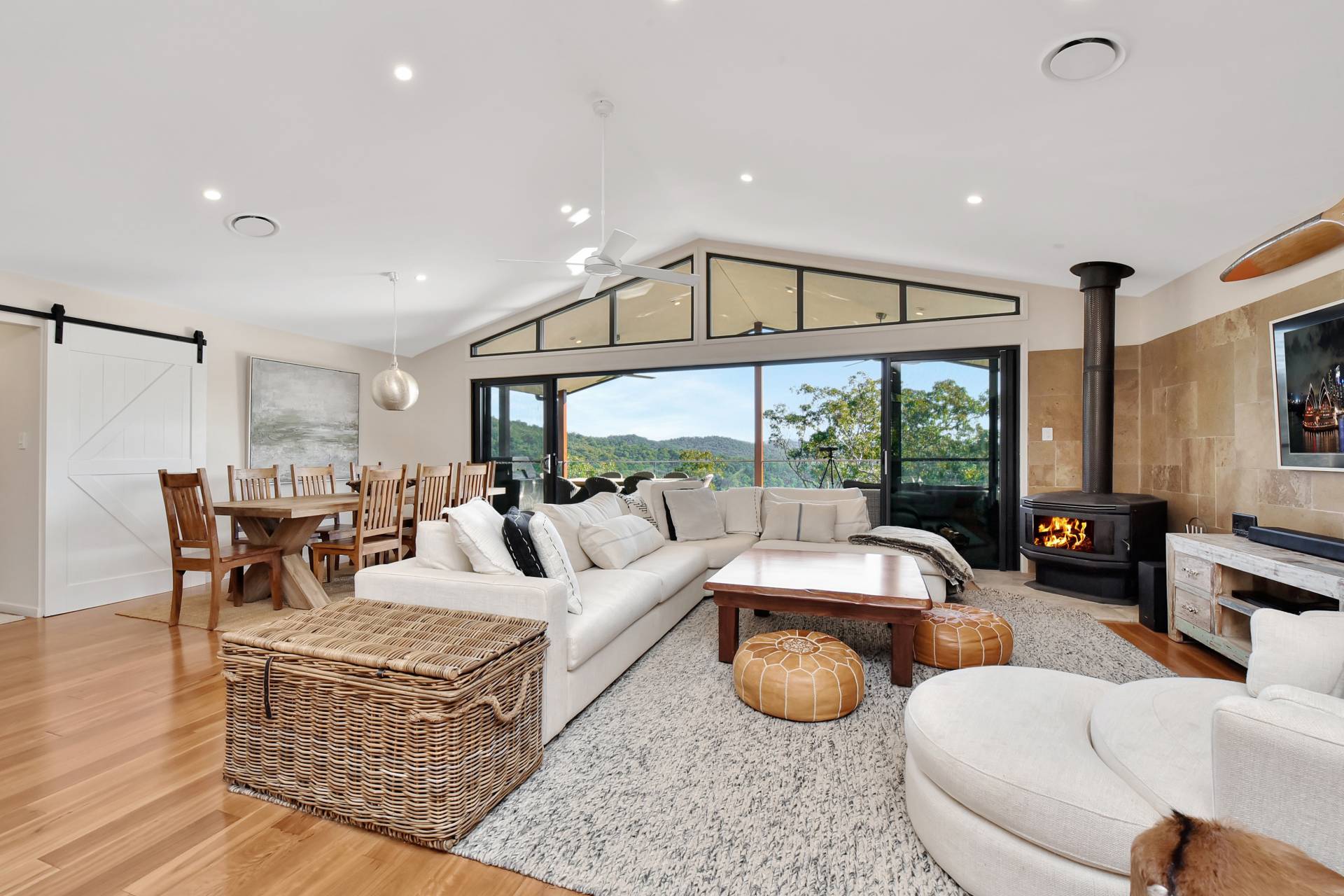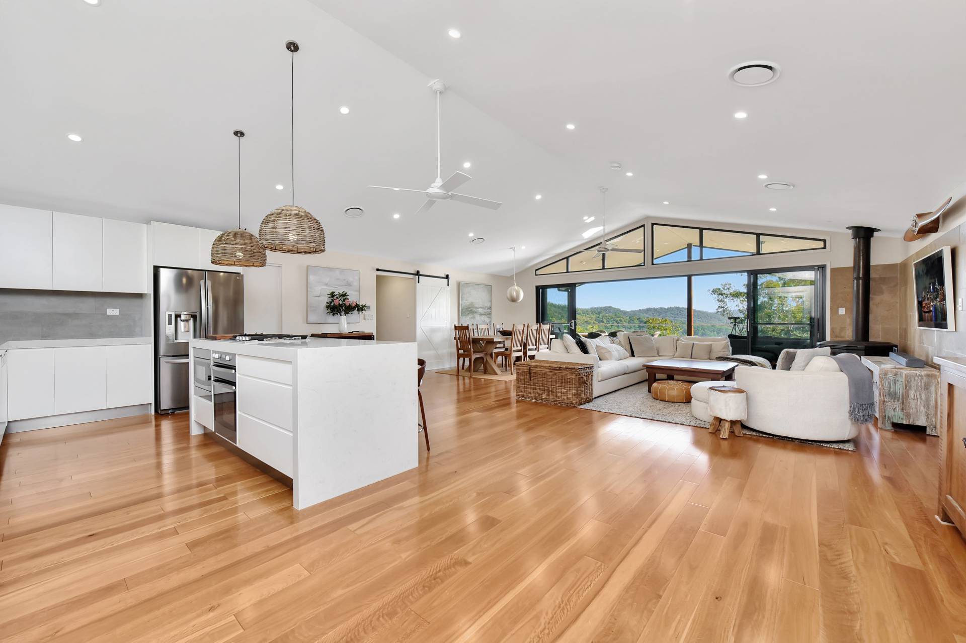 Stepping inside the house through oversized timber double doors and a hardwood boardwalk entry path, you will appreciate the expansive open plan living with high raked ceilings flooded with light from the many windows and full-length stacker sliding doors bringing the outdoors in with a large undercover timber deck perfectly positioned to embrace the stunning mountain views. A sleek quality kitchen has all the bells and whistles including thick stone benchtops, dishwasher, gas stove, walk-in pantry and island bench with seating. A cosy slow combustion fireplace warms the house in the cooler months while also having zoned ducted air-conditioning throughout.
