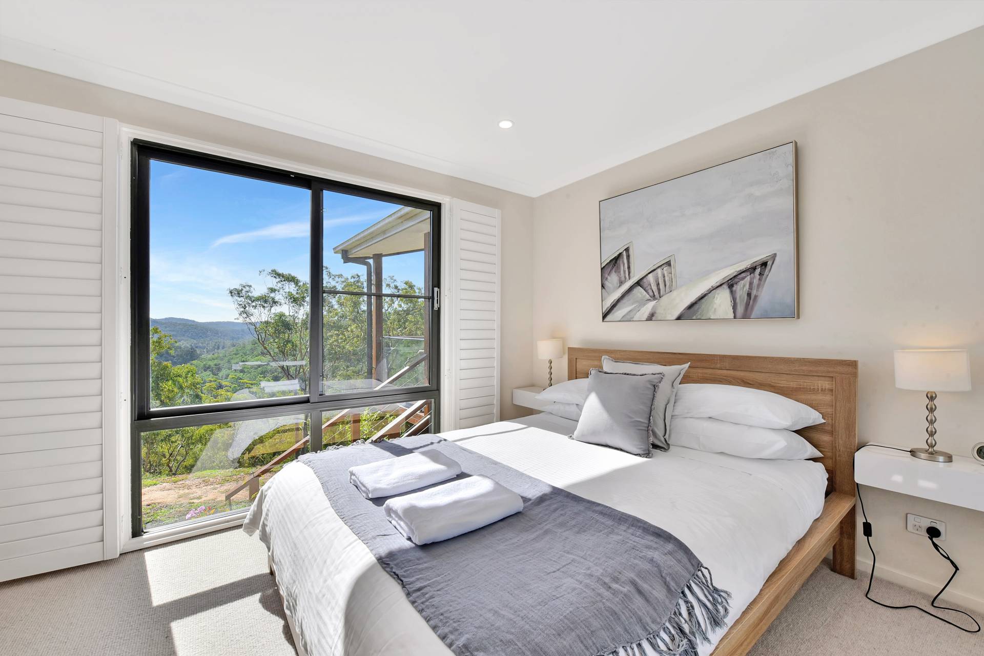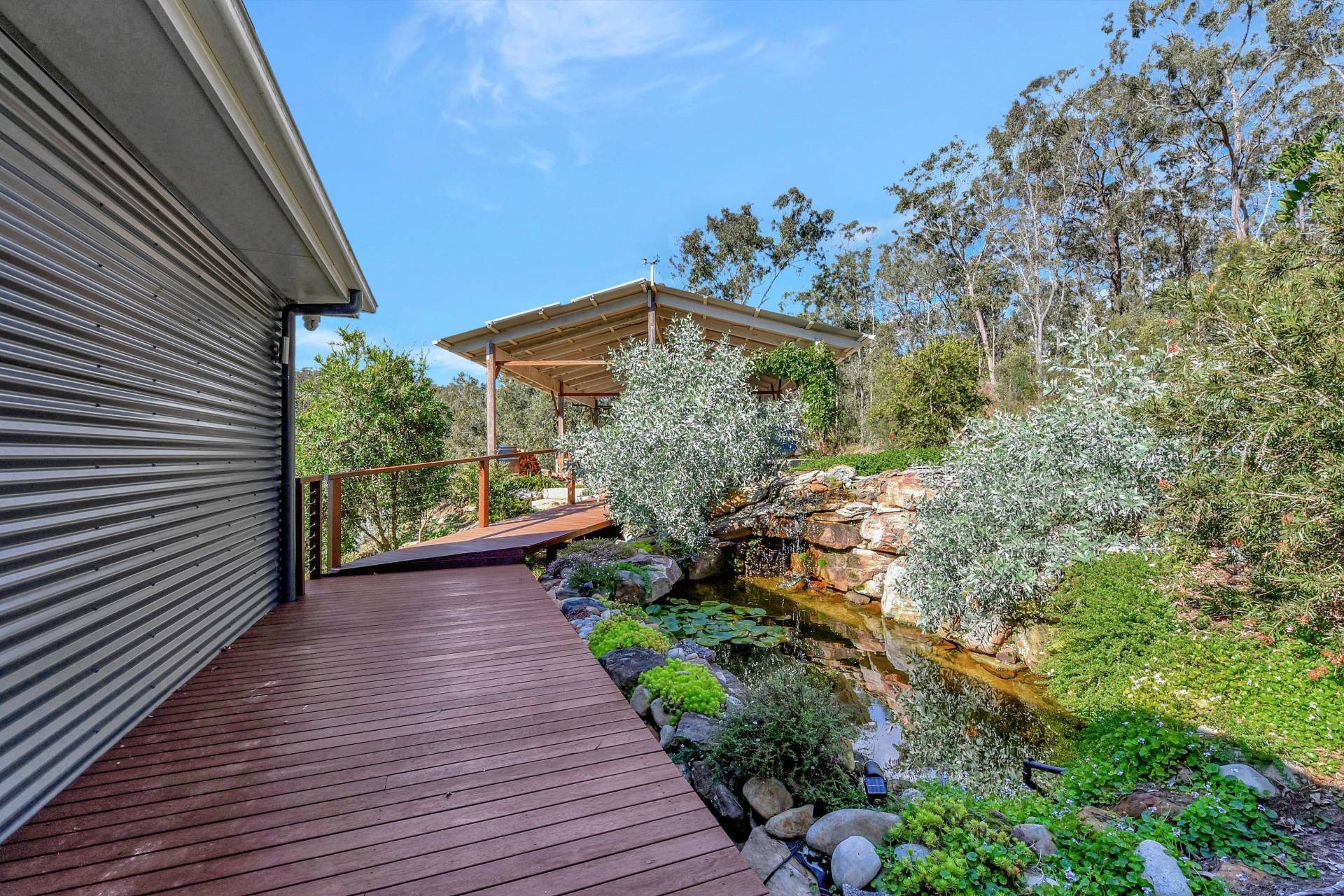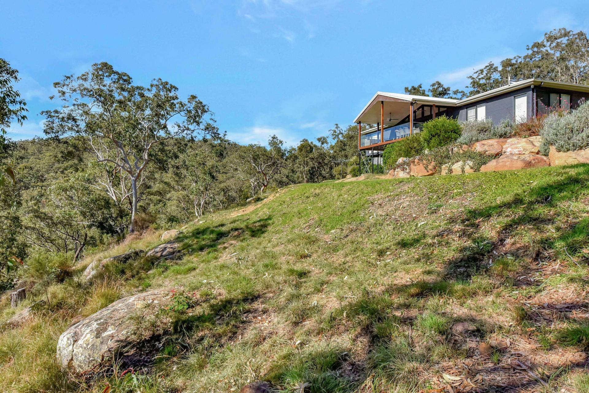 Arriving at the property, you feel an instant calm with no neighbours in sight, the sound of birds and wind in the trees and a spectacular mountain view looking out to the Yango Creek Valley below. Landscaped native gardens are a feature throughout, including a natural stone water feature with a pond at the house entry, expansive sandstone retaining & steps and flowering native plants attracting prolific birdlife all year round.