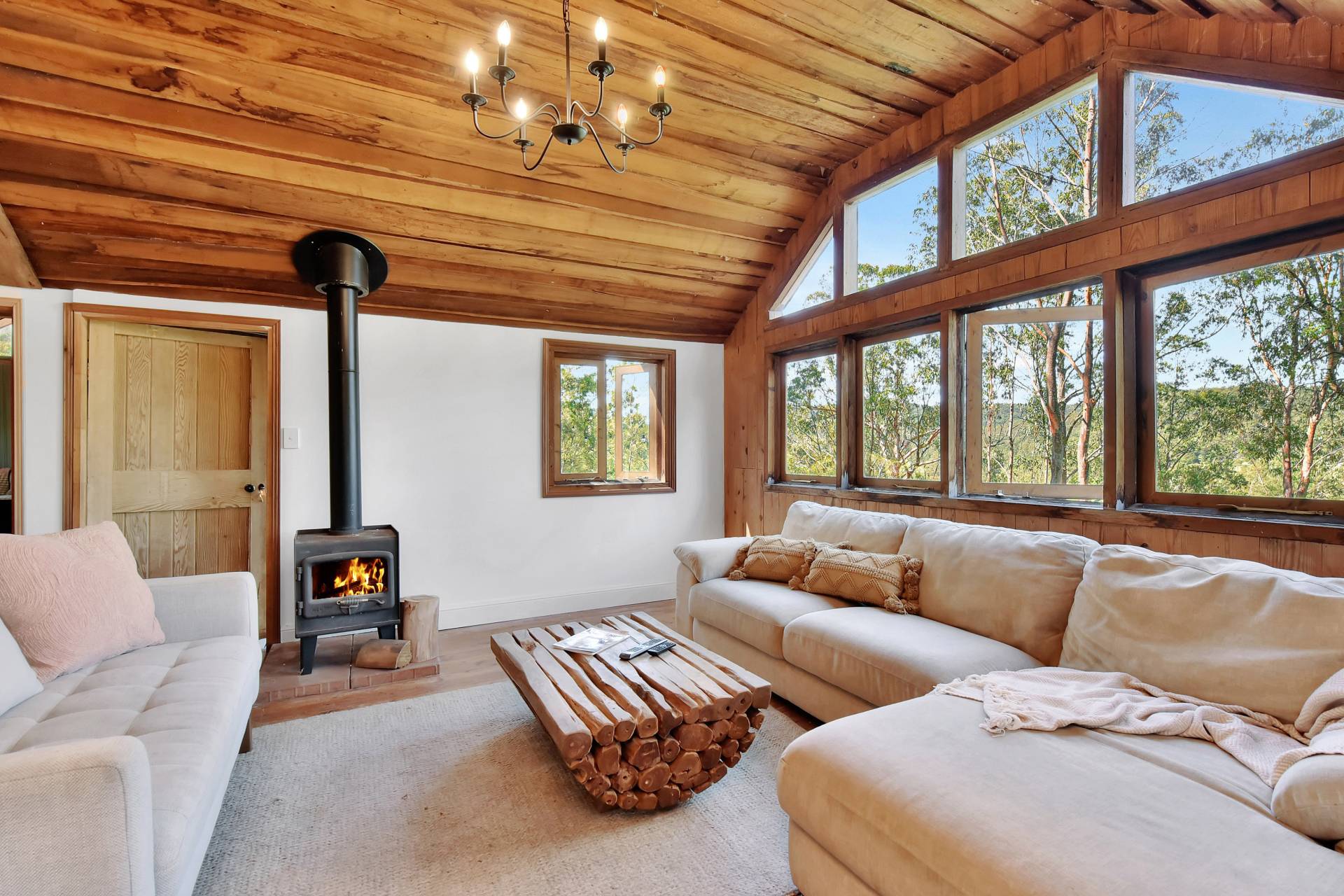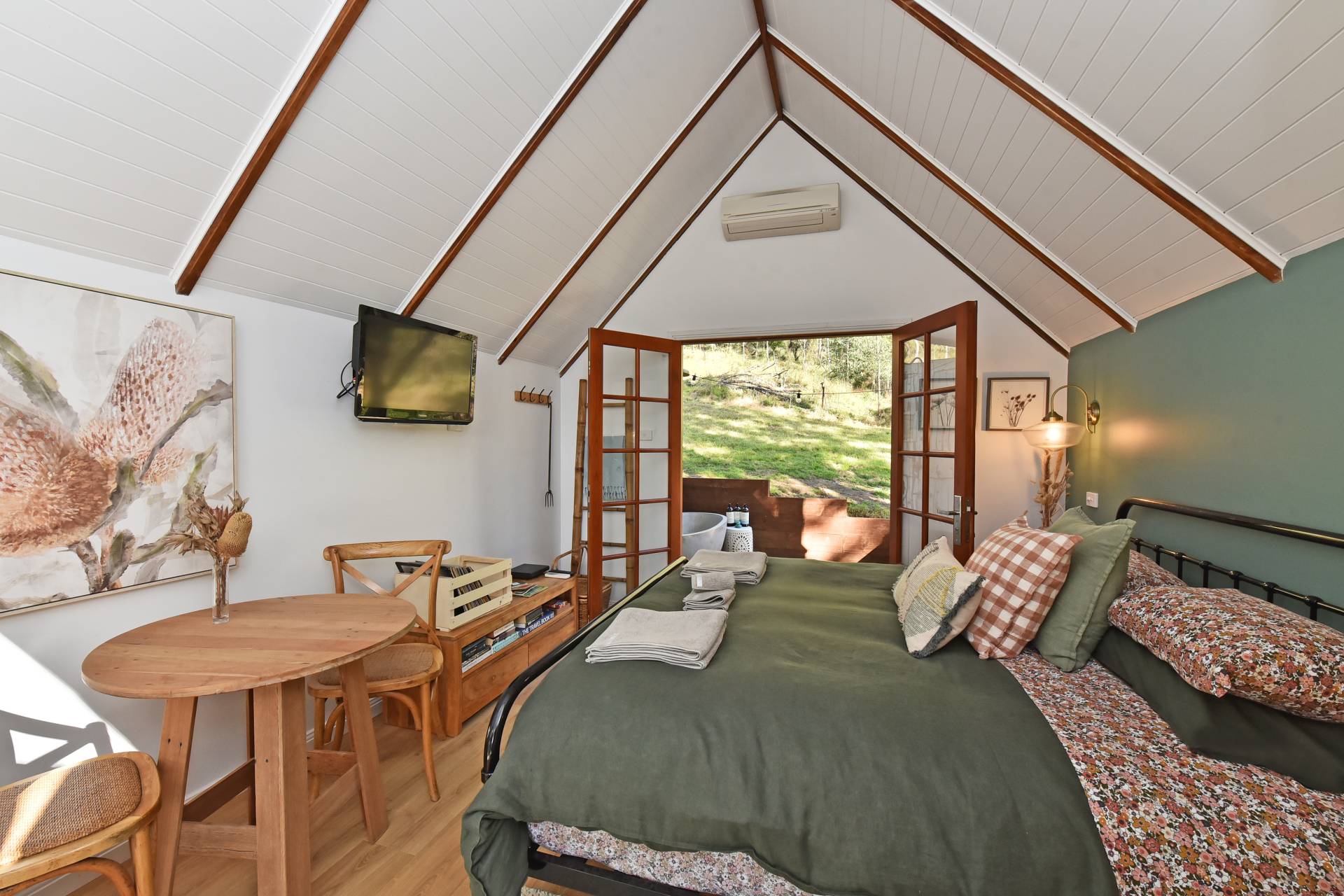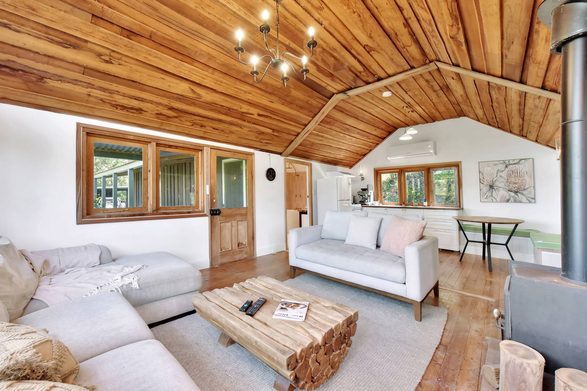 The 2-bedroom Australiana inspired retreat features a refined rustic touch throughout. Open plan spaces, kitchen with electric & gas cooking facilities, large bathroom combined bath & shower, split system reverse cycle air conditioning and a cosy slow combustion wood fireplace. Undercover verandahs look out over the surrounding valleys and grassy parklike grounds.