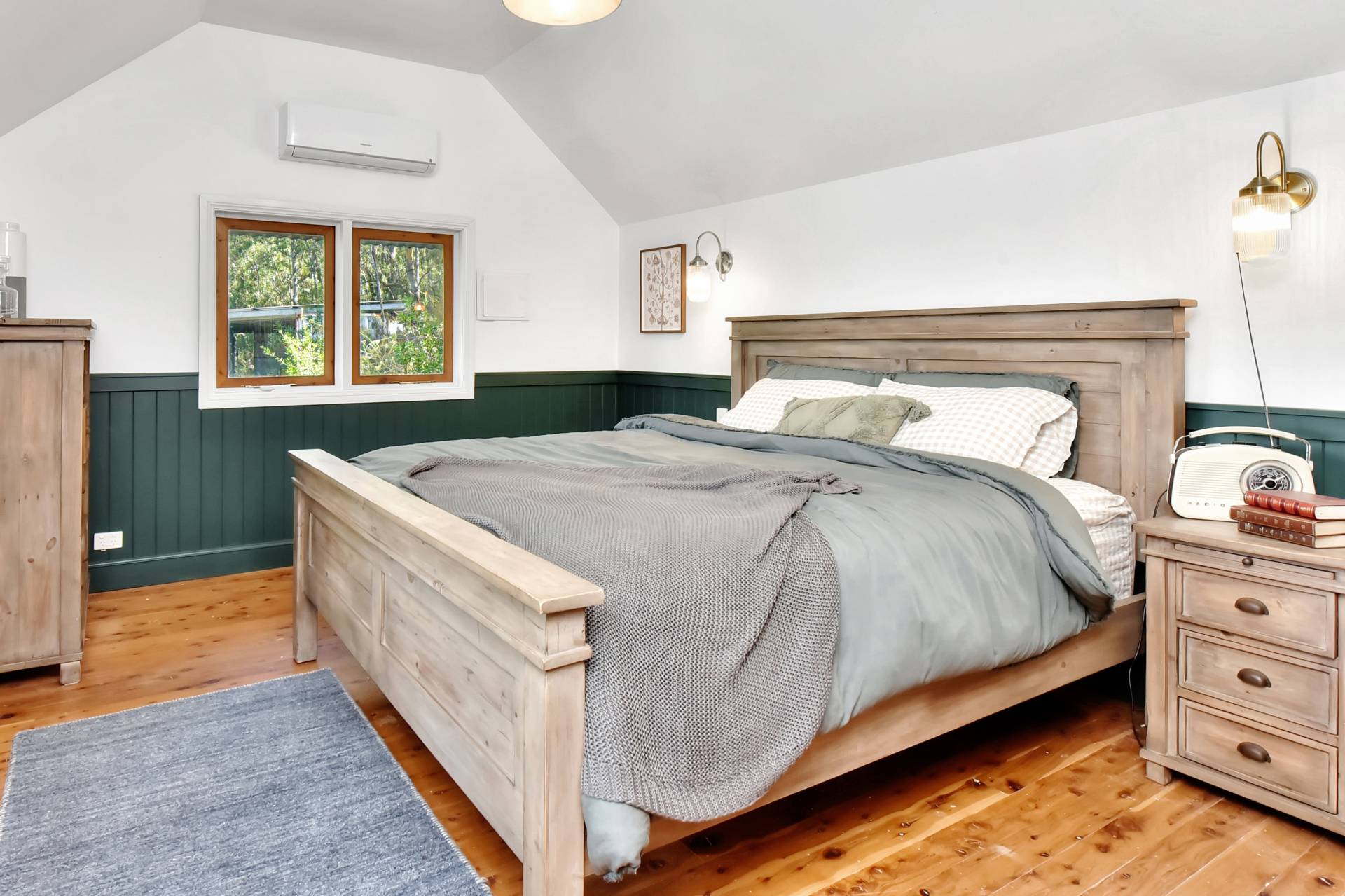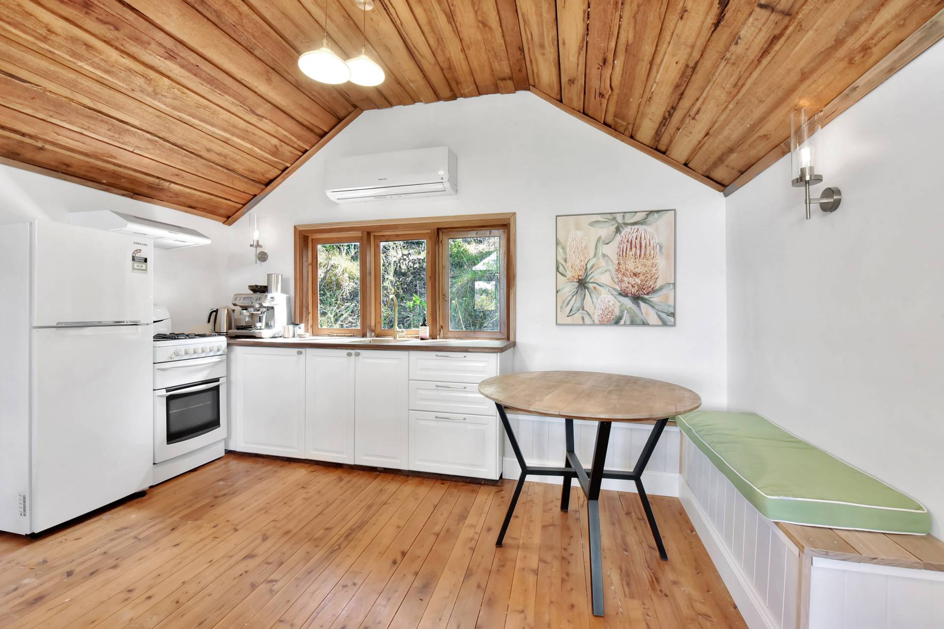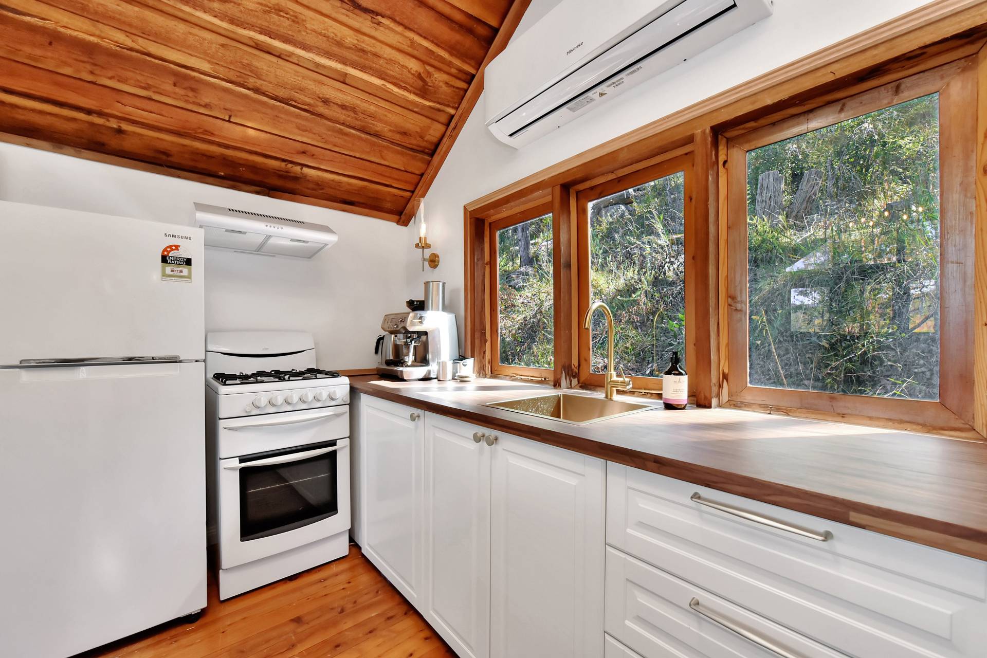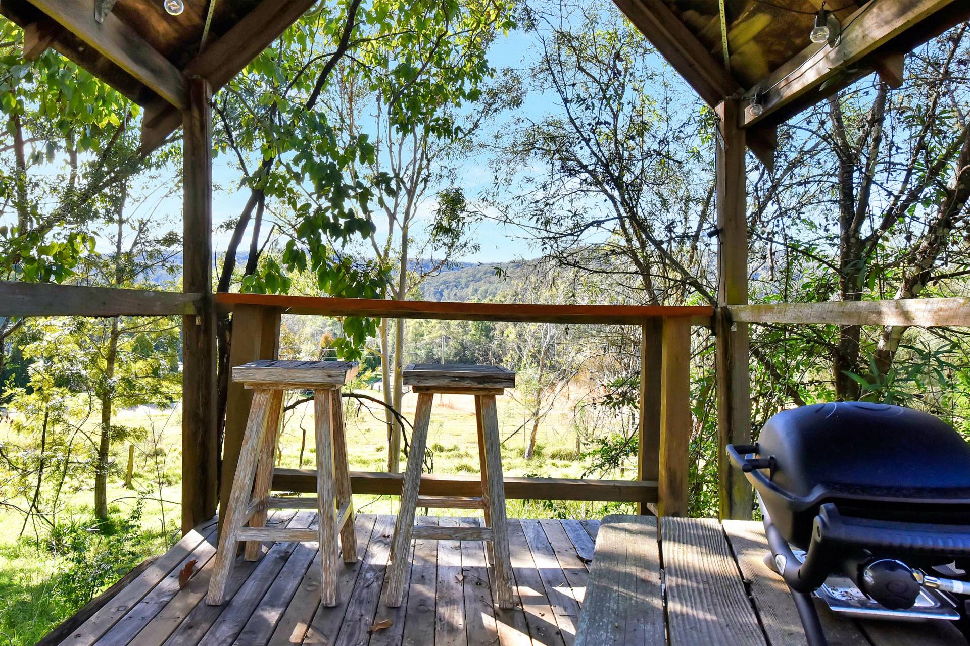 The 2-bedroom Australiana inspired retreat features a refined rustic touch throughout. Open plan spaces, kitchen with electric & gas cooking facilities, large bathroom combined bath & shower, split system reverse cycle air conditioning and a cosy slow combustion wood fireplace. Undercover verandahs look out over the surrounding valleys and grassy parklike grounds.