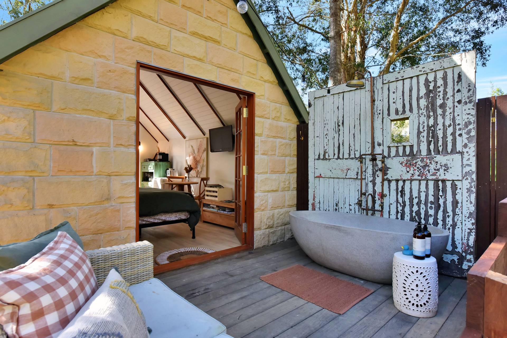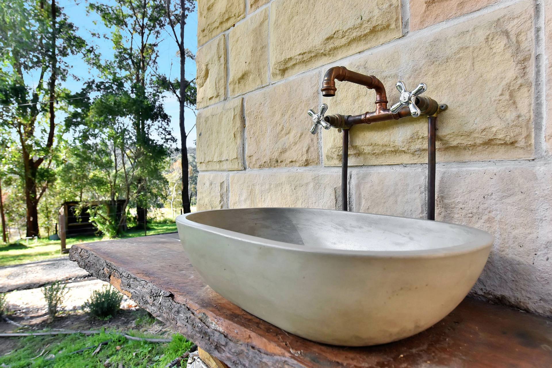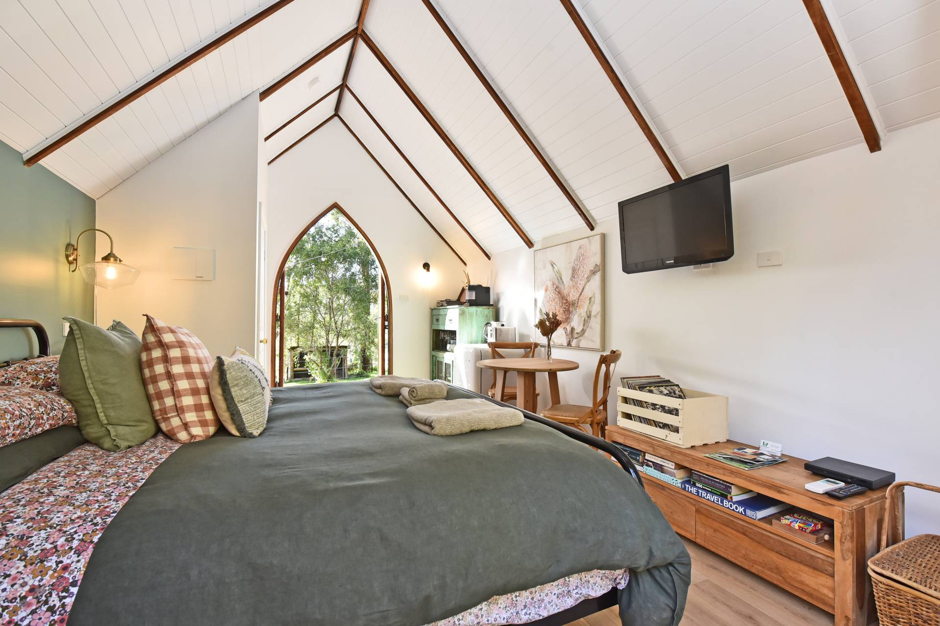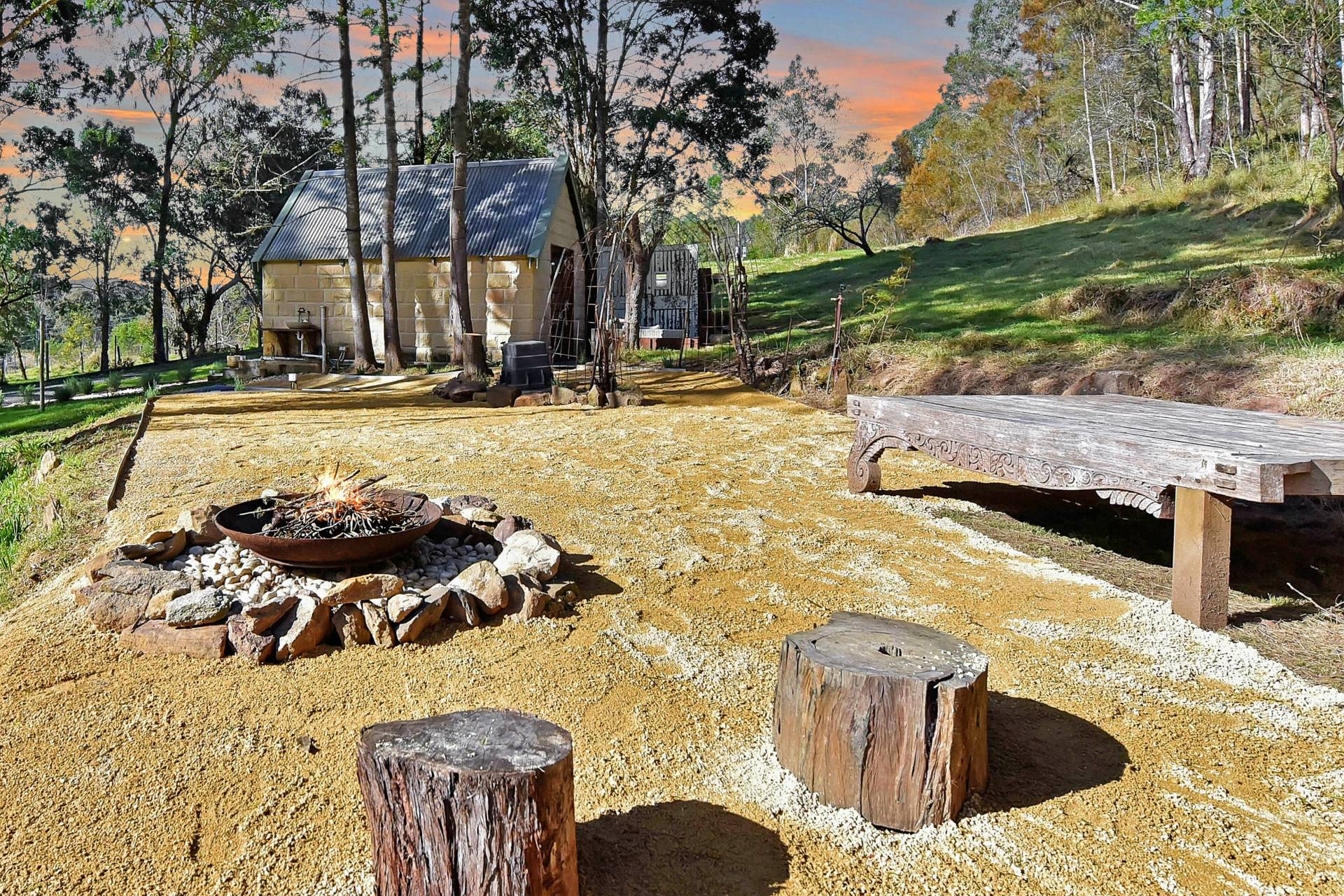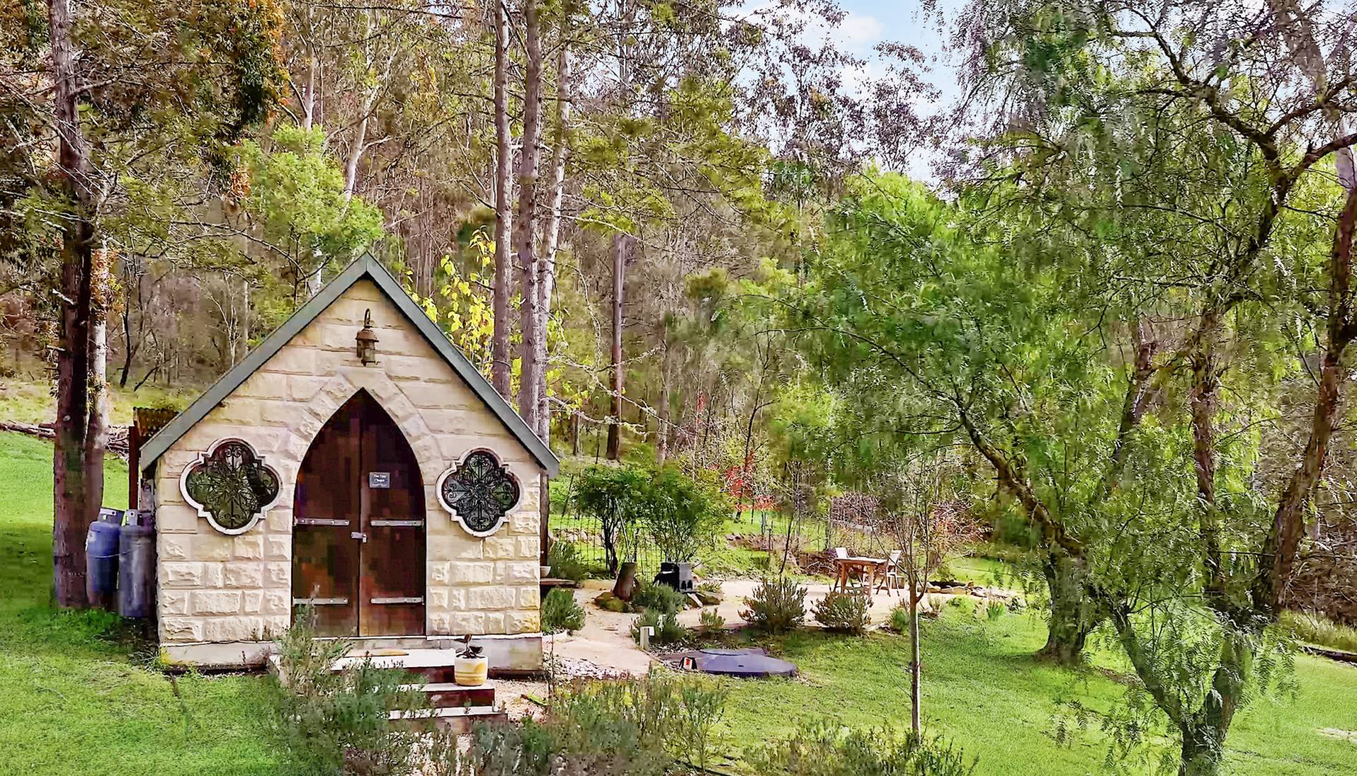 A beautiful studio chapel building has been strategically placed on a lower grassy plateau below. Fitted out very stylishly the chapel building comes complete with split system reverse cycle air conditioning, powder room, kitchenette, luxury stone double bathtub and shower facility with handcrafted copper tap wear. An awesome fire pit area is the perfect spot for afternoon sundowners.