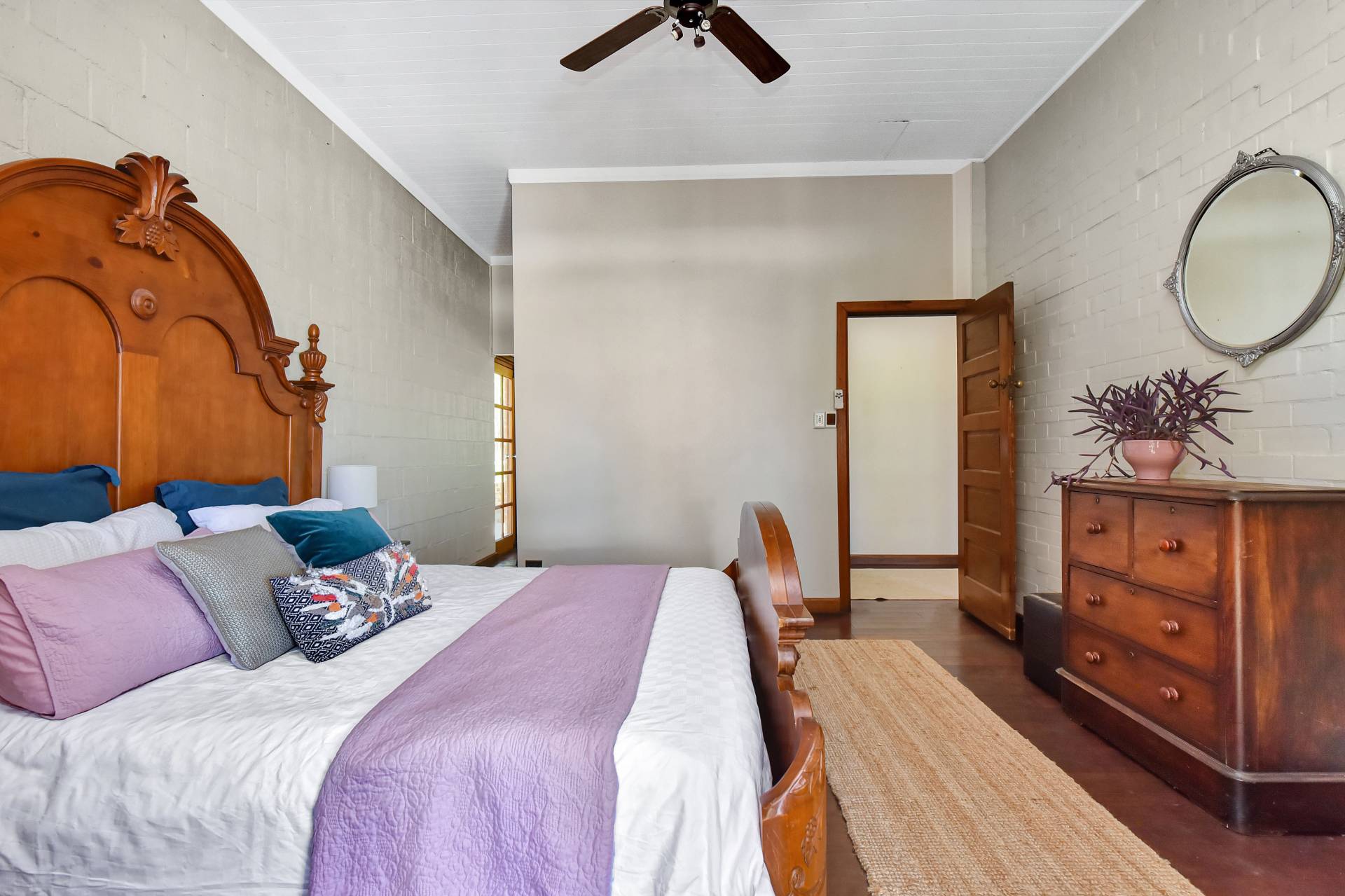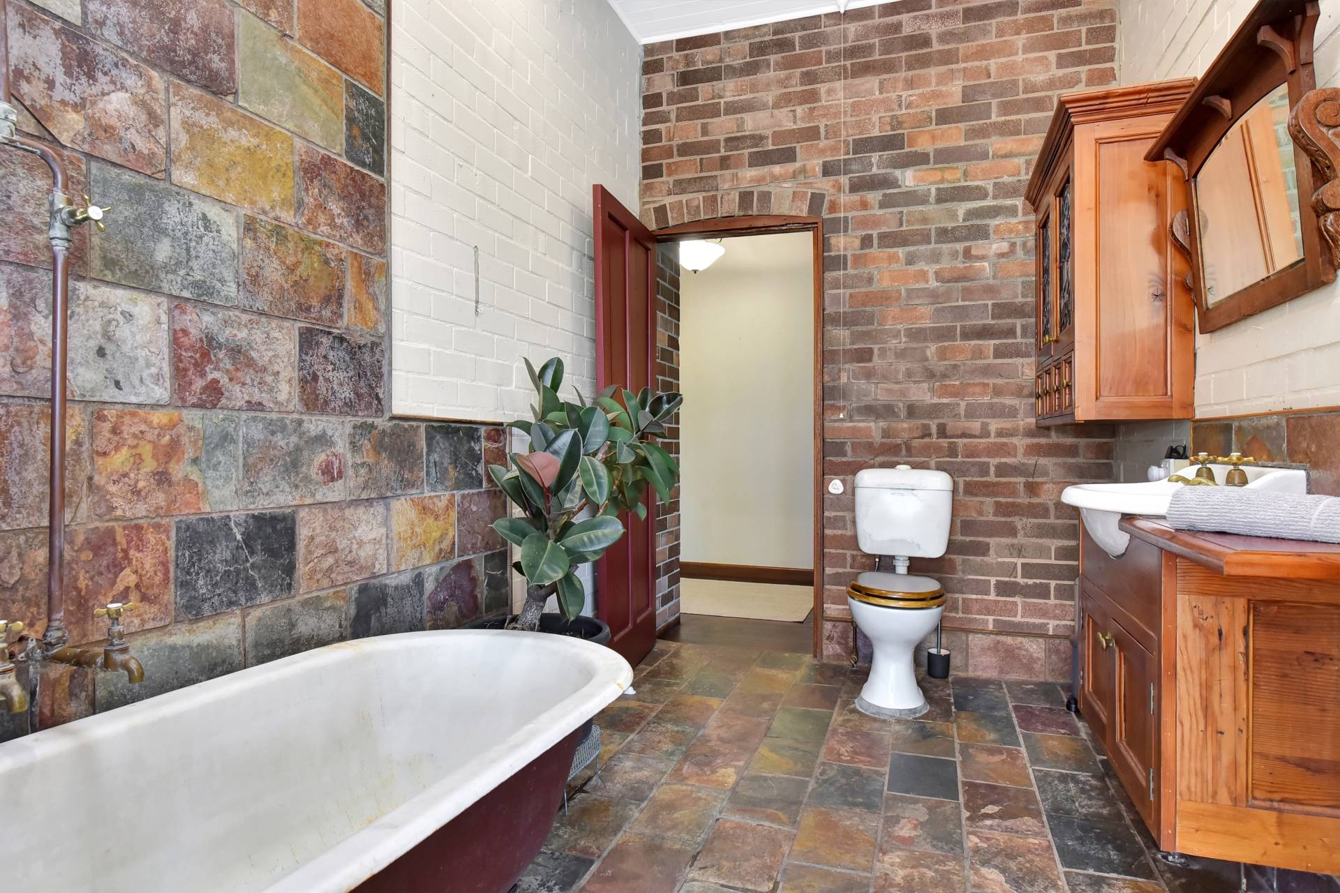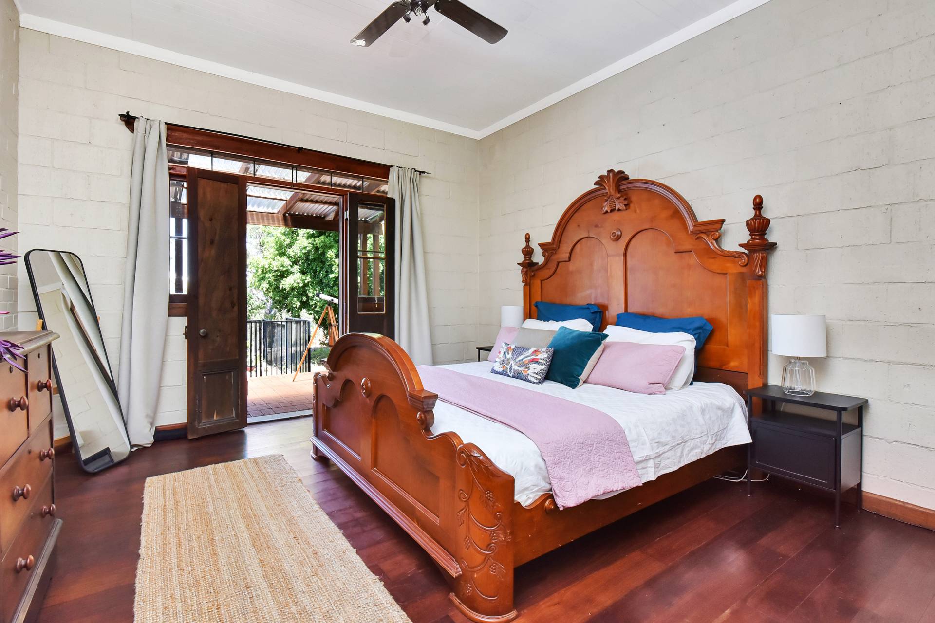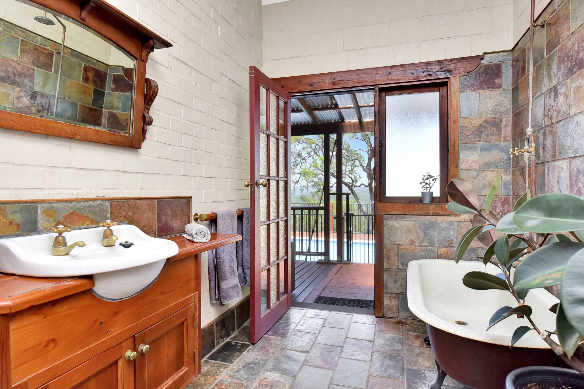 Three bedrooms plus a home office/library/optional 4th bedroom are located to the southern end of the house. The master bedroom having a walk-in robe and French doors opening onto the undercover verandah and pool area. A bush inspired bathroom, offering a clawfoot bath/shower and toilet fits in perfectly to the ‘Old World’ Georgian style façade of the house.