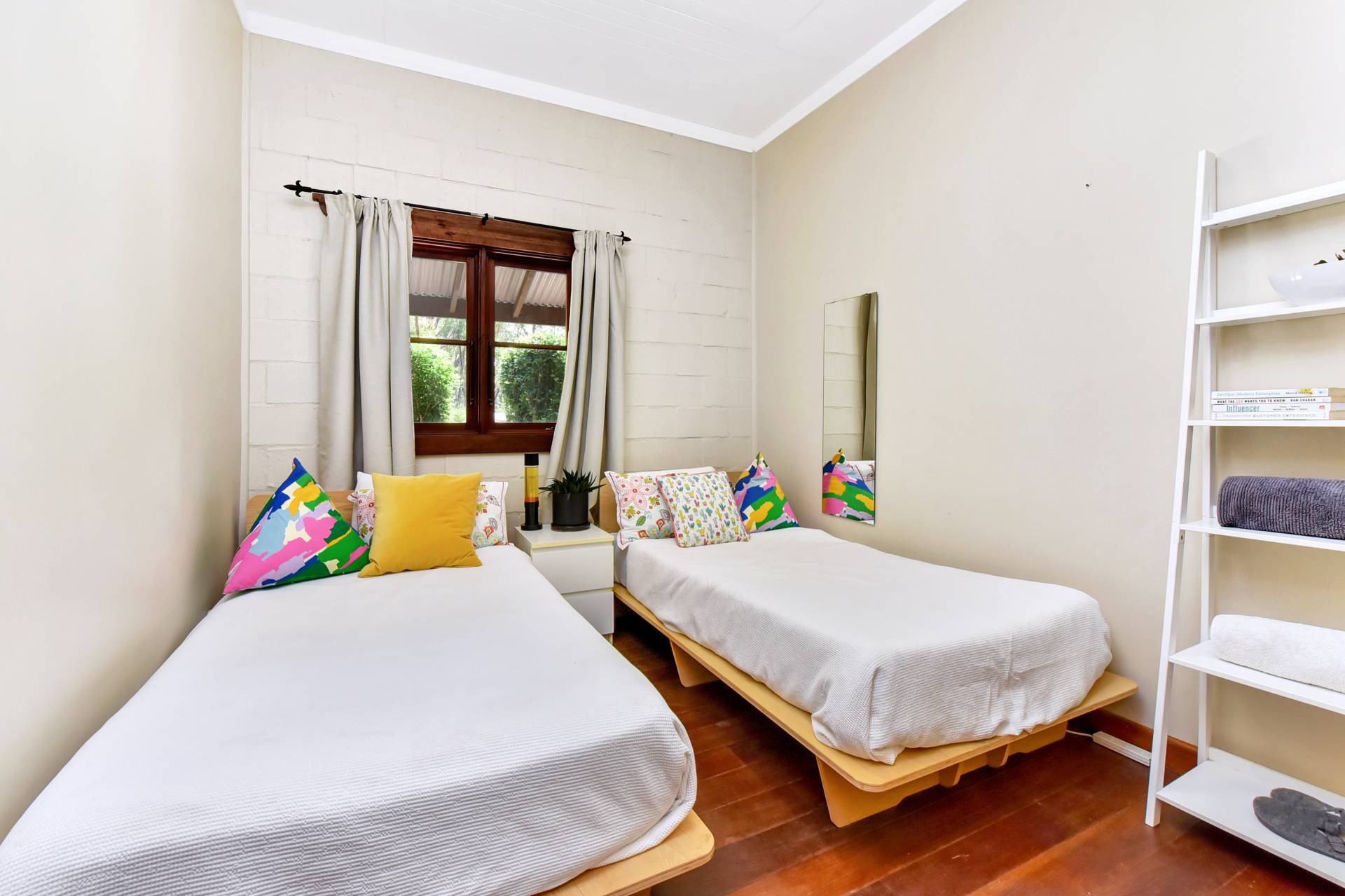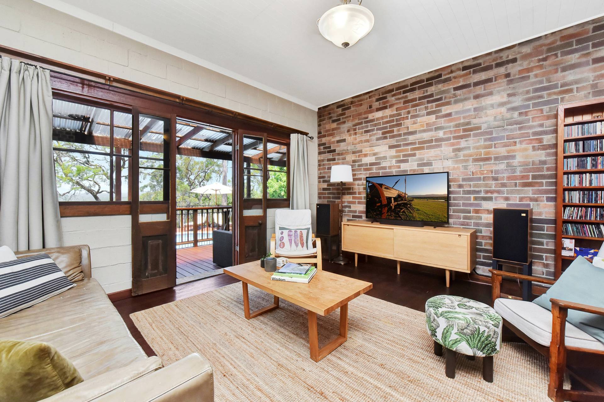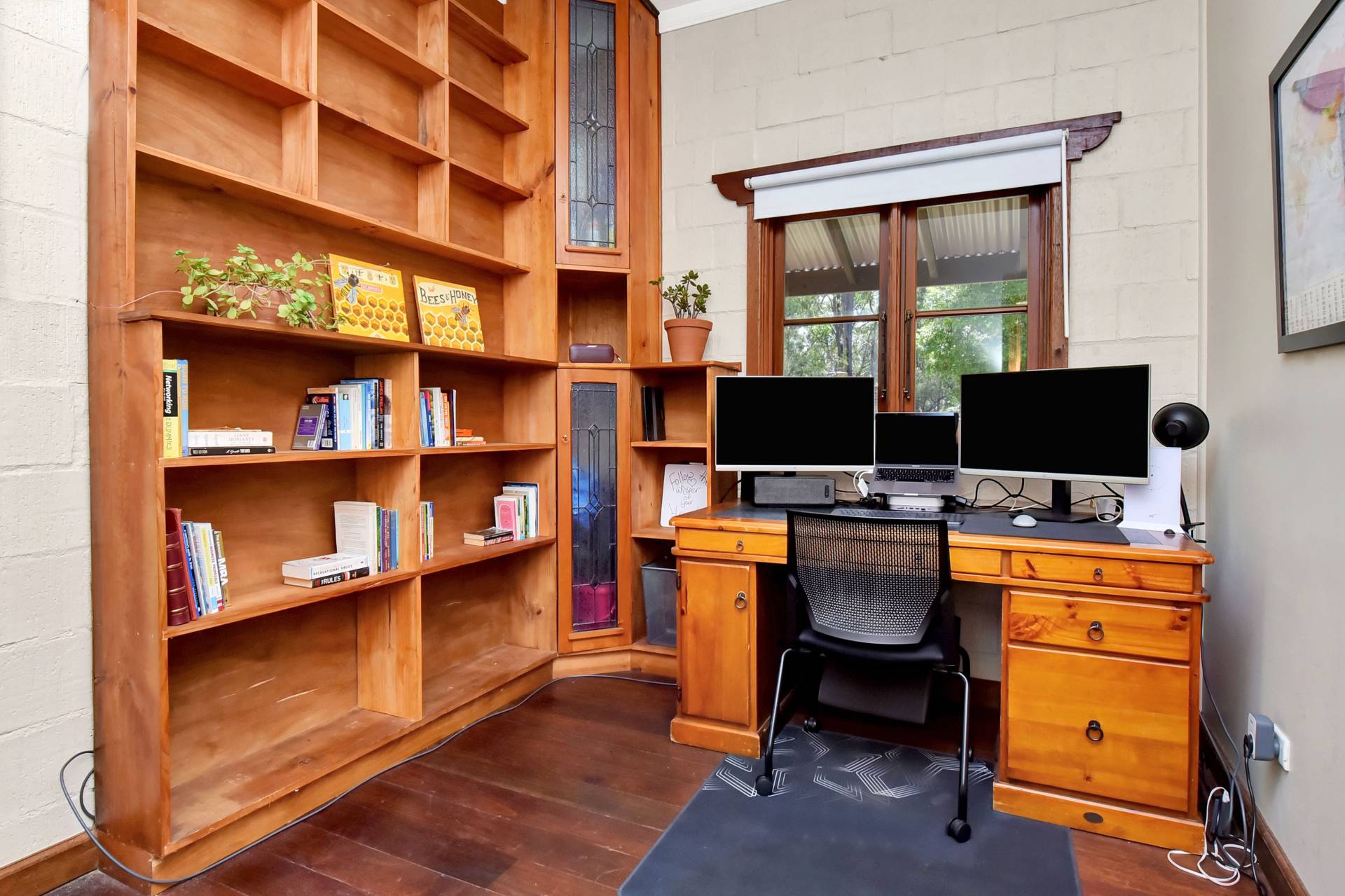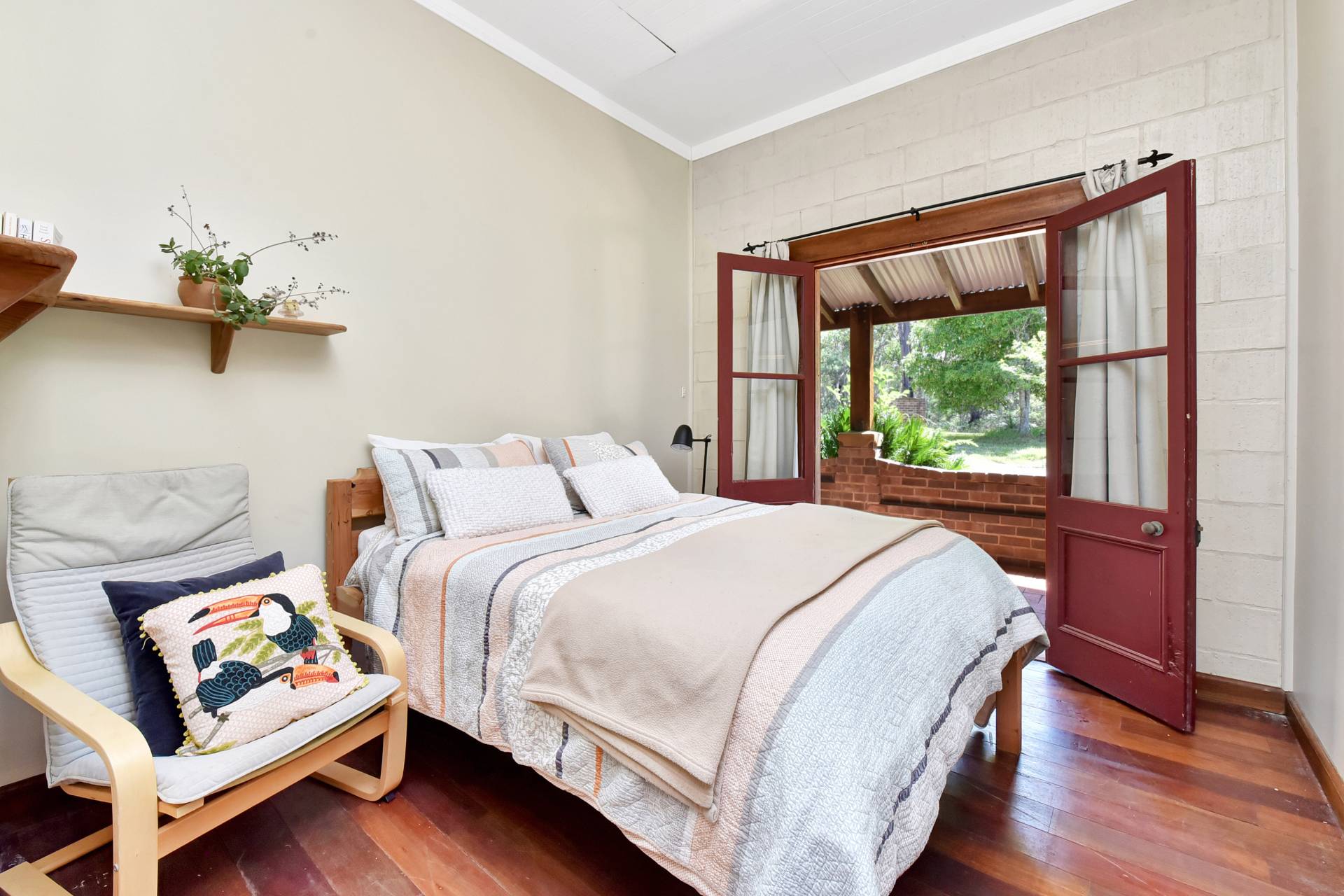Three bedrooms plus a home office/library/optional 4th bedroom are located to the southern end of the house. The master bedroom having a walk-in robe and French doors opening onto the undercover verandah and pool area. A bush inspired bathroom, offering a clawfoot bath/shower and toilet fits in perfectly to the ‘Old World’ Georgian style façade of the house.