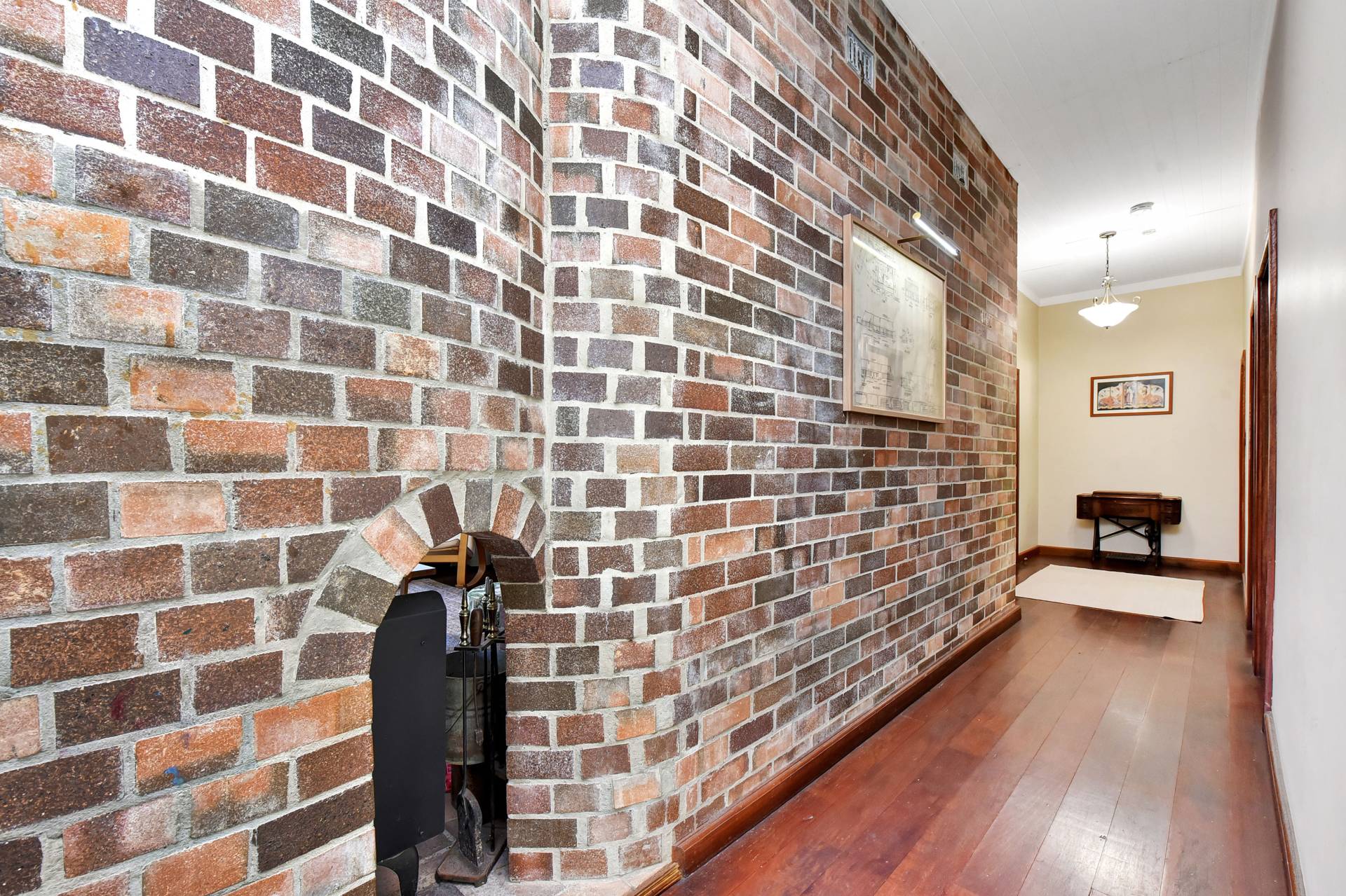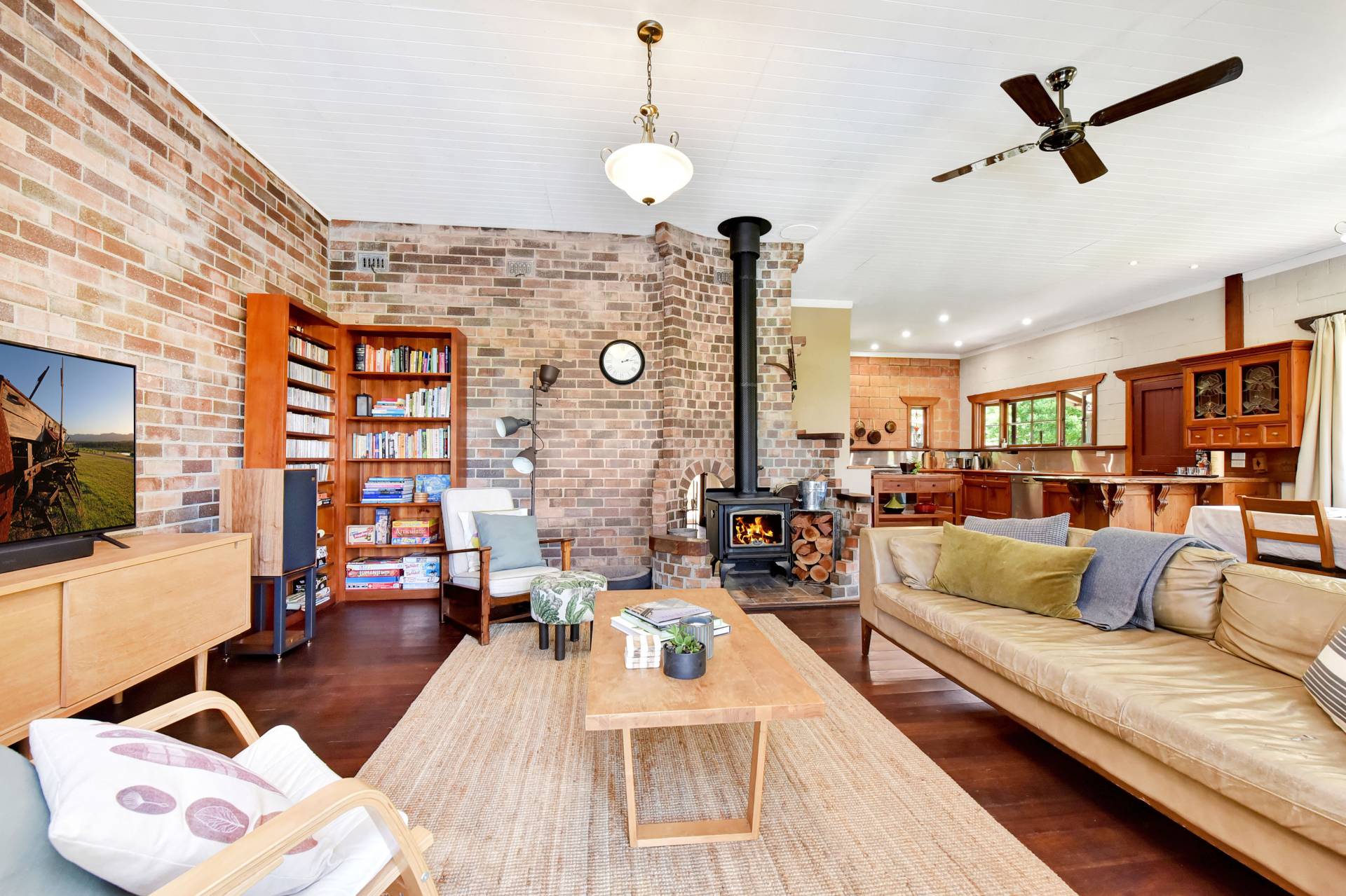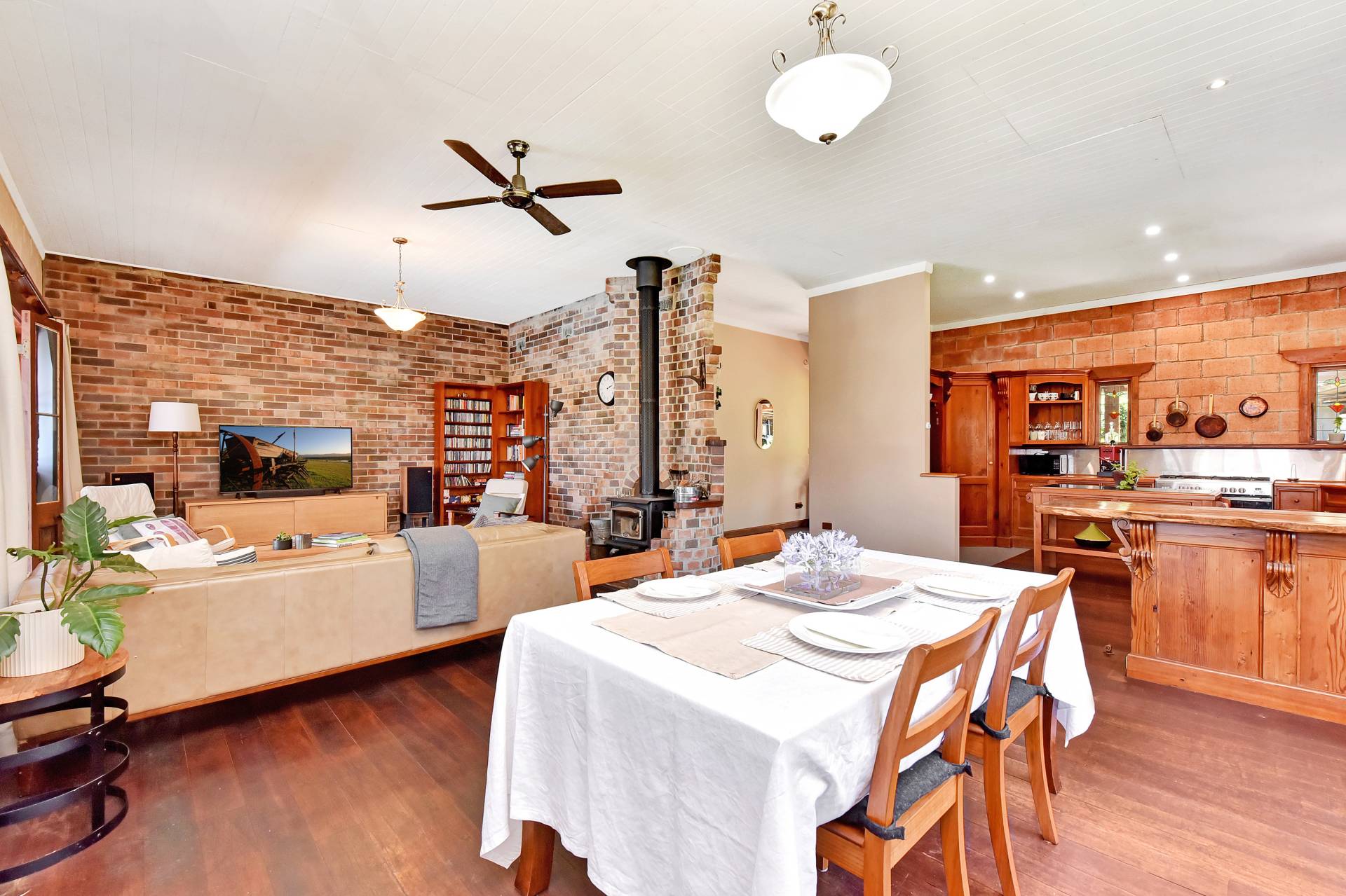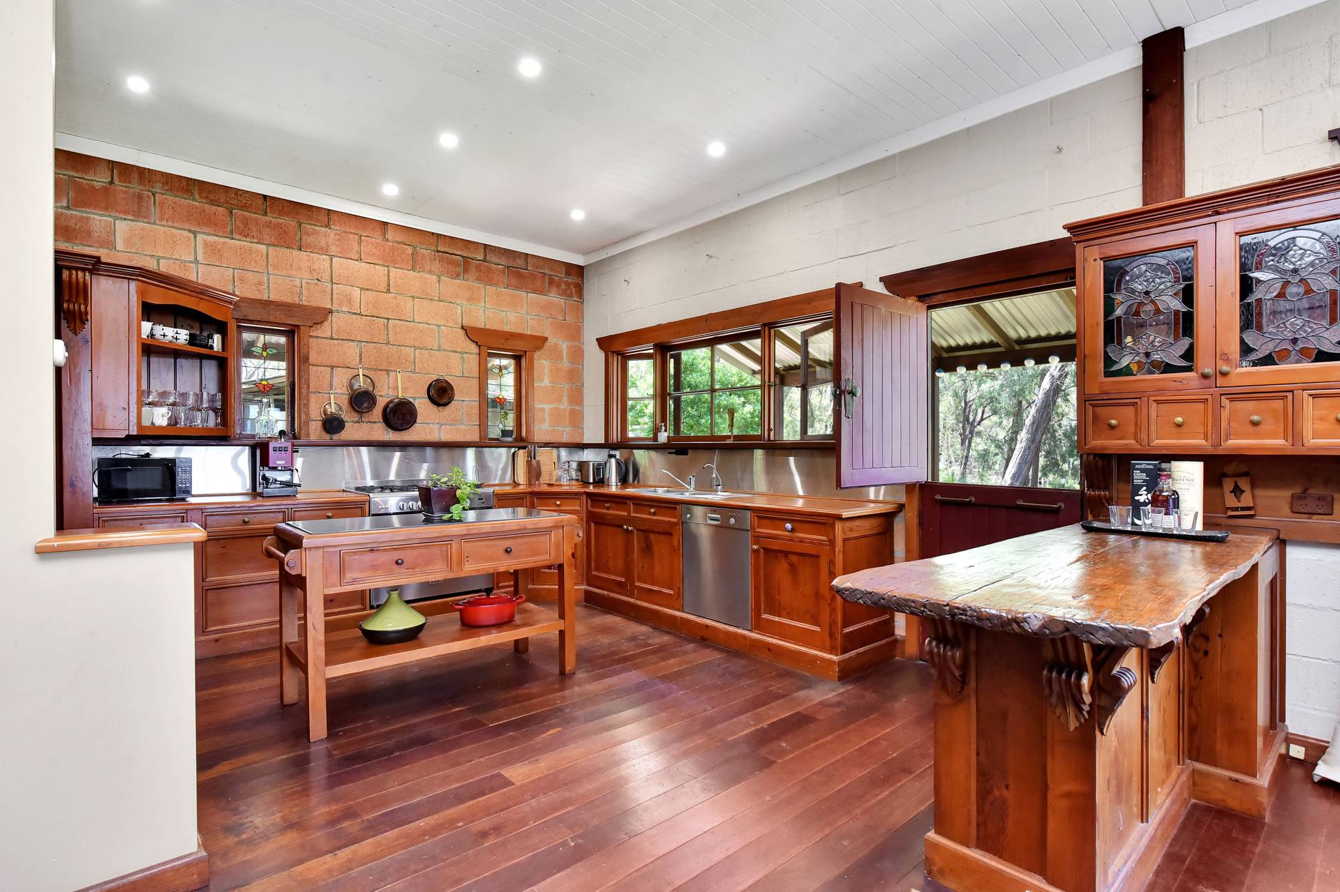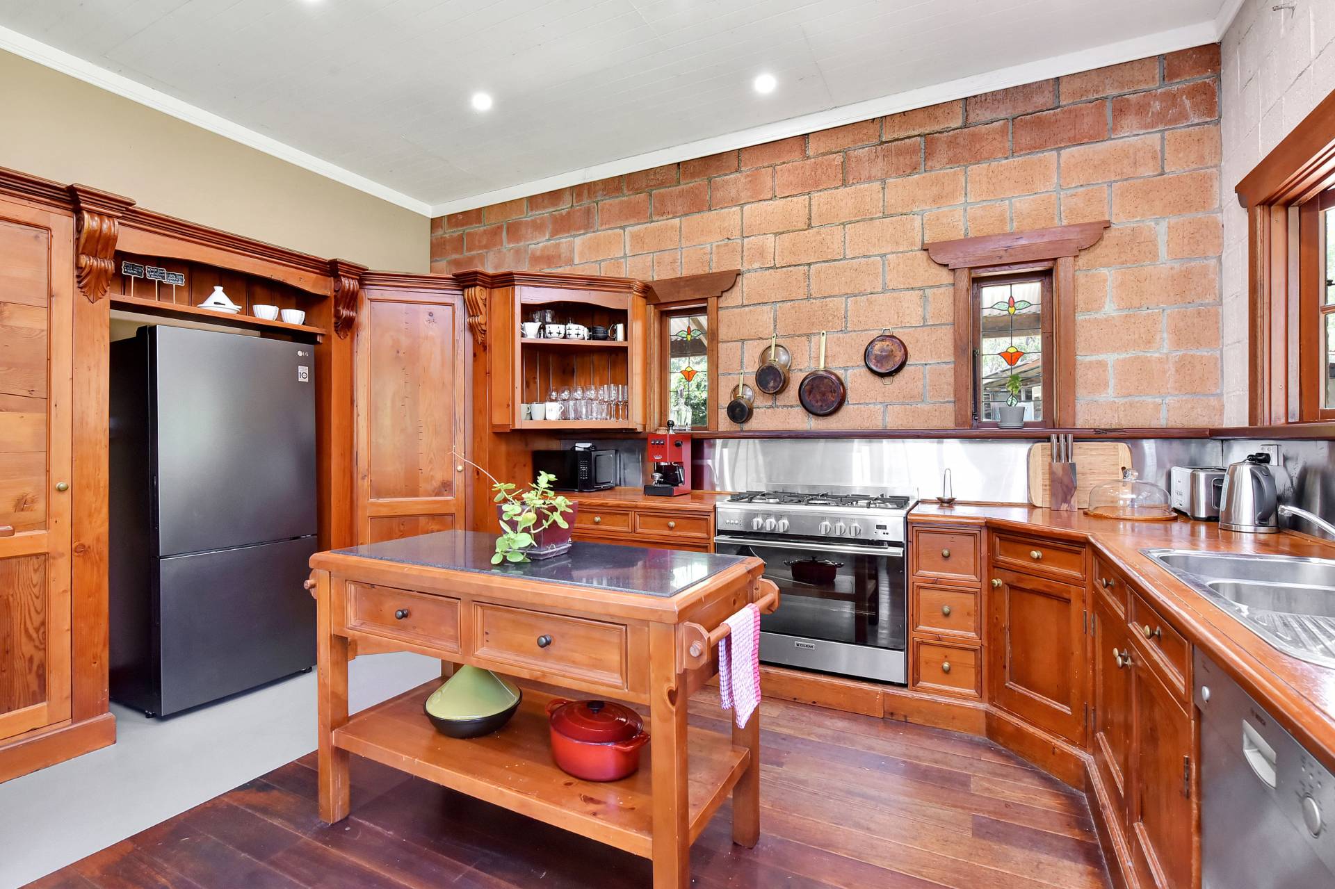 Open plan living and dining areas enjoy the ambience of a feature fire place which has beautiful brickwork surrounds. Gorgeous timber windows and 10-inch skirting boards enhance the cosy red brick interior. The dining area adjoins an impressive Oregon wood kitchen, fitted out with a free-standing gas stove, natural timber benches with stainless steel splashbacks and a corner walk in pantry. An island bench and breakfast bar frame the doorway to the Northern side-verandah, taking advantage of a northern aspect.