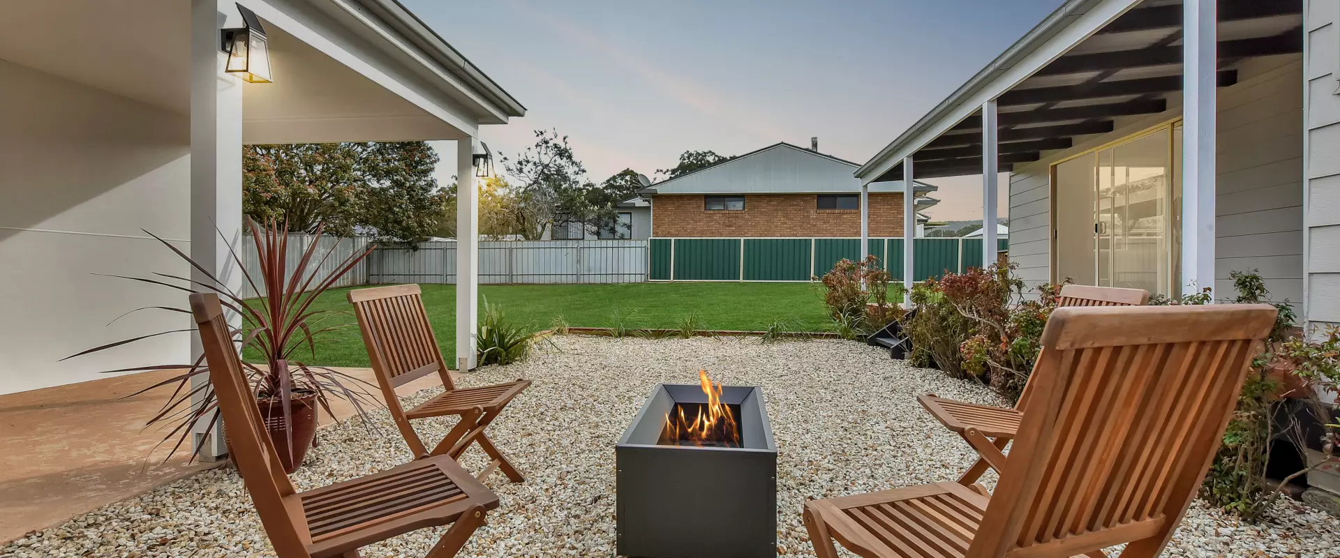 At the rear of the property, discover a private, covered entertaining deck that seamlessly connects to a stone-pebbled firepit area. Adjacent, a shed with a carport offers versatile space for additional entertaining, creating an inviting atmosphere around the firepit. A double carport next to the house provides secure parking for vehicles.