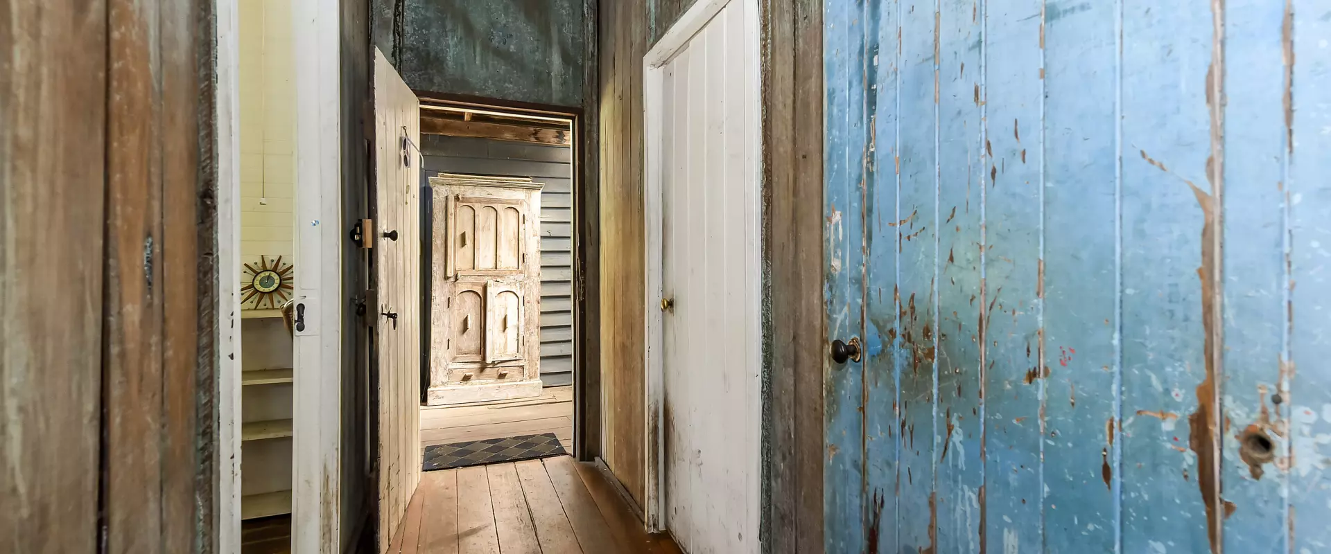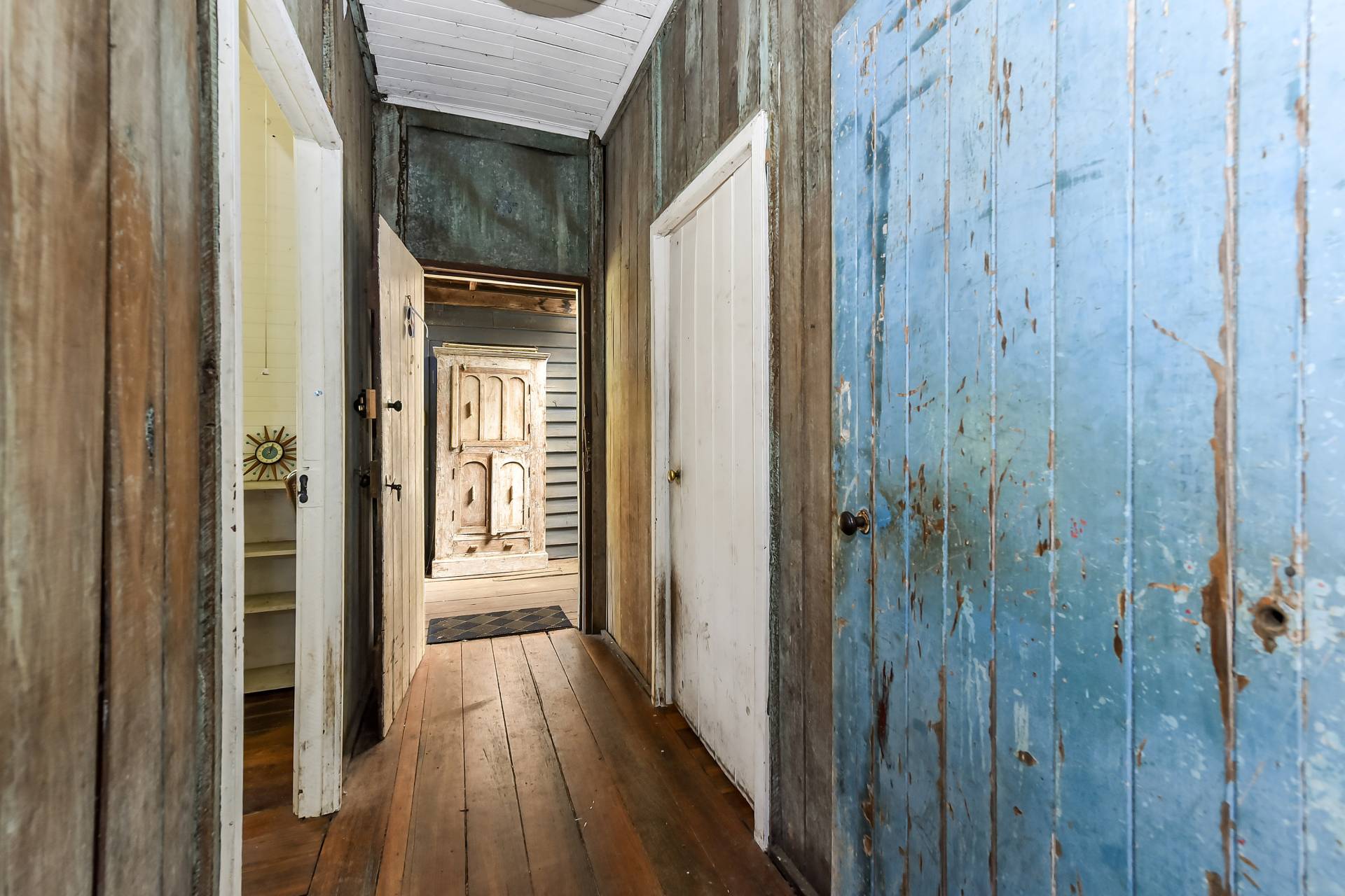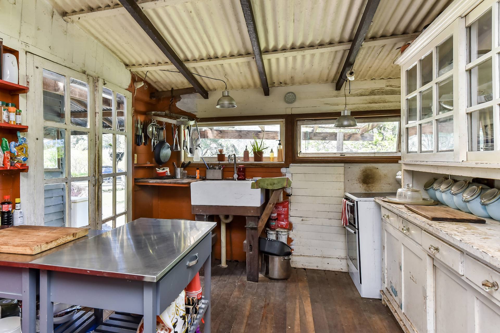 The home’s layout offers versatility, with the original front section hosting two bedrooms and the main living room, while a breezeway leads to the rear wing—complete with kitchen, dining, and another fireplace. A wood-fired stove as well as gas cooking set the scene for cooking hearty country meals, and a short staircase flows down from the dining to a spacious bedroom/studio and main bathroom.