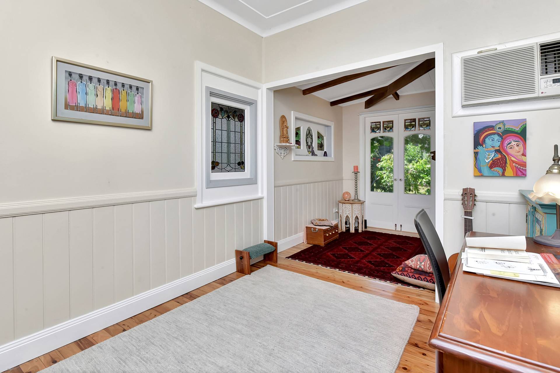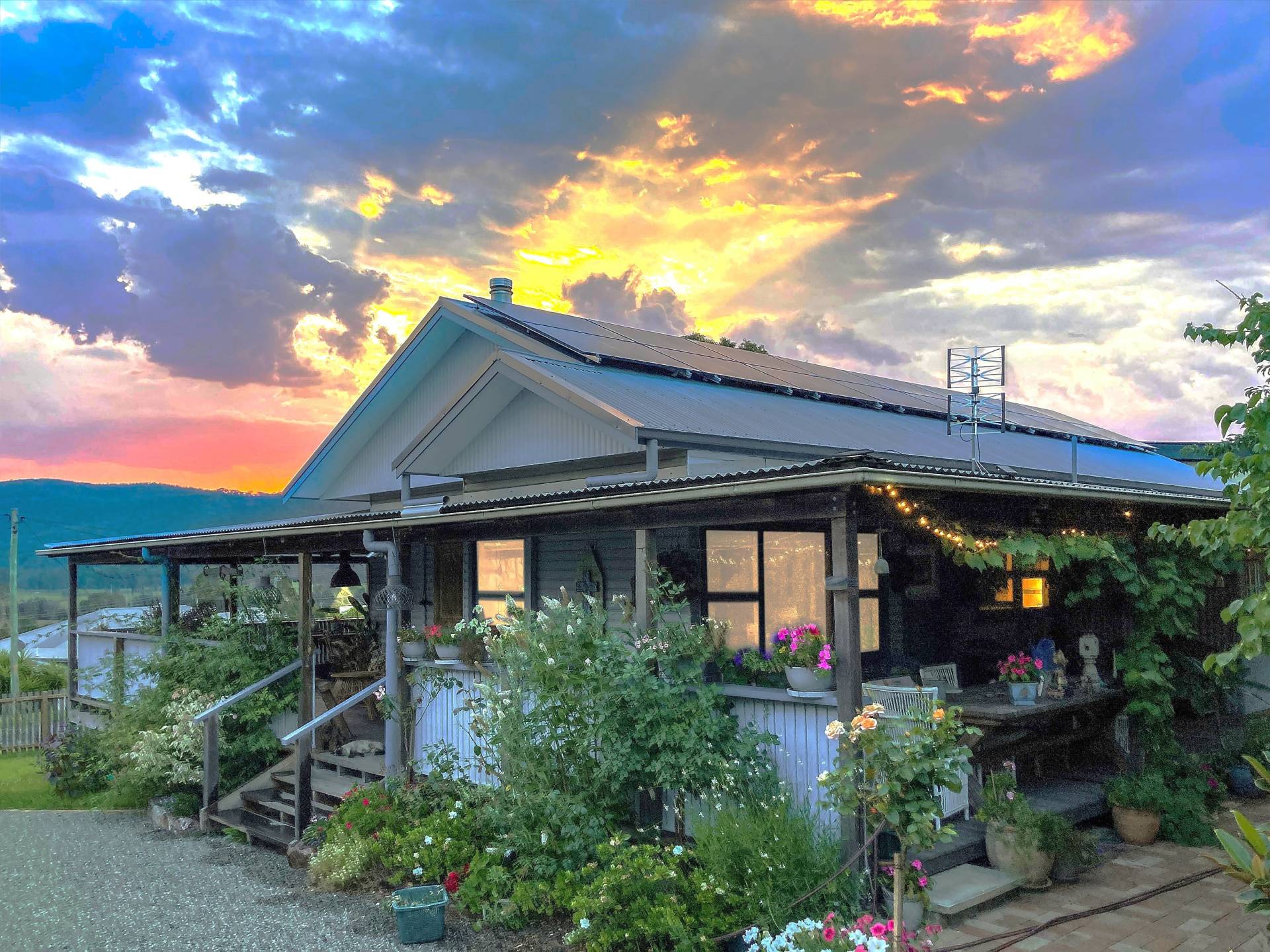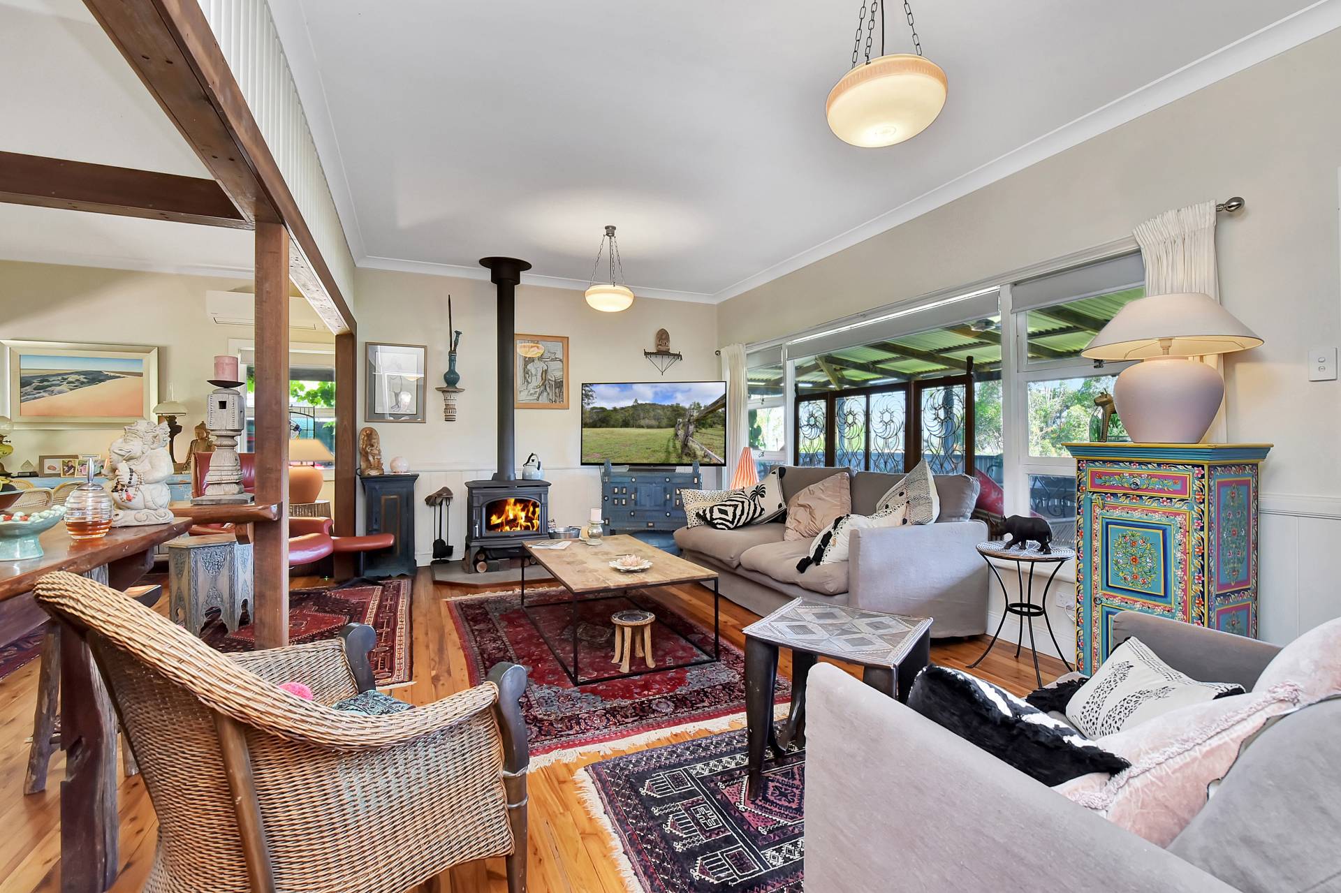 Step inside the character-filled home and feel instantly at ease in this uniquely artistic abode. High ceilings, timber floors, and stained-glass windows create a warm and inviting atmosphere throughout. A wide wraparound verandah provides multiple outdoor living and entertaining spaces — with the front aspect showcasing the glorious mountain panorama.