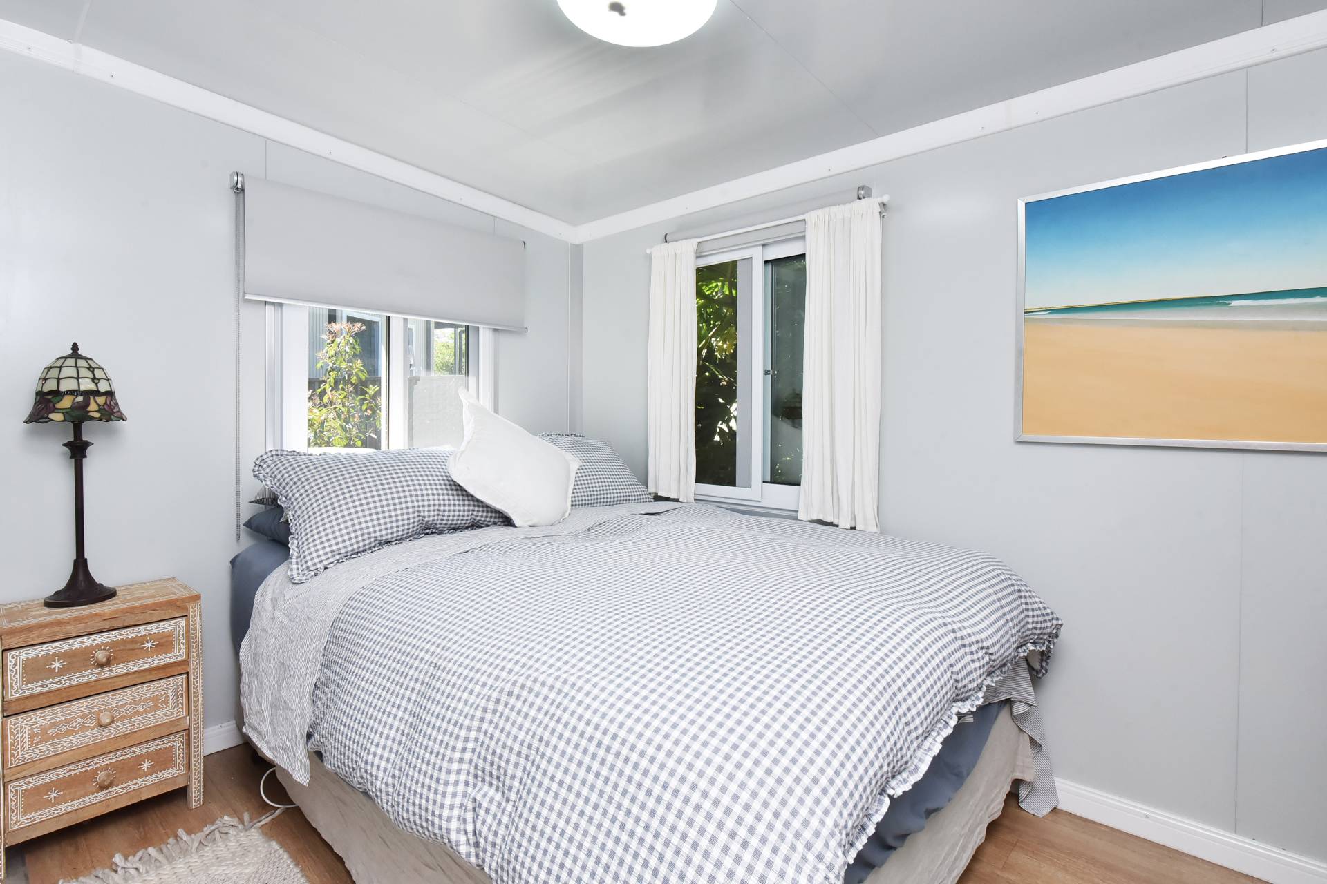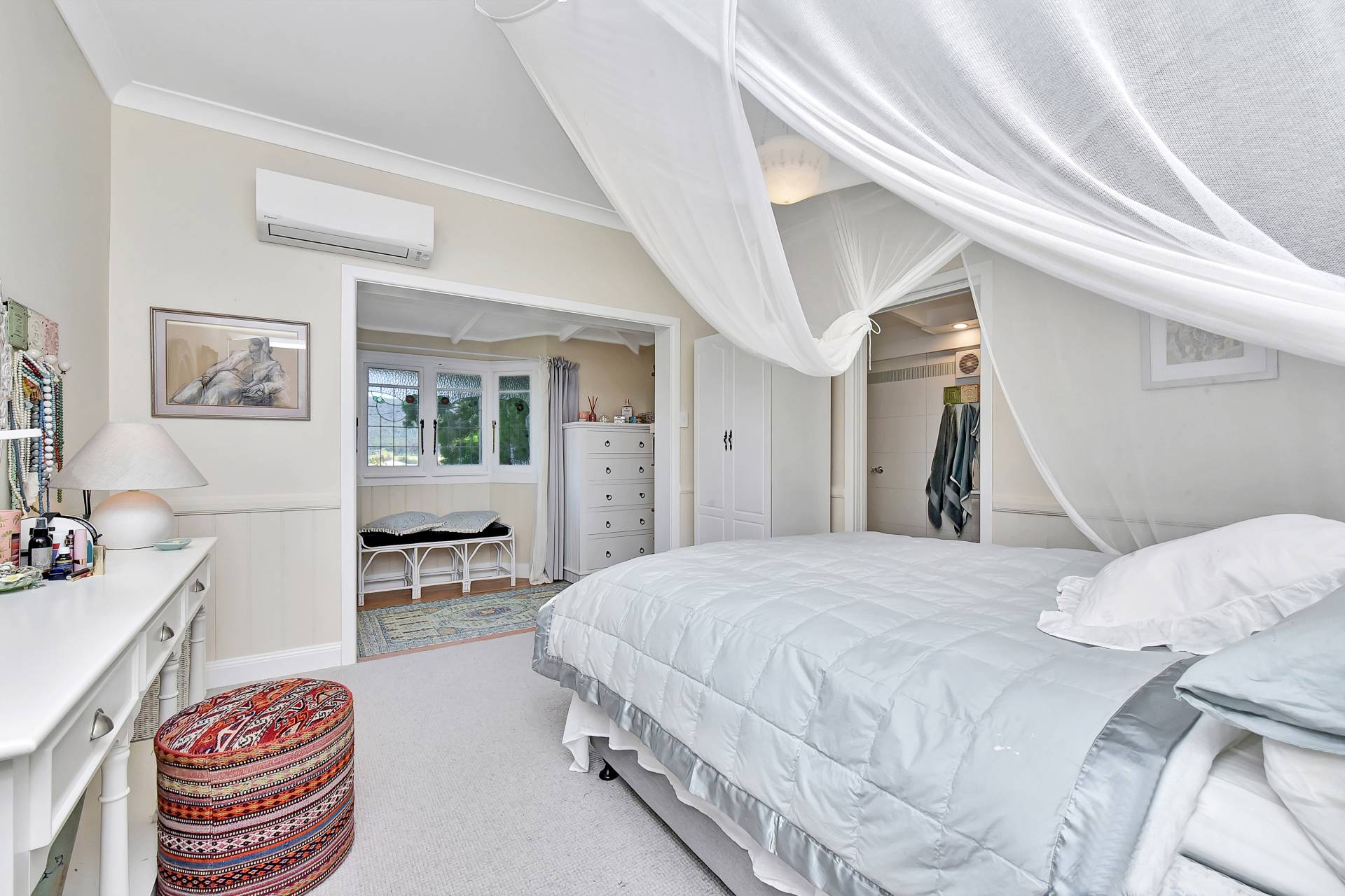 Accommodation includes three spacious bedrooms, with the master featuring a walk-in robe, ensuite, and a charming bay window with a scenic outlook. The oversized second bedroom doubles beautifully as a home office or guest retreat, with French doors opening to the rear garden.