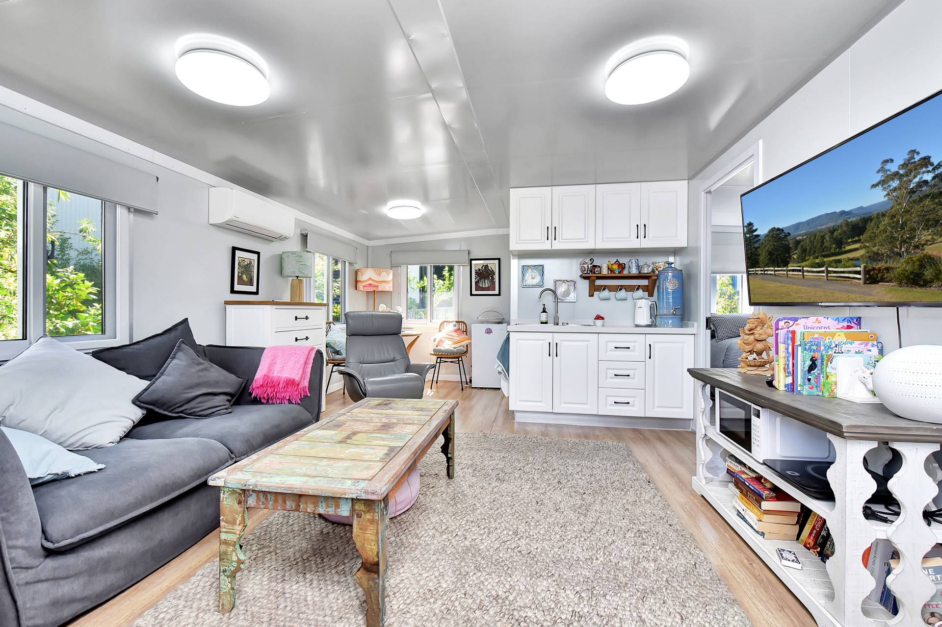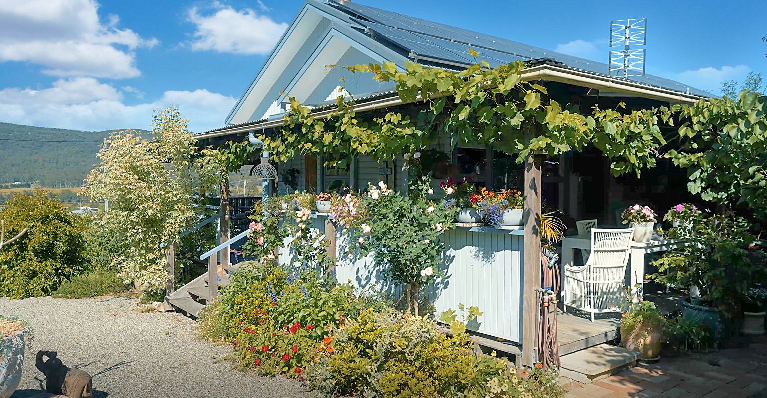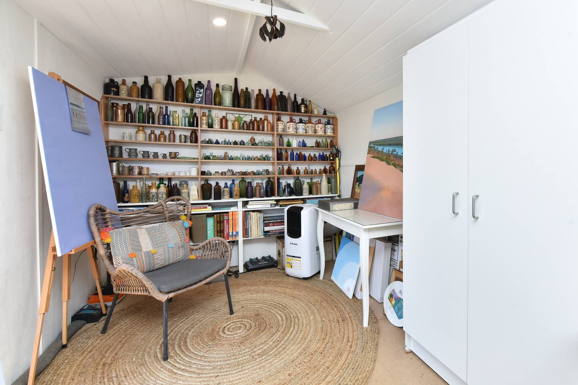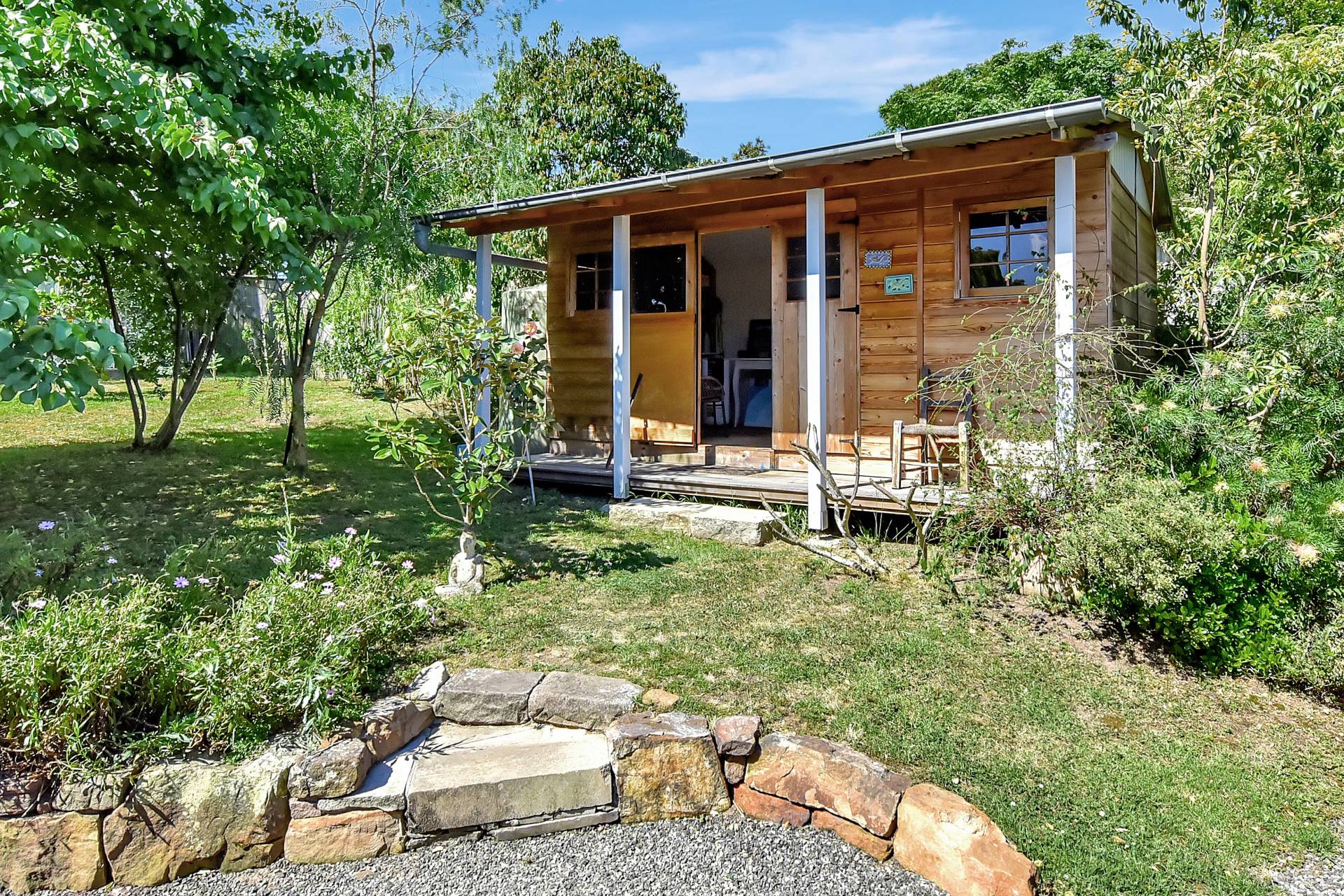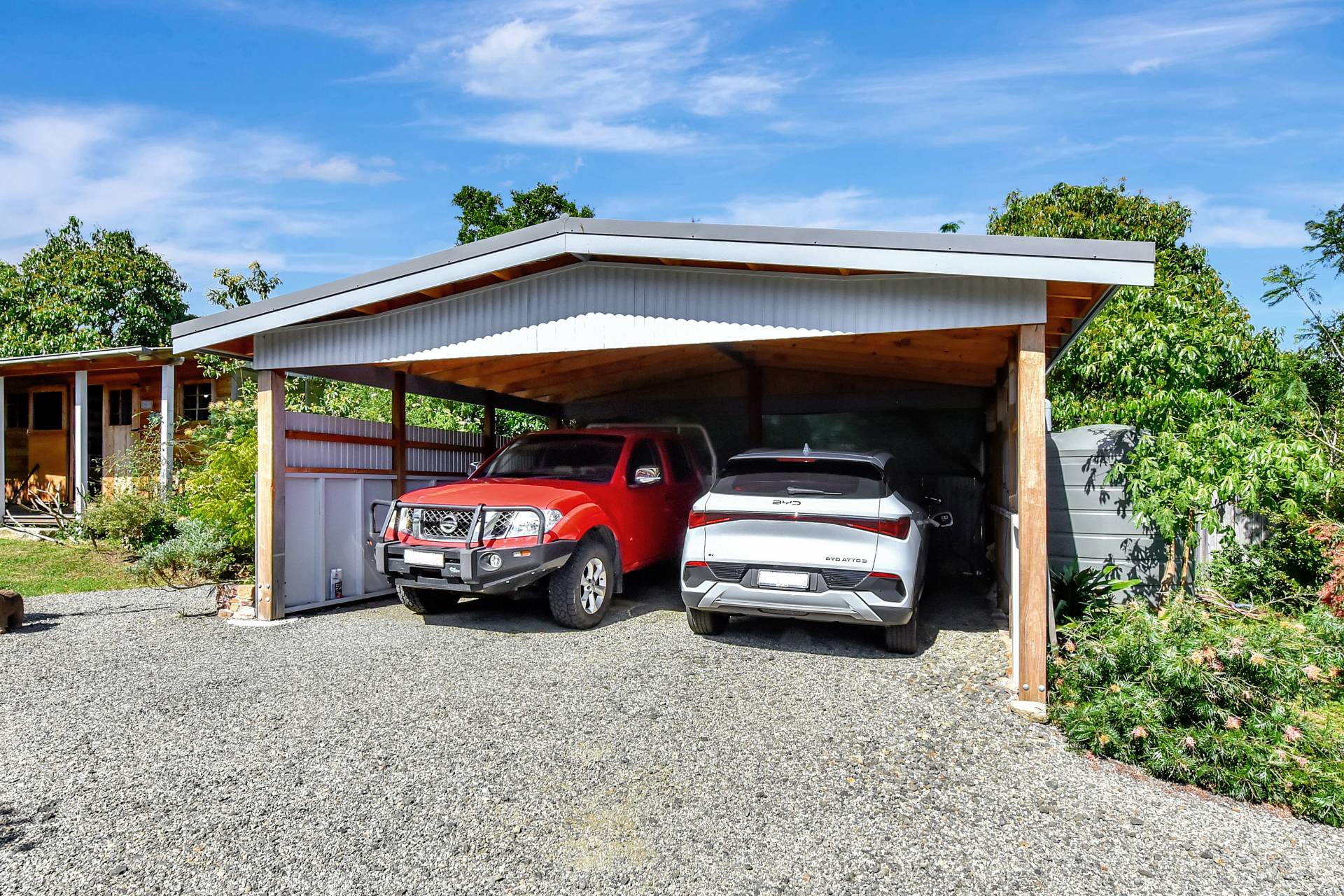 A separate studio building offers flexible use as an artist’s retreat, home business, or extra accommodation. A double carport near the main entry includes an electric vehicle charging point powered by the solar system — providing sustainable, cost-free travel.