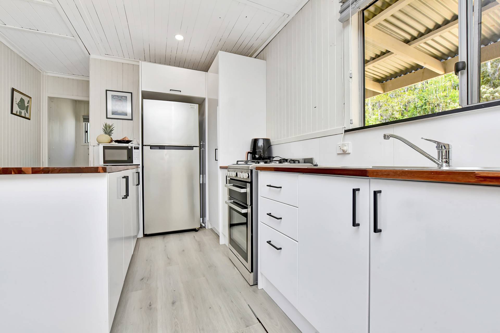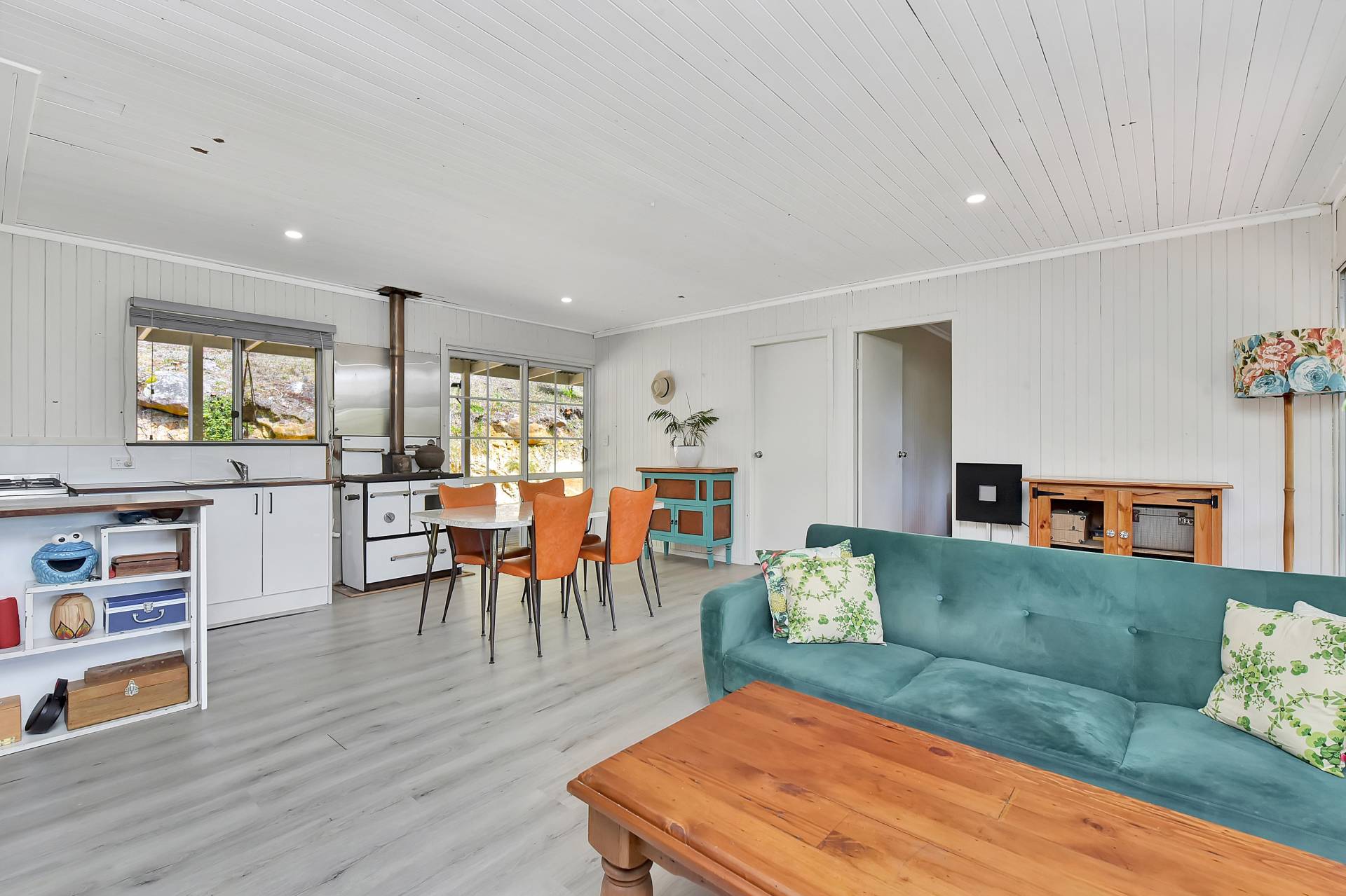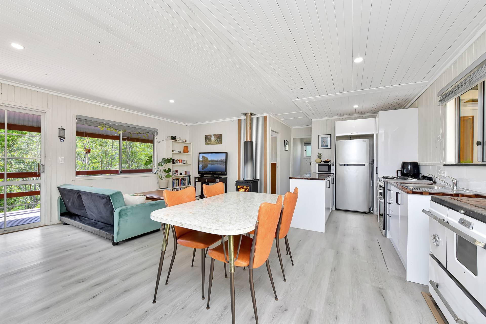 The eco-friendly house is fully self-sufficient with solar power, gas cooking & gas hot water. The open plan renovated kitchen is fitted with a gas stove and adjoins a spacious living area, featuring a slow combustion fireplace for the winter months. The home comprises three bedrooms, a renovated bathroom and has plenty of potential to expand if needed in the future.