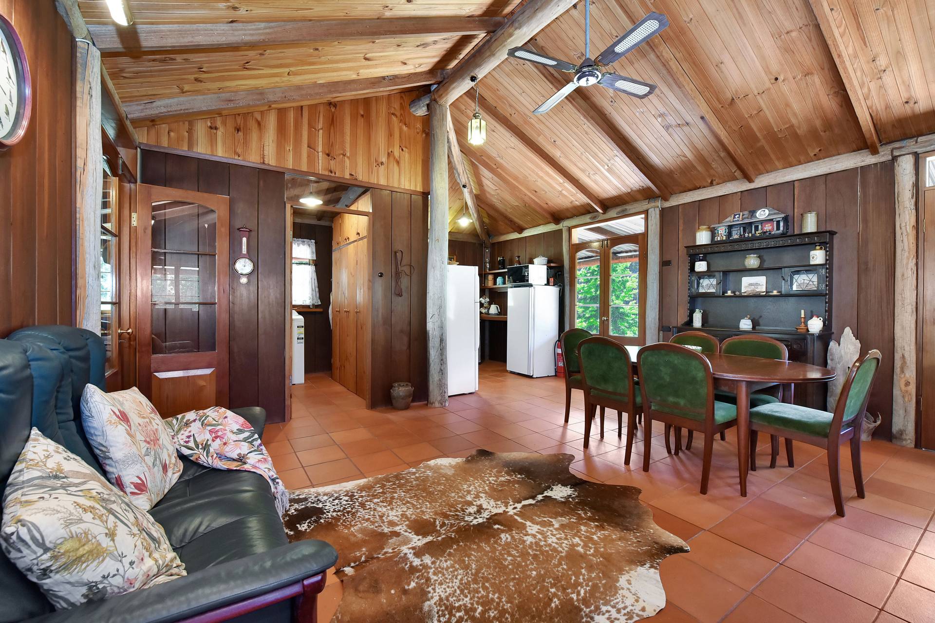 Inside, the open-plan living, dining, and kitchen area is warm and inviting, centred around a striking sandstone fireplace. High ceilings and large windows create a bright, spacious feel, while tiled floors throughout make country living easy and low maintenance. The generous bedroom features a ceiling fan and plenty of natural light, and the adjoining bathroom includes a convenient combined laundry.