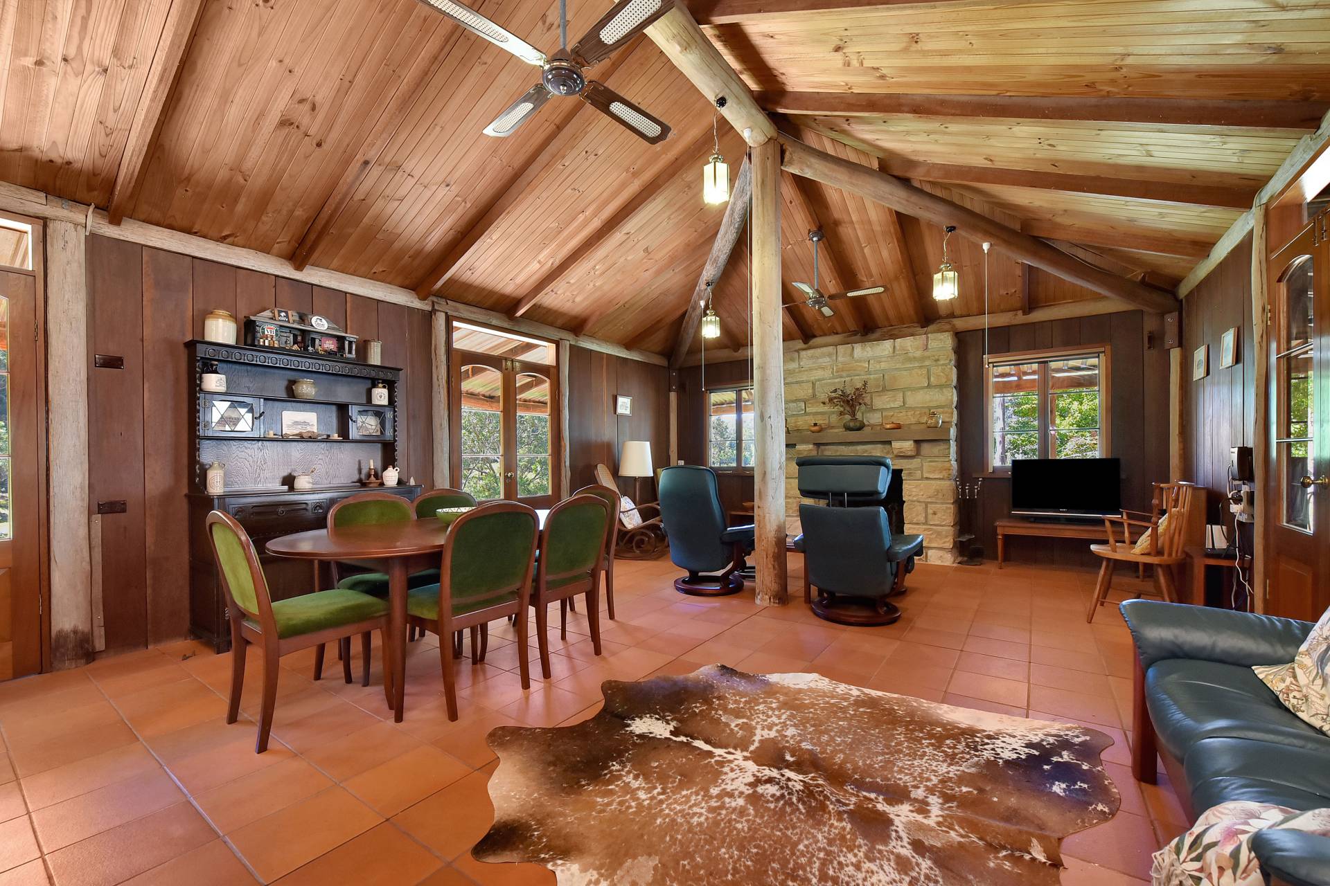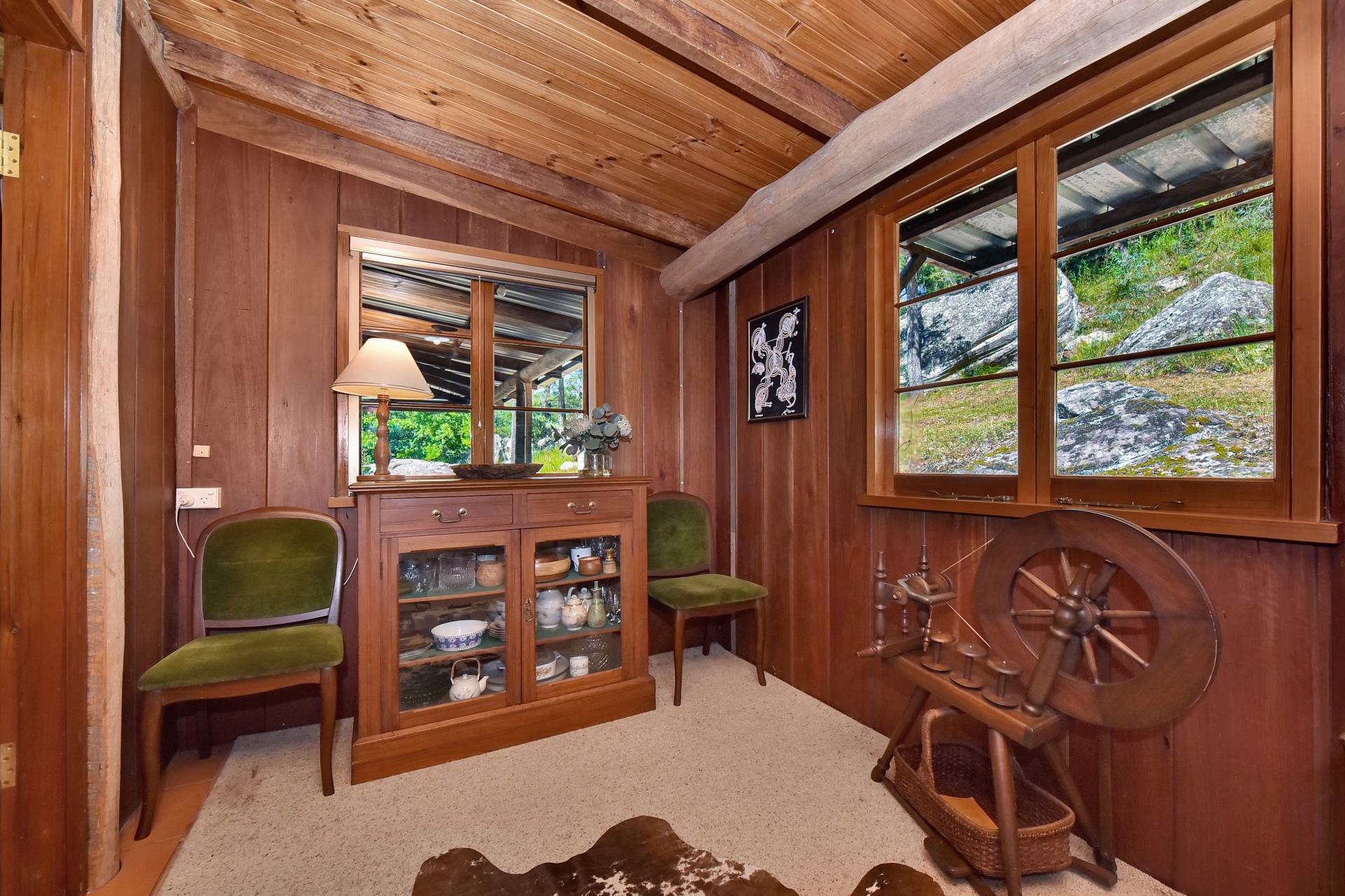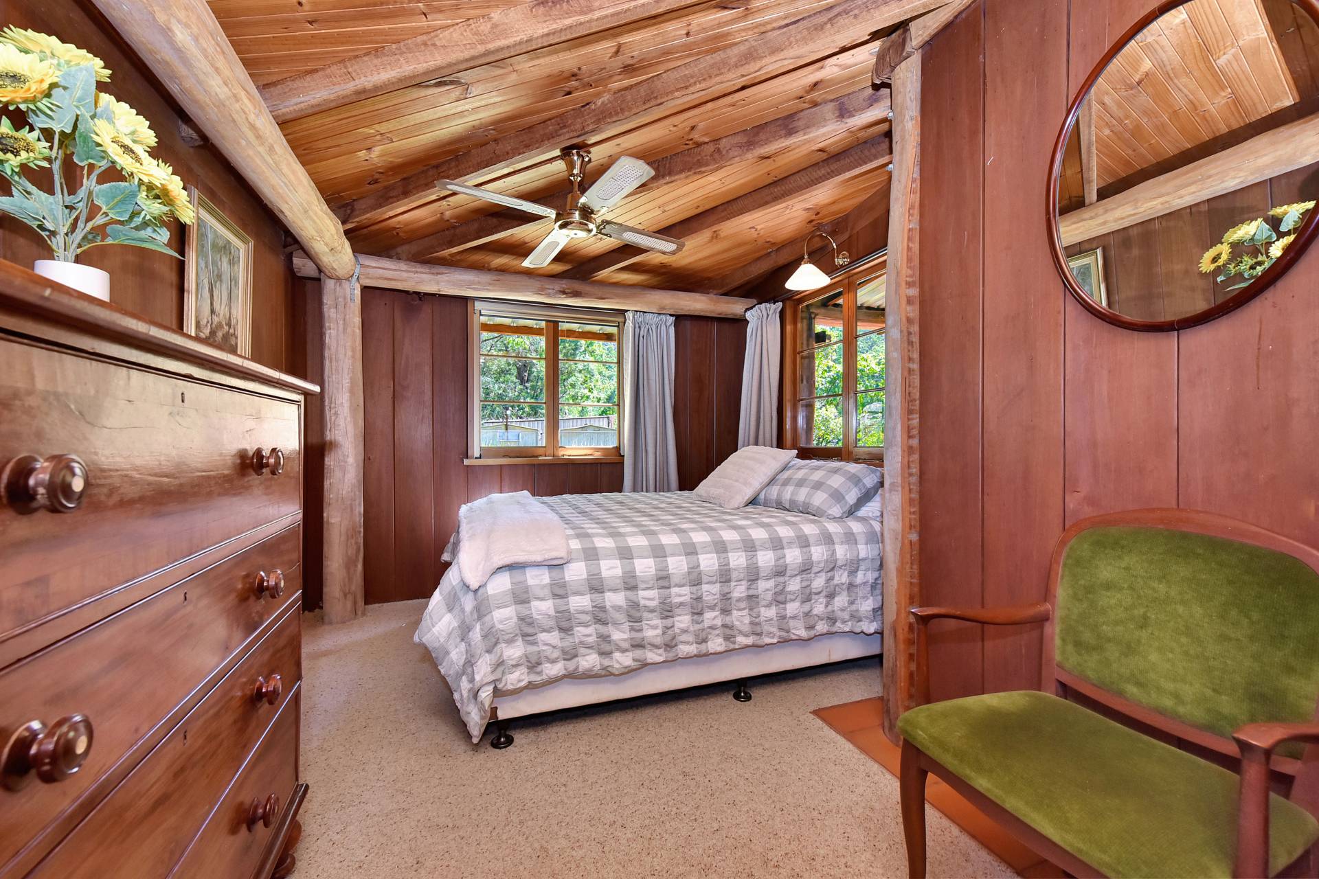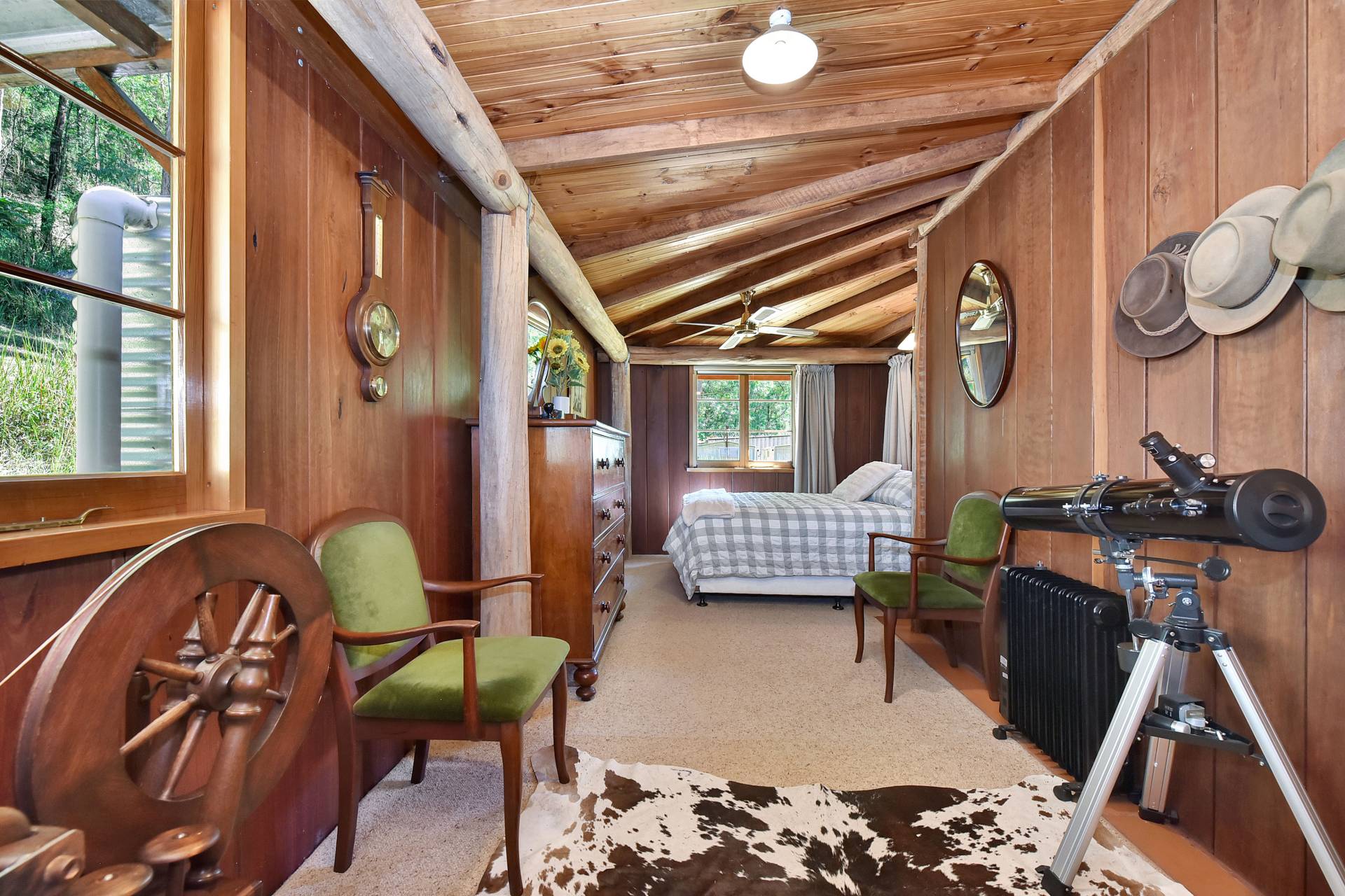 The beautifully crafted timber home radiates rustic Australiana charm, complete with a wraparound verandah that captures sweeping valley views and overlooks the rolling paddocks below. Built with traditional timber slab construction, this home’s timeless design makes it ideal as a serene weekend getaway or a permanent country residence for those seeking a slower, more relaxed lifestyle.