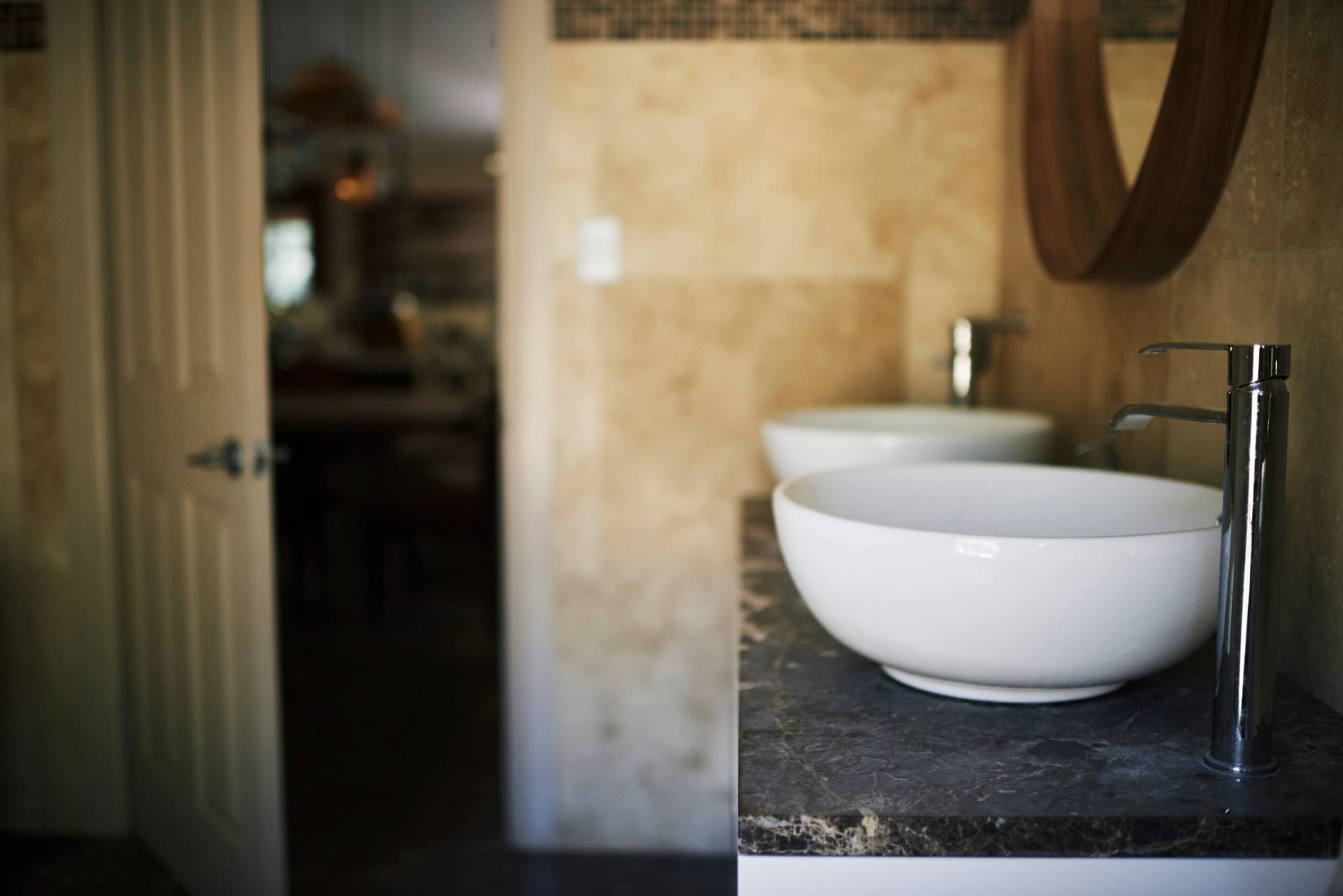 • Floor to ceiling tiles, heated towel rack, marble top vanity